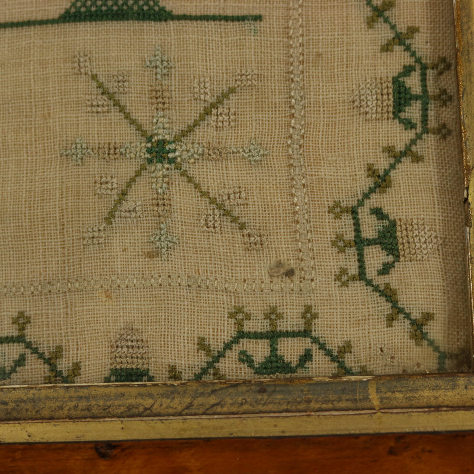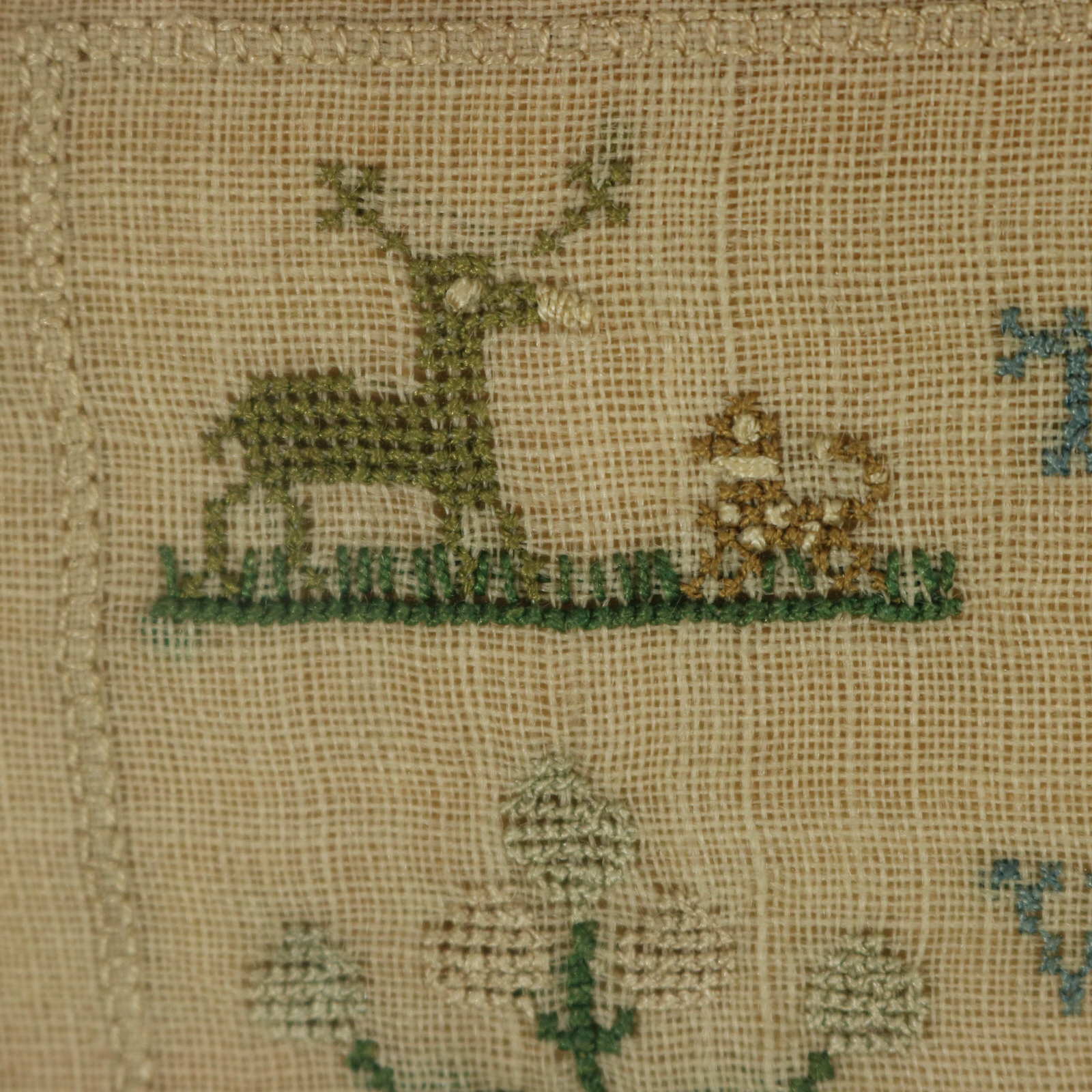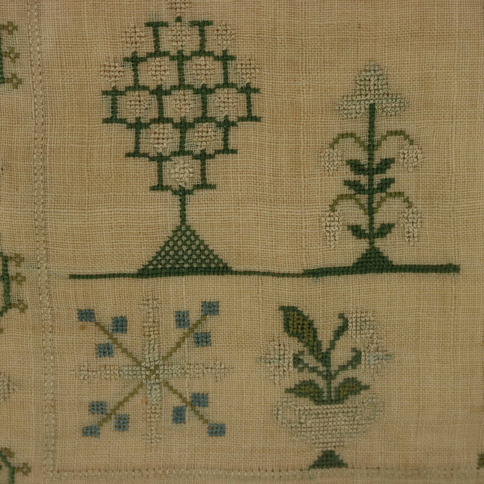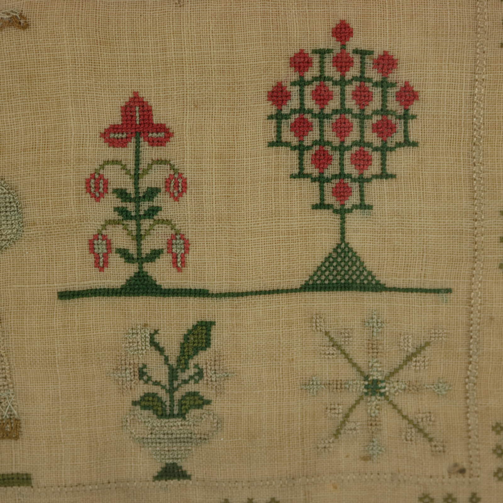 The sampler is worked in wool and silk threads on a linen ground, mainly in cross stitch.