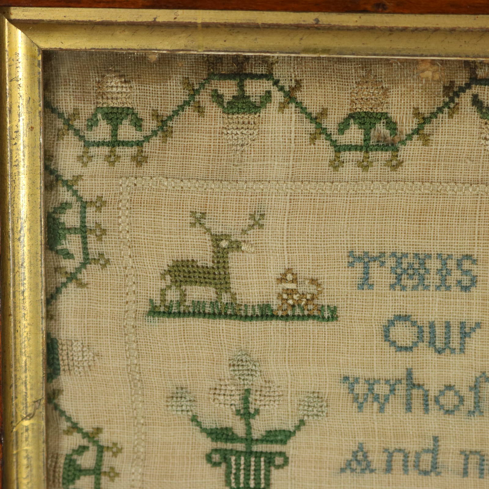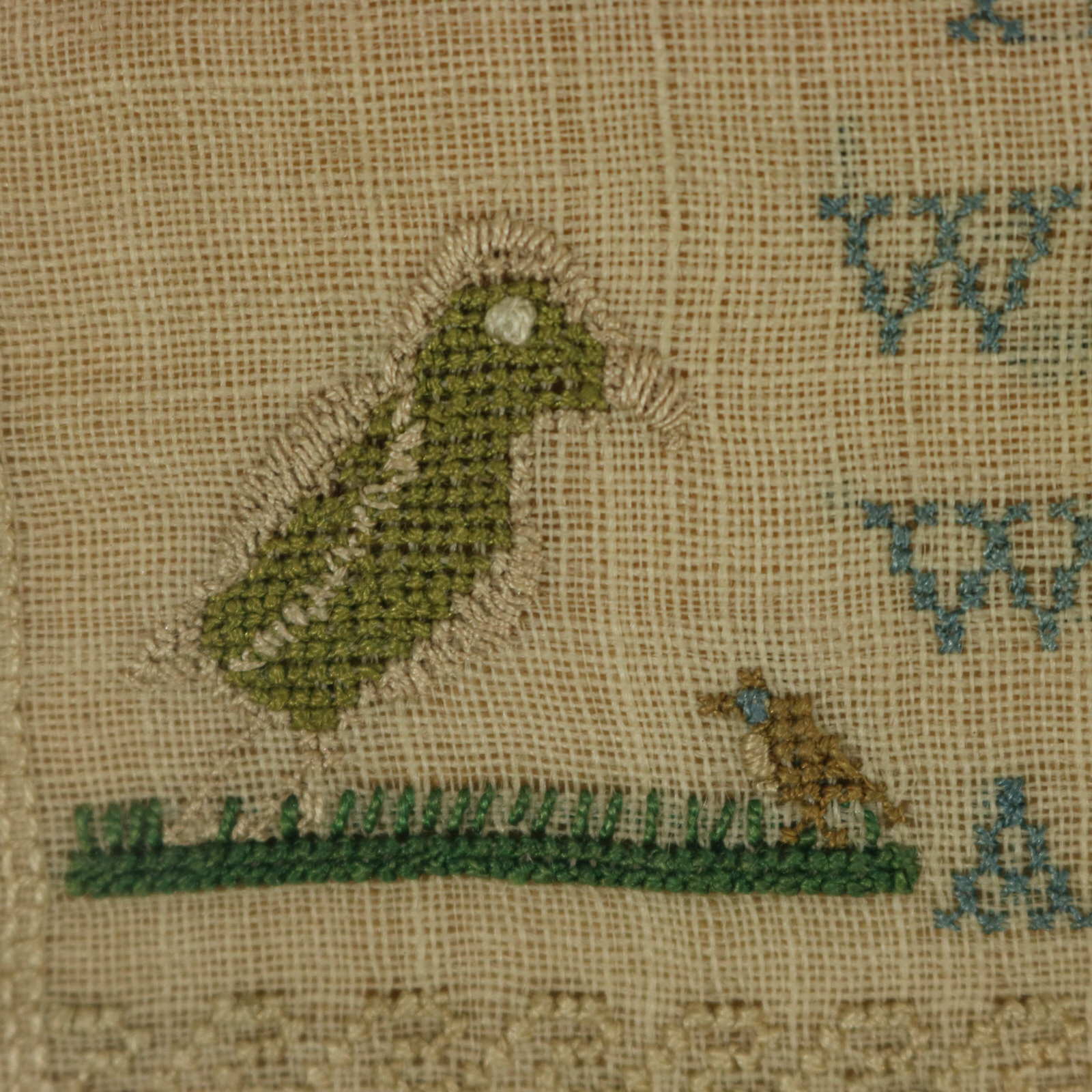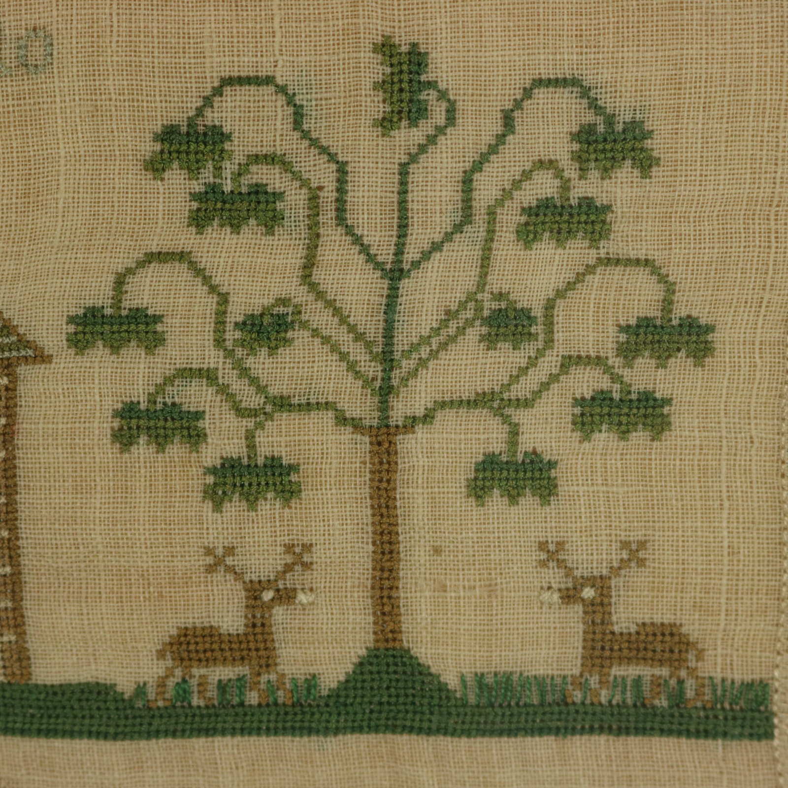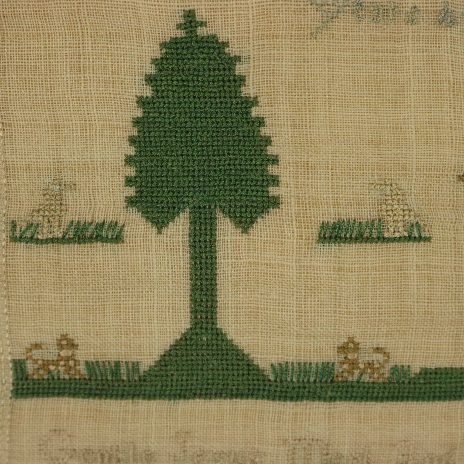 The sampler is worked in wool and silk threads on a linen ground, mainly in cross stitch.