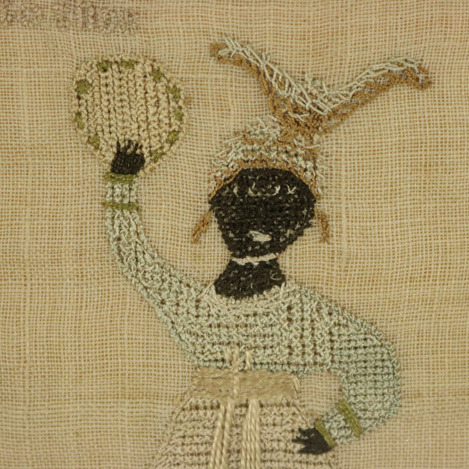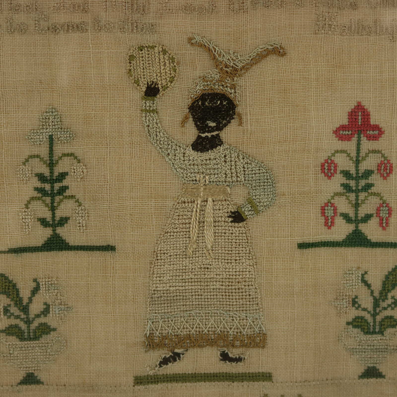 With this sampler being stitched in 1828, it might be a bit early for it to relate directly to this anti-slavery movement, though it is possible. Another explaination is that the figure is theatrical.