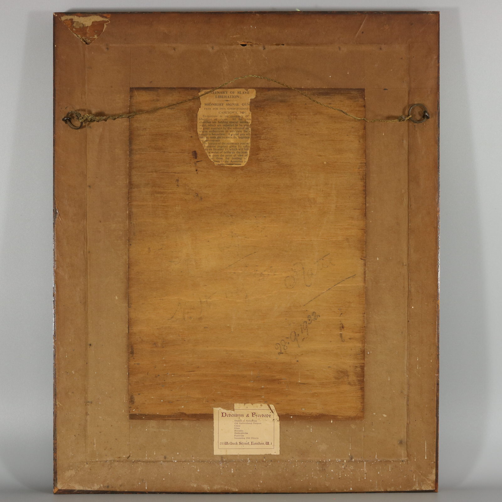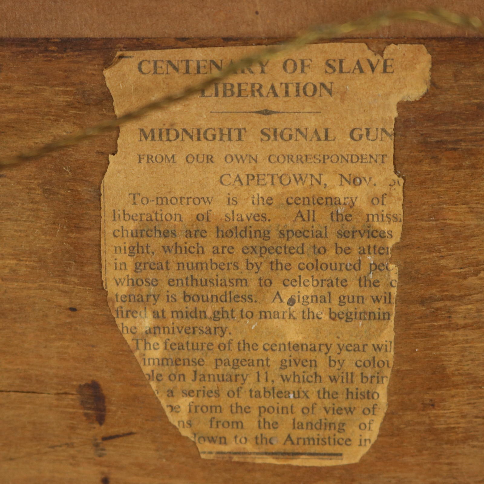A newspaper cutting attached to the reverse of the sampler, entitled 'CENTENARY OF SLAVE LIBERATION', describes a forthcoming celebration of the centenary of the liberation of slaves. The cutting is almost certainly a reference to the passing of the Slavery Abolition Act in 1833, which came into effect on August 1, 1834. This act marked the legal end of slavery throughout most of the British Empire.