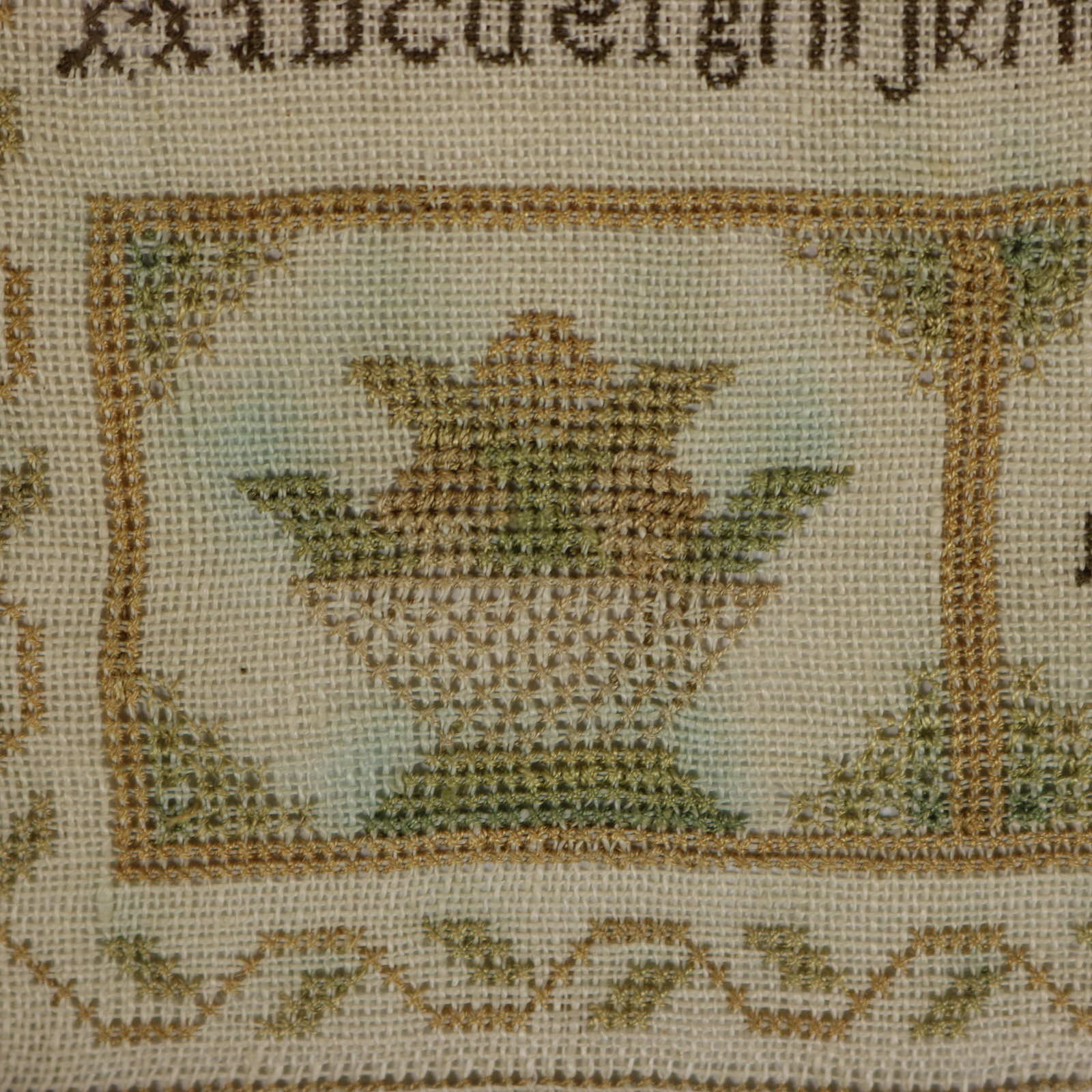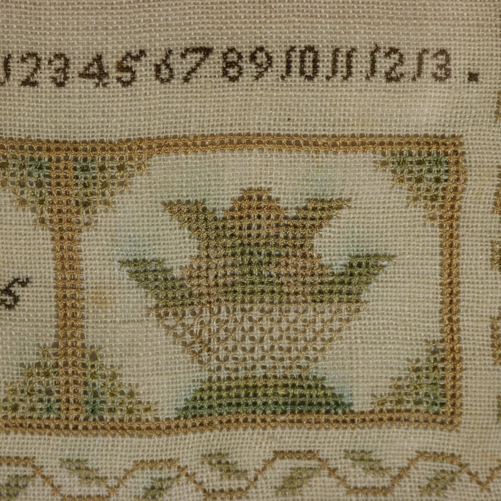The sampler is worked in silk threads on a linen ground, mainly in cross stitch.