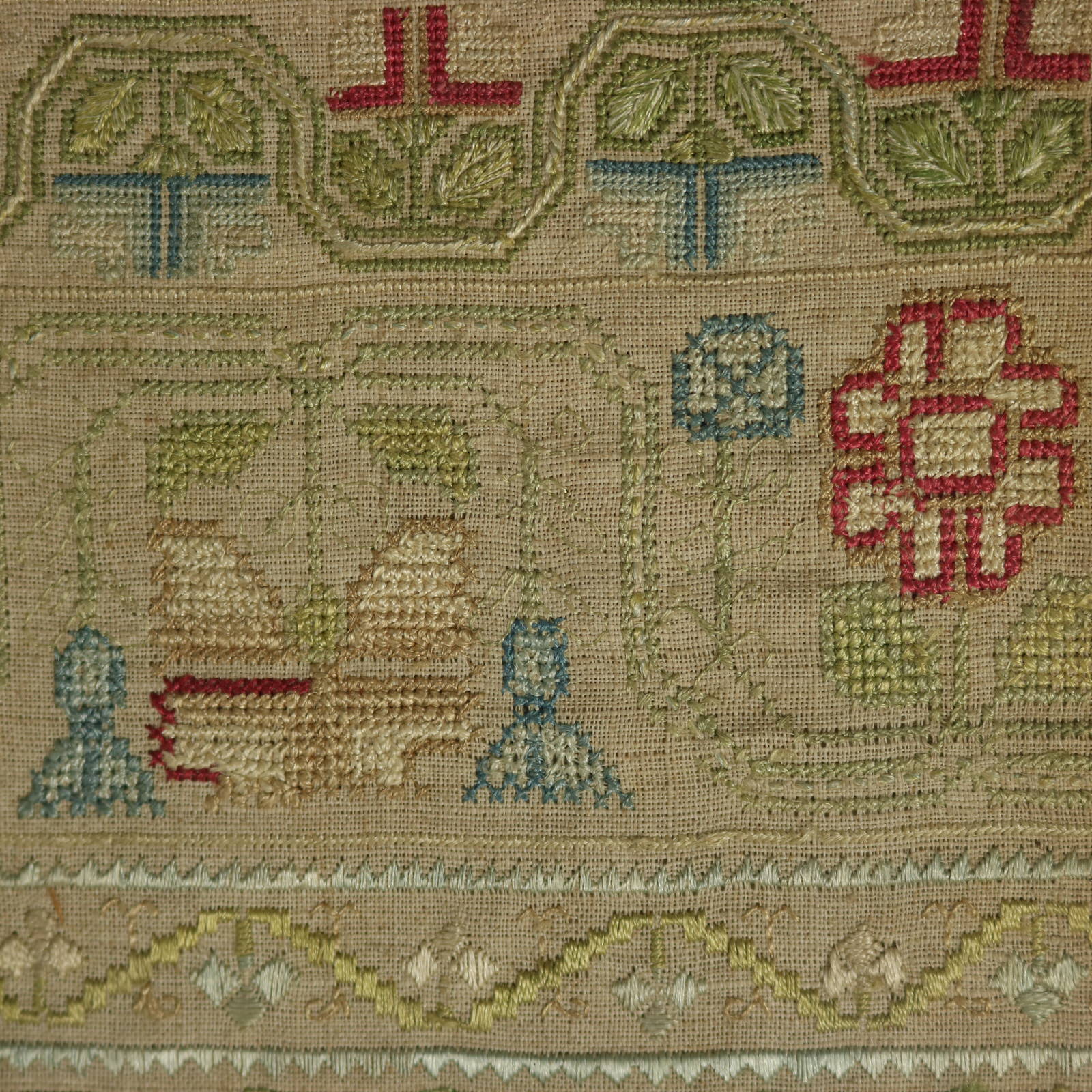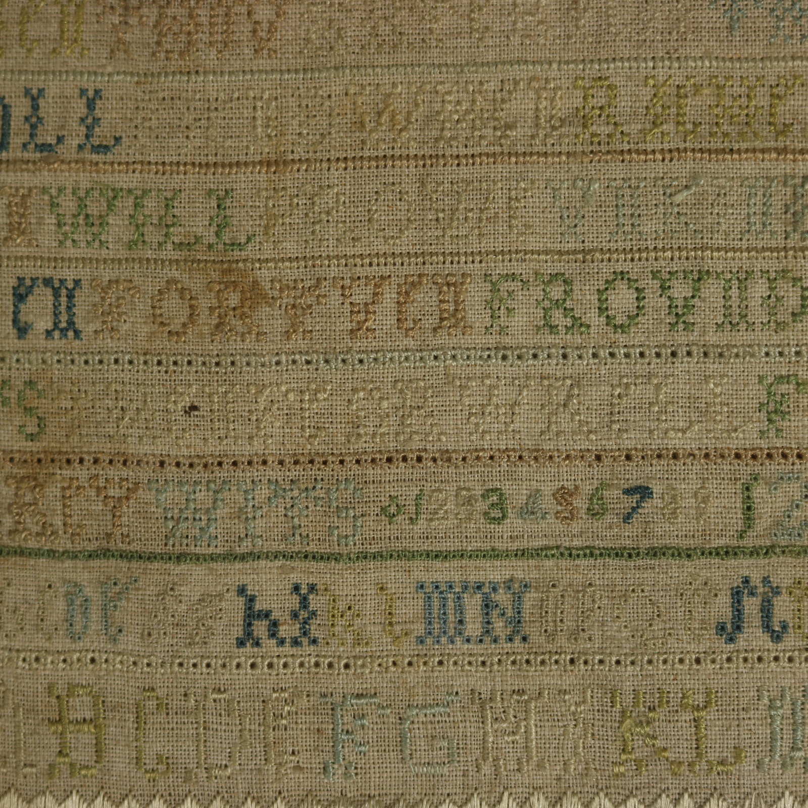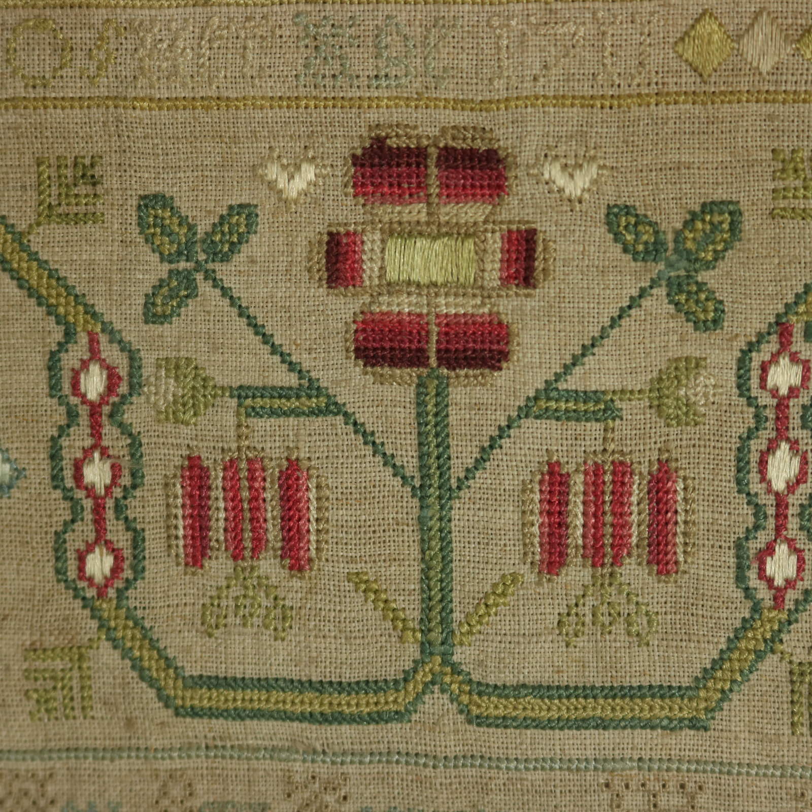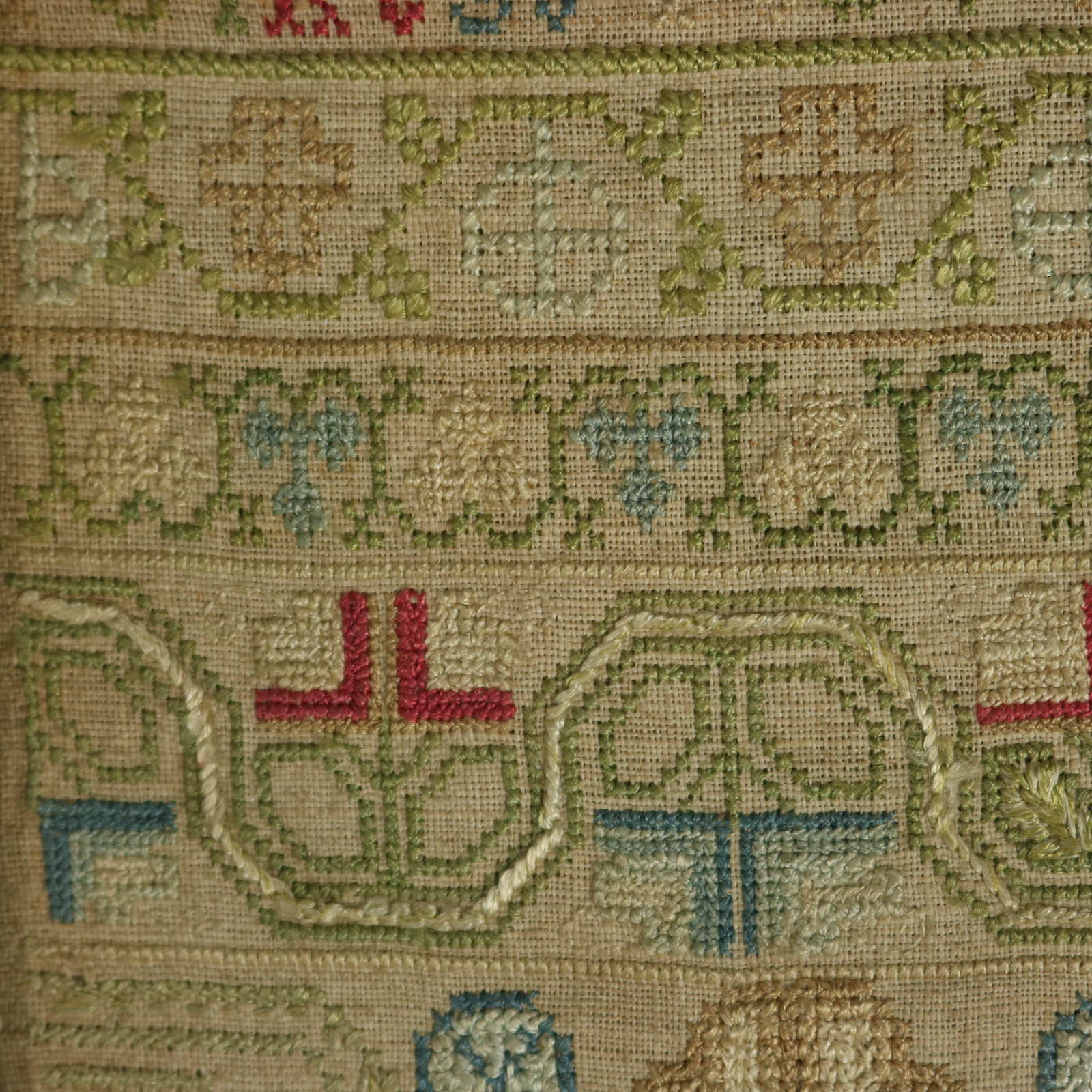 The sampler is worked in silk threads on a linen ground, in a variety of stitches.