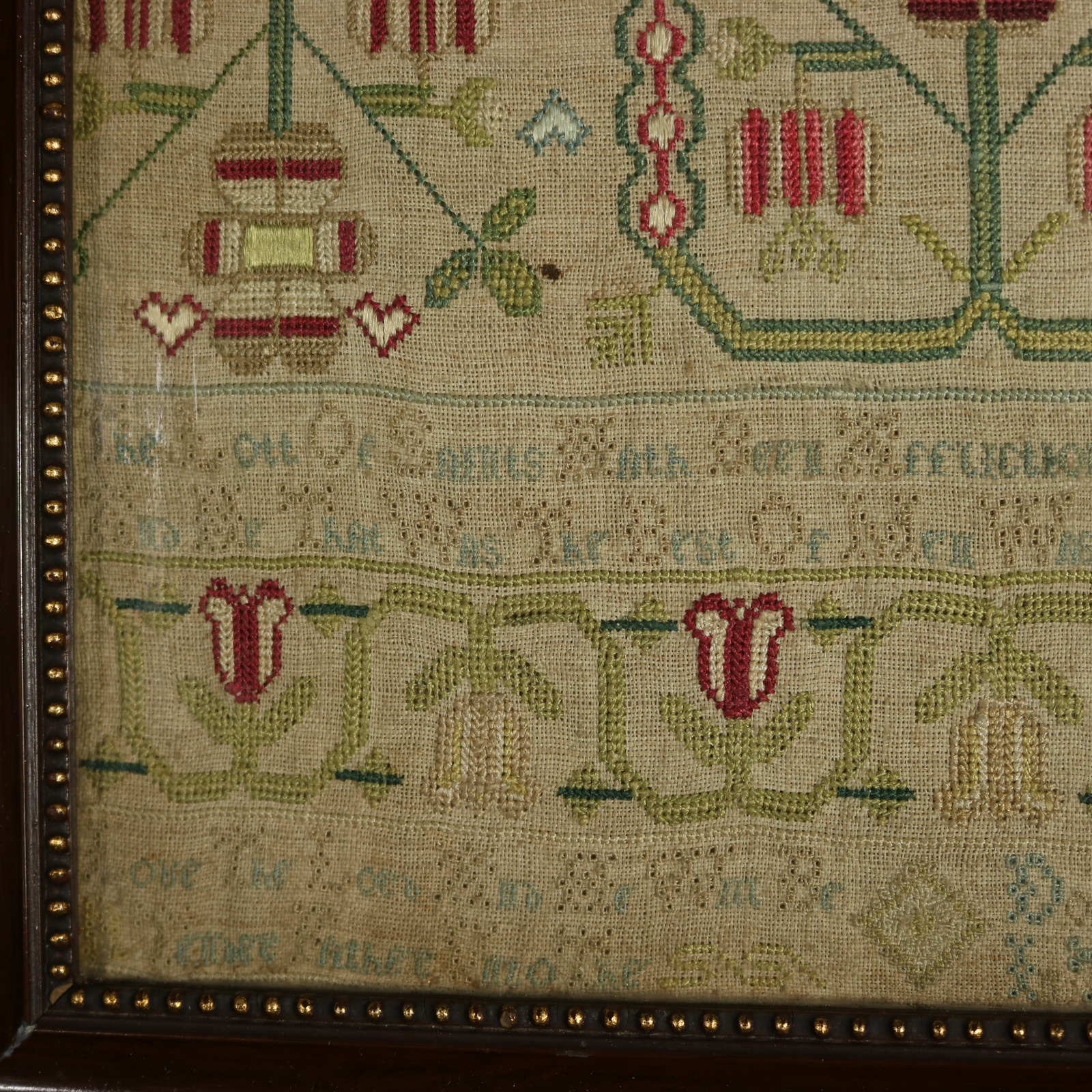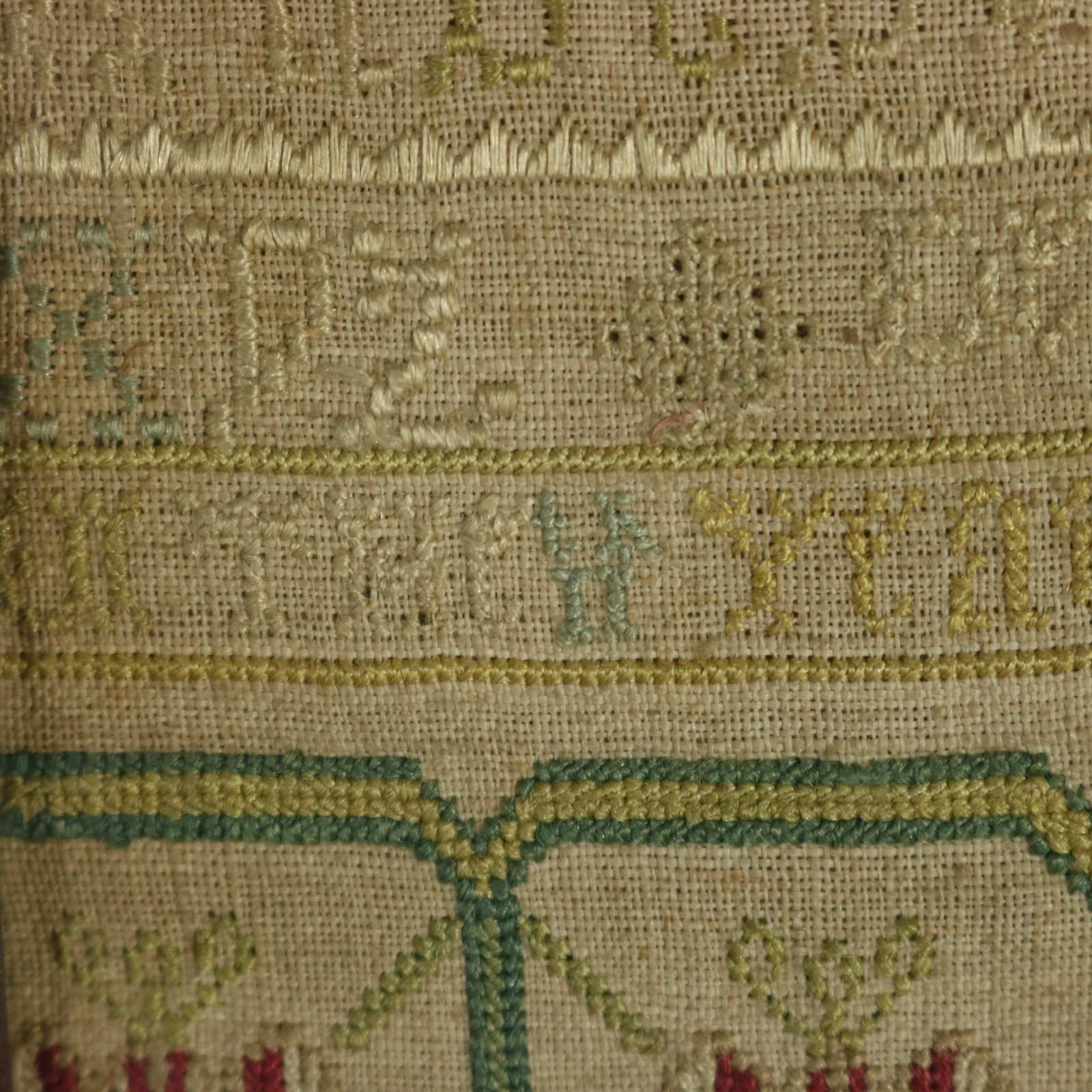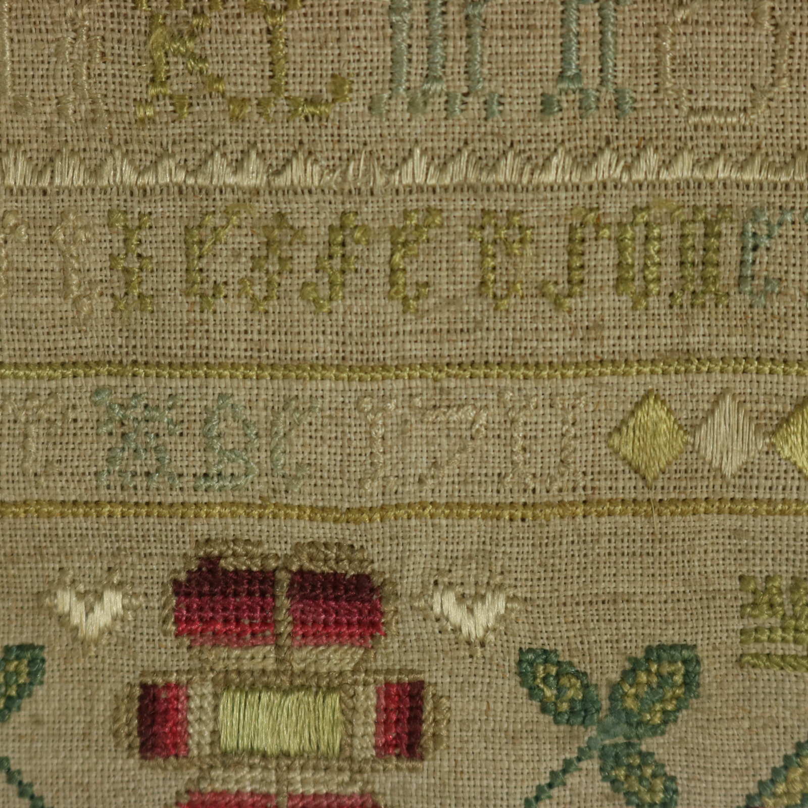 The sampler is worked in silk threads on a linen ground, in a variety of stitches.