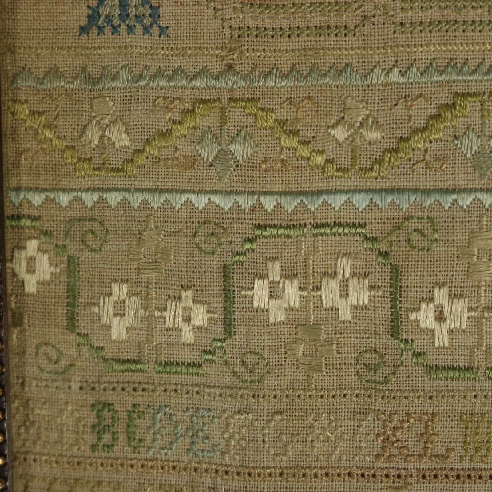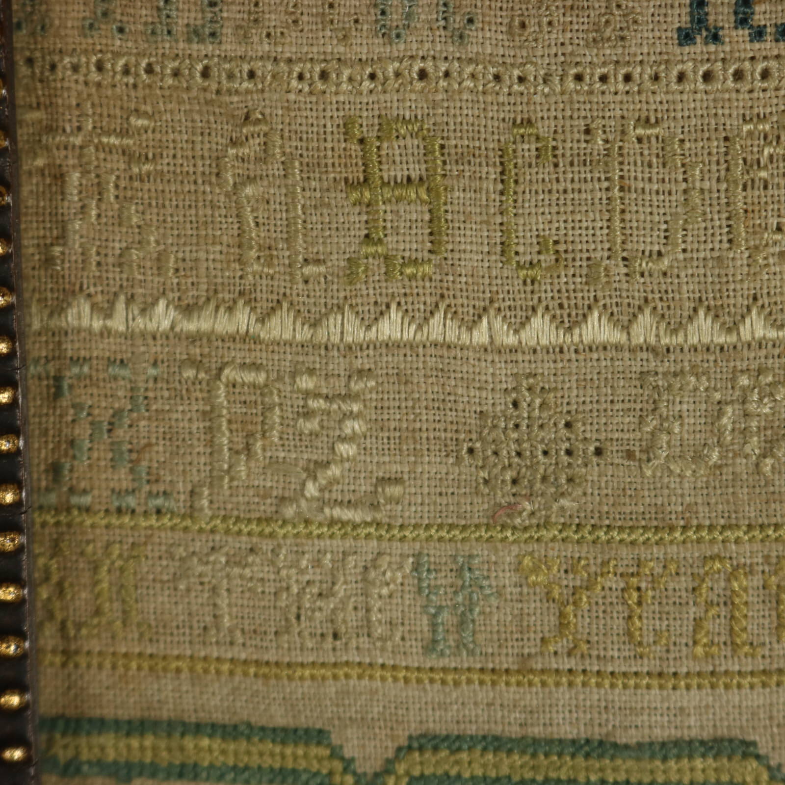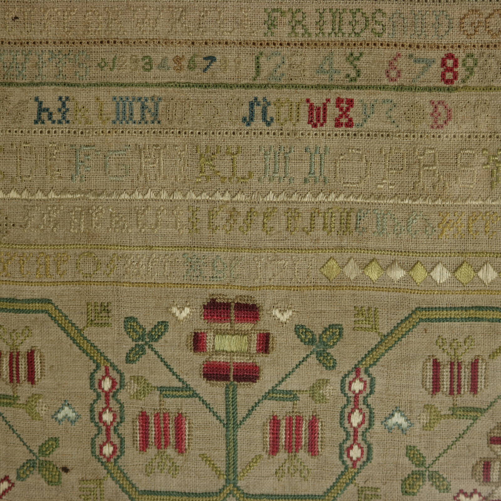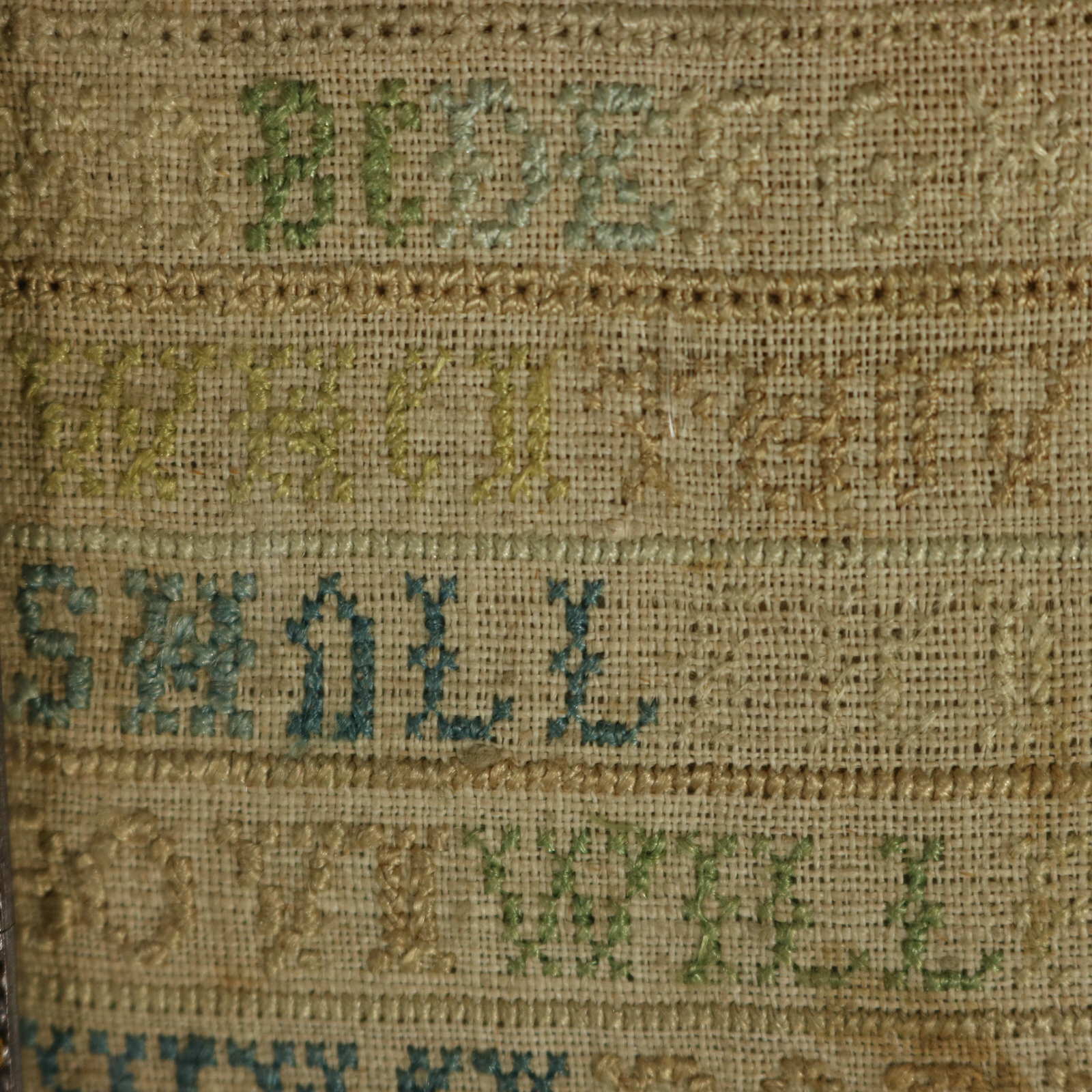 The sampler is worked in silk threads on a linen ground, in a variety of stitches.
