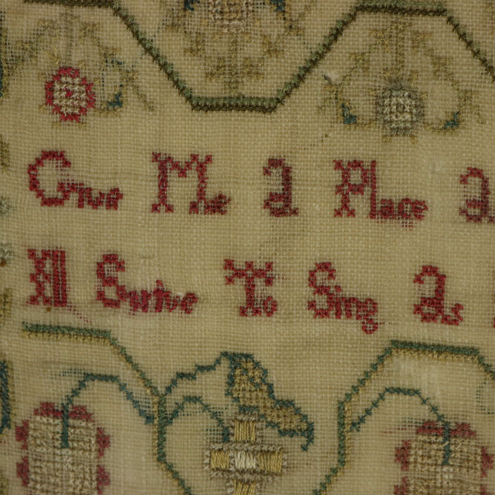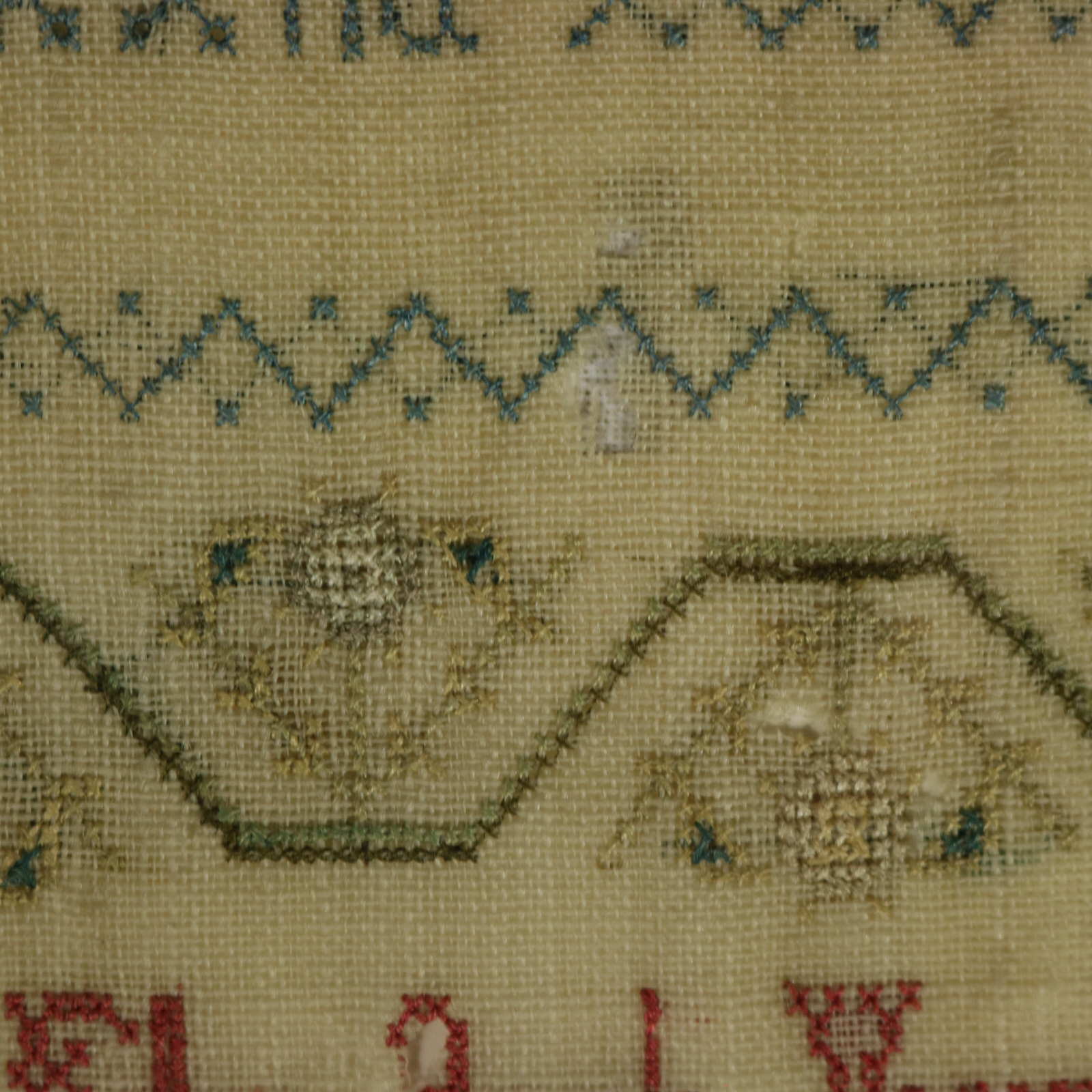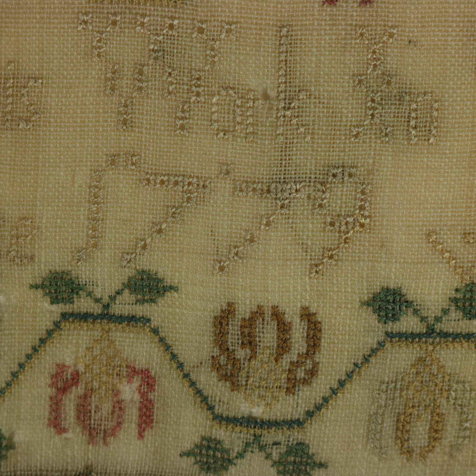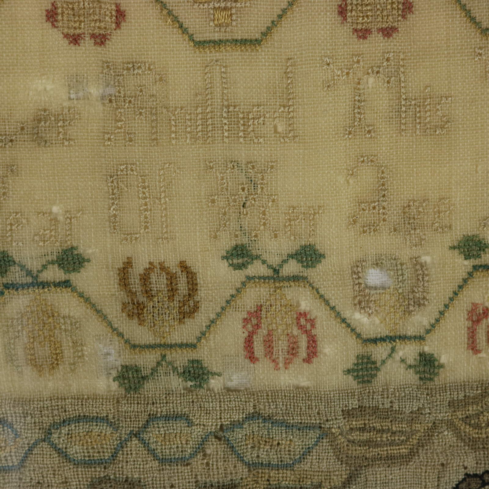 The sampler is worked in silk threads on a linen ground.