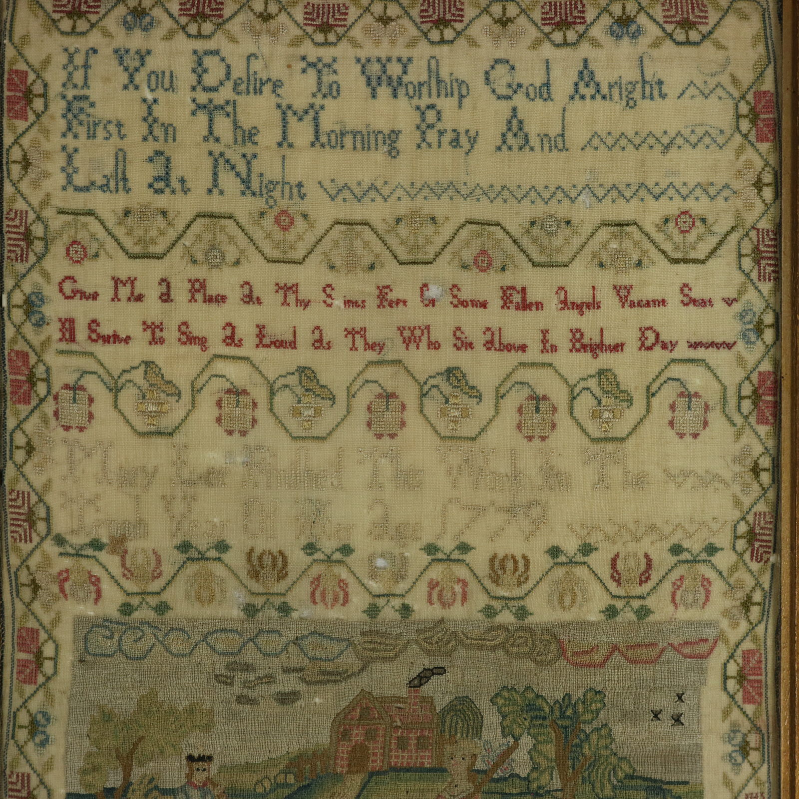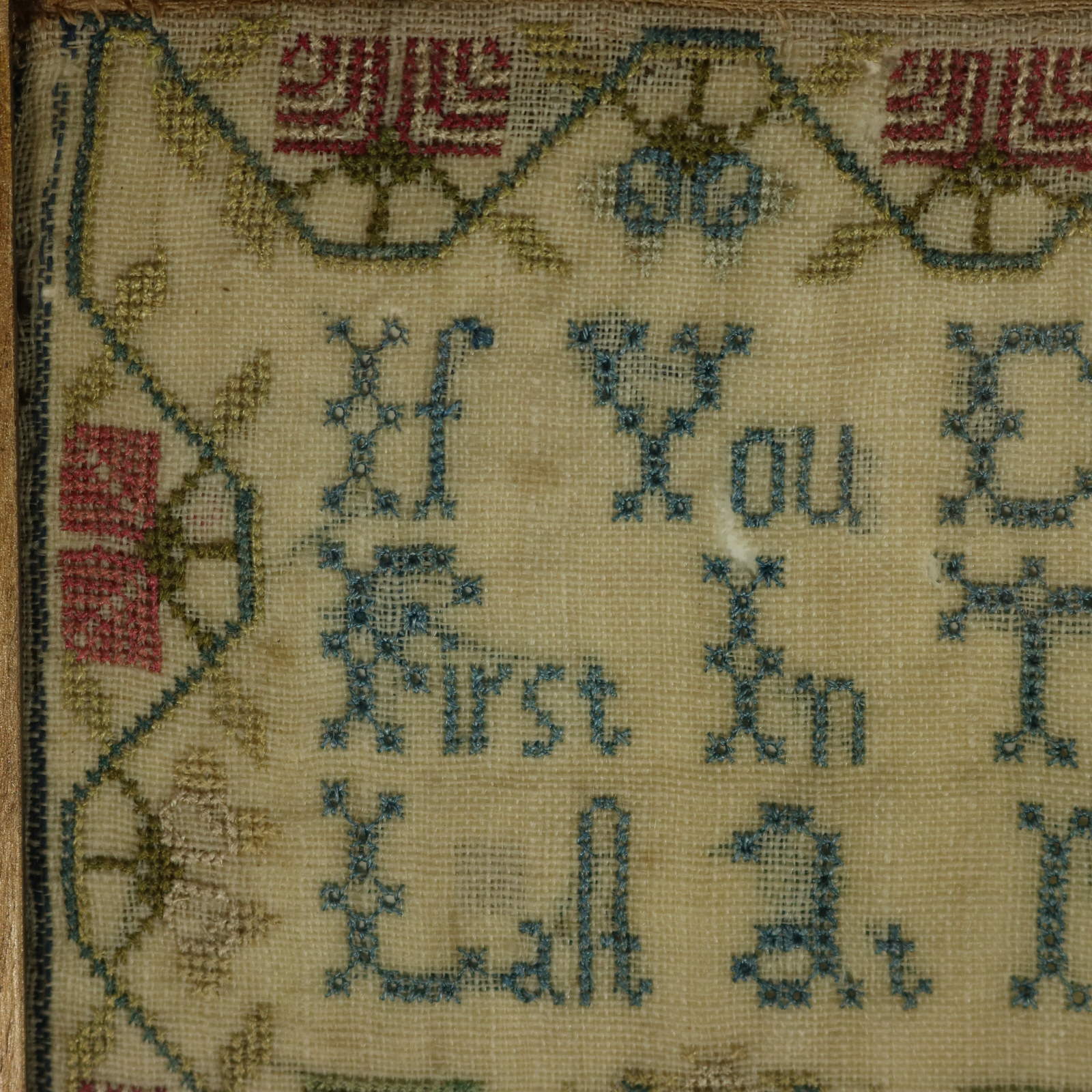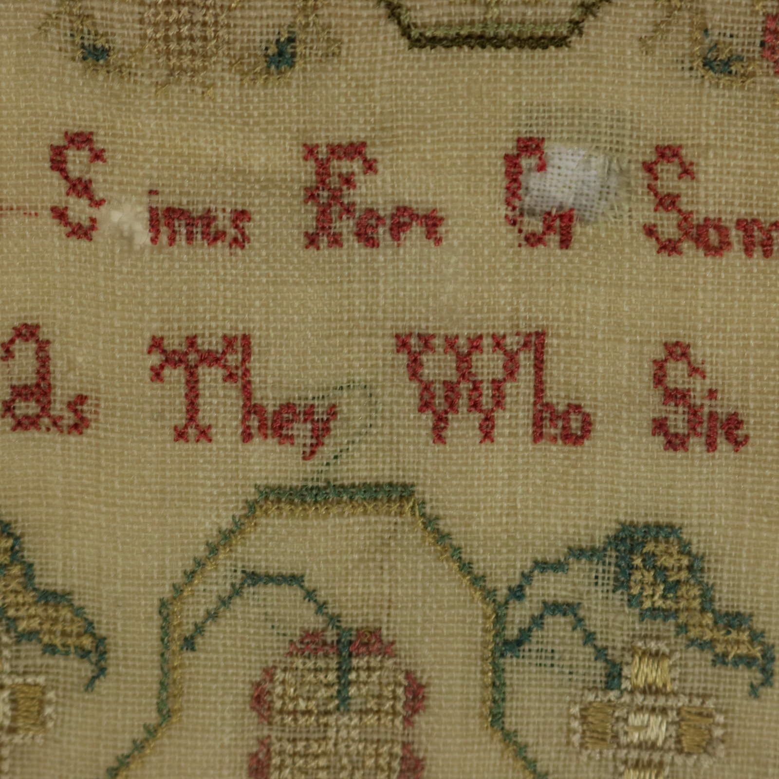 The sampler is worked in silk threads on a linen ground.