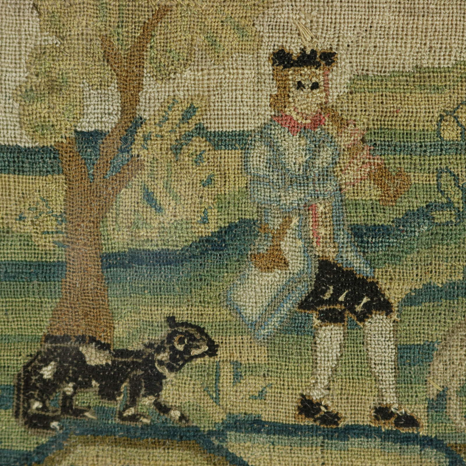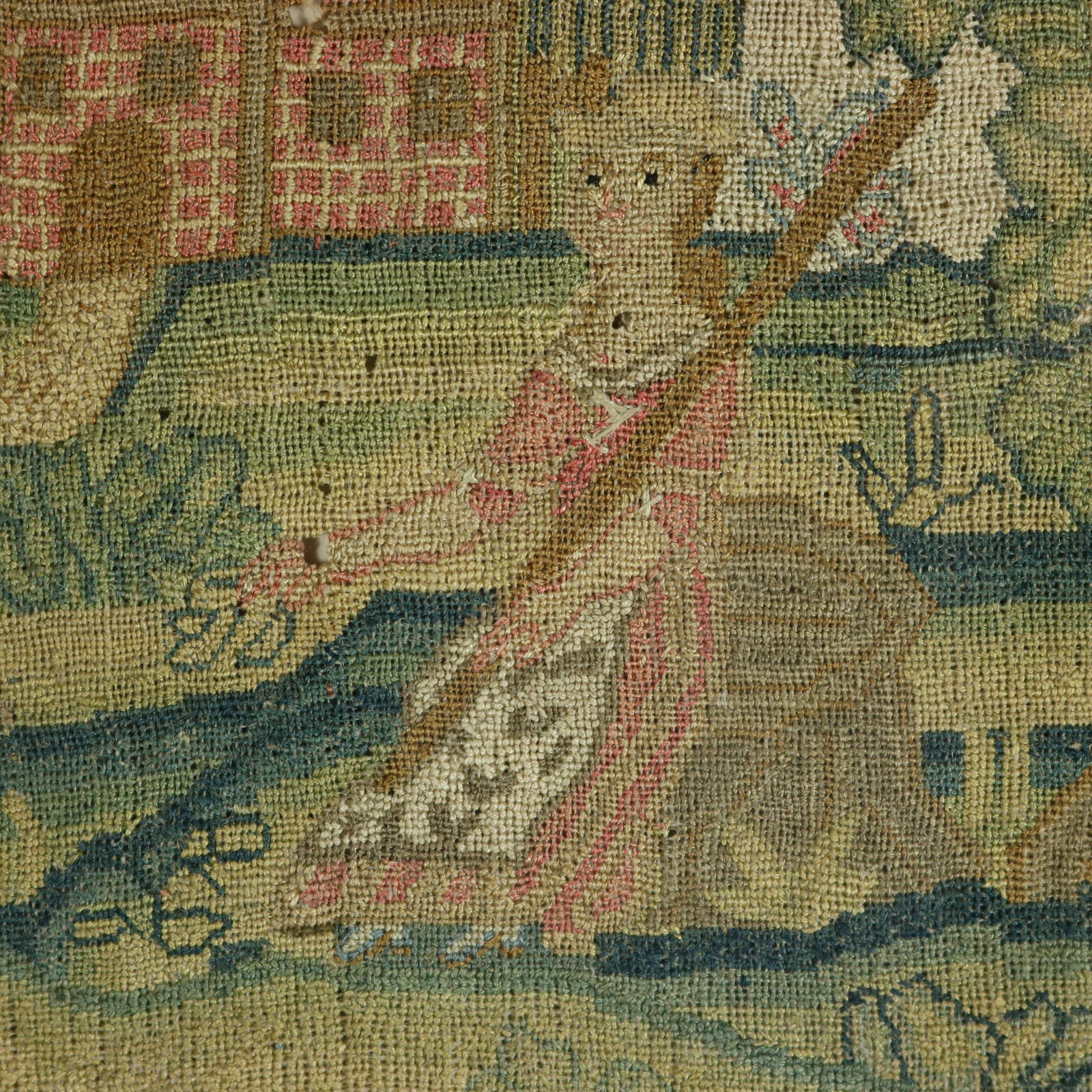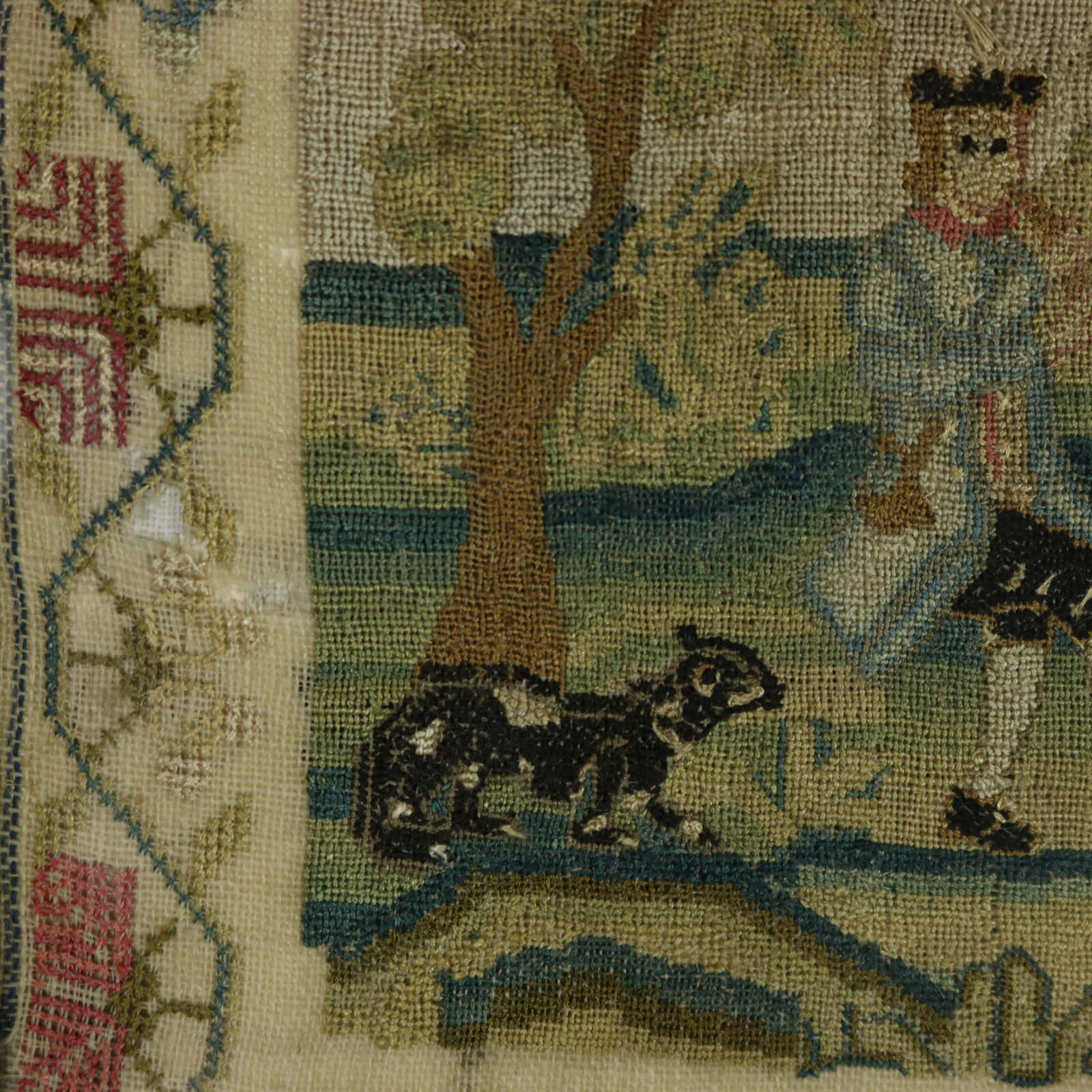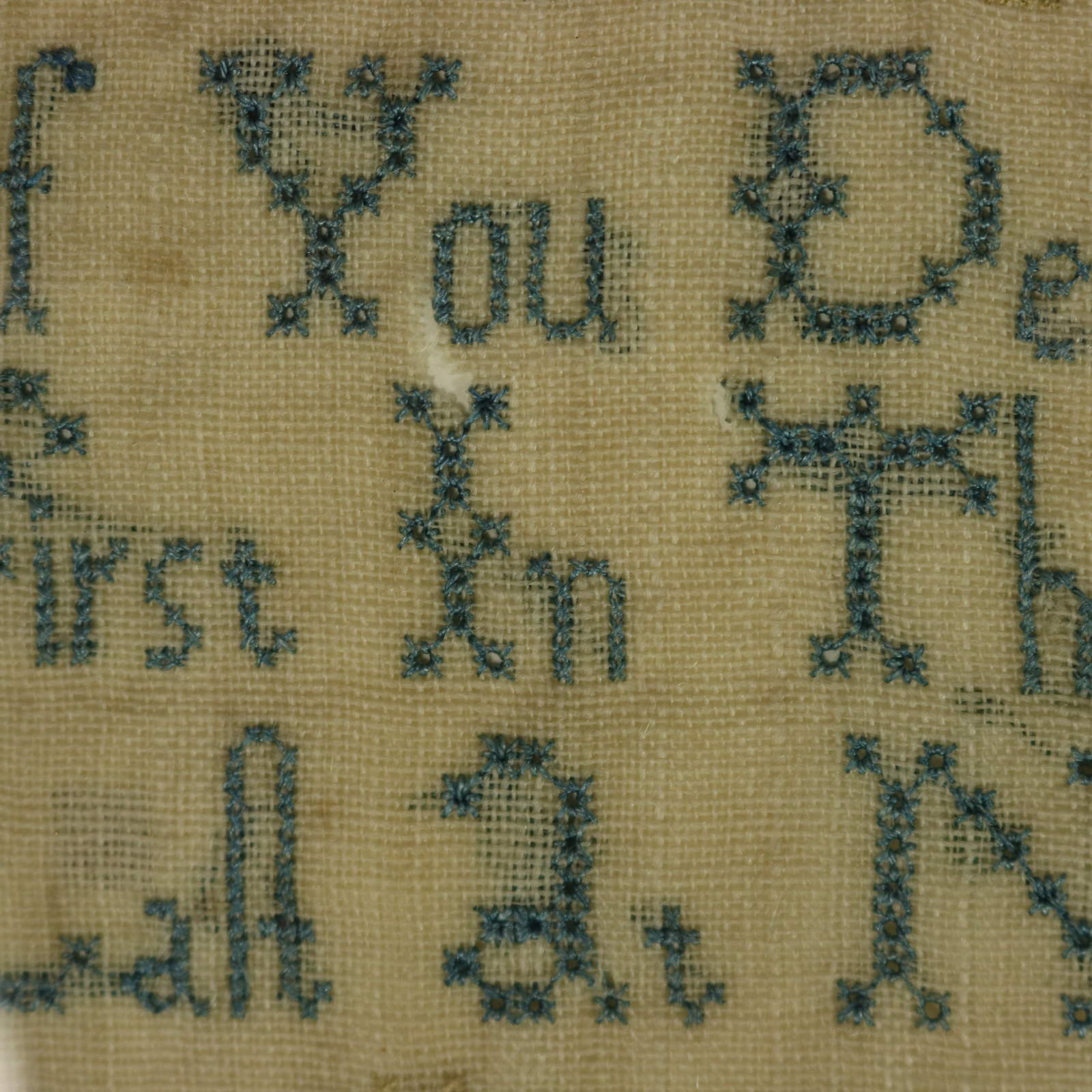 The sampler is worked in silk threads on a linen ground.