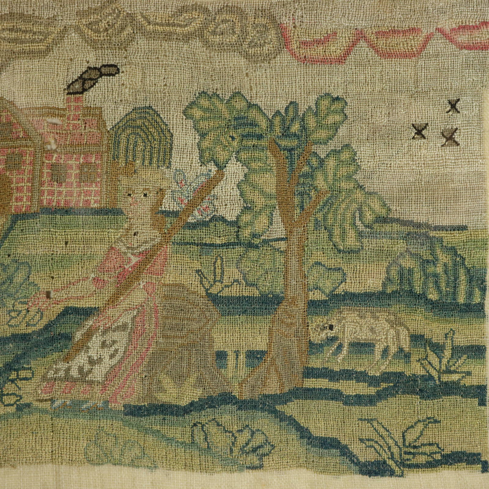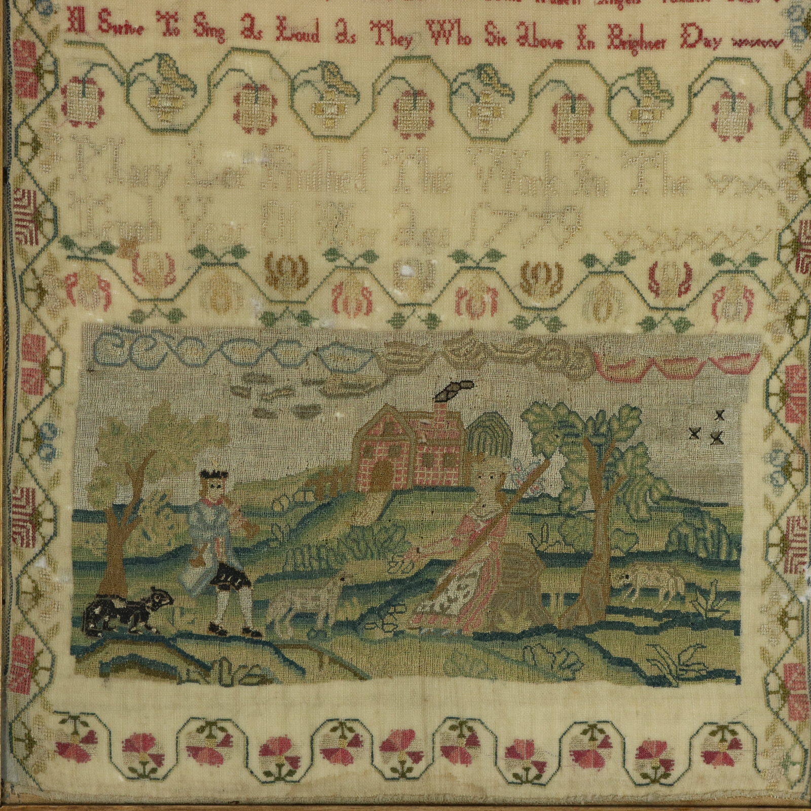 The sampler features a wonderful pictorial panel with a countryside theme.