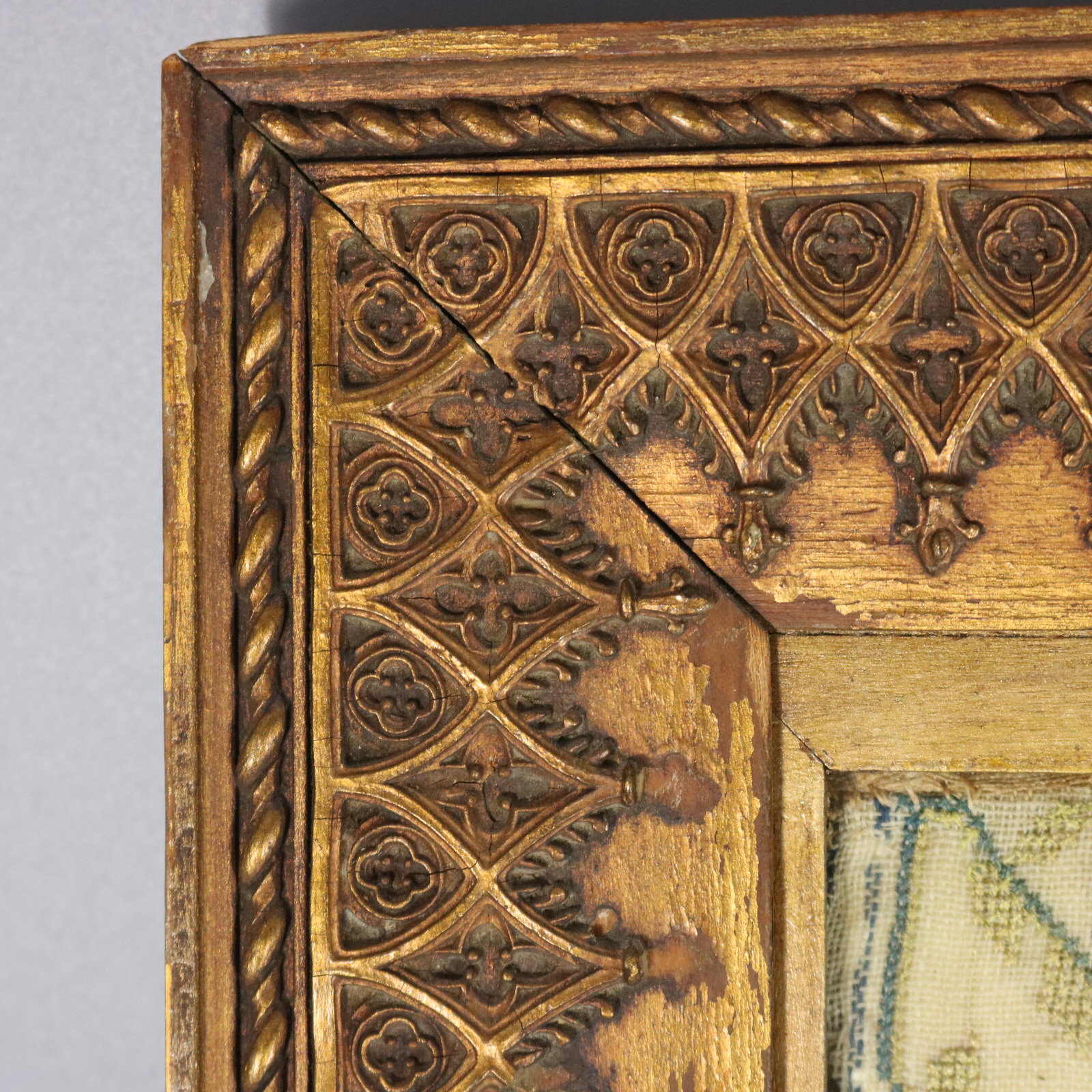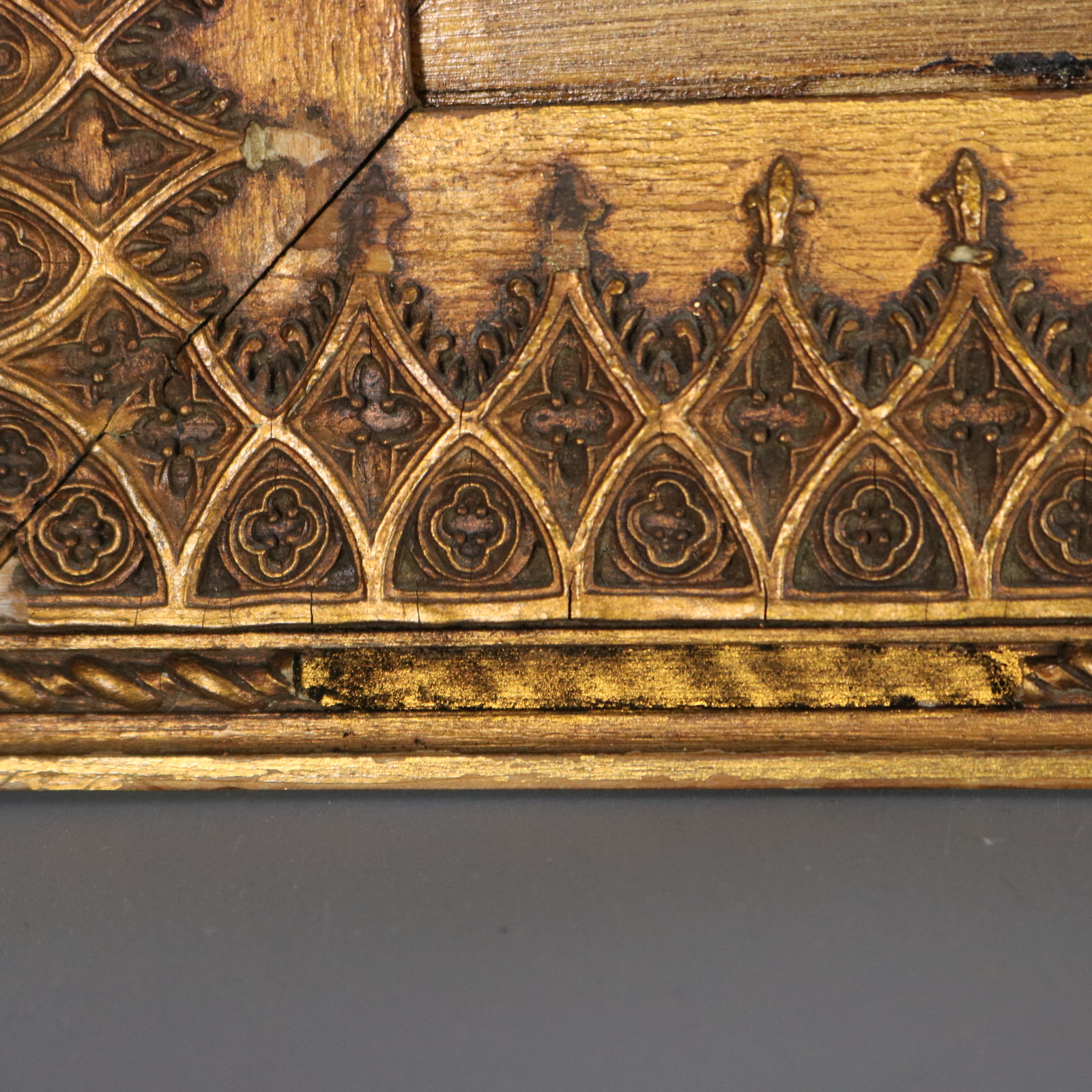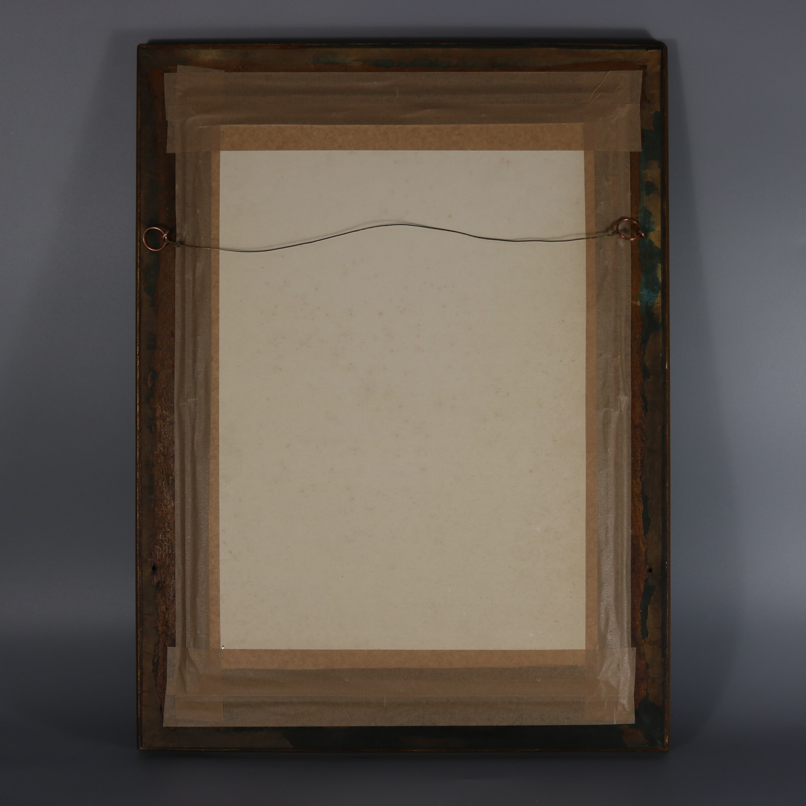 Framed in an old copper gilded wood frame with a geometric pattern.