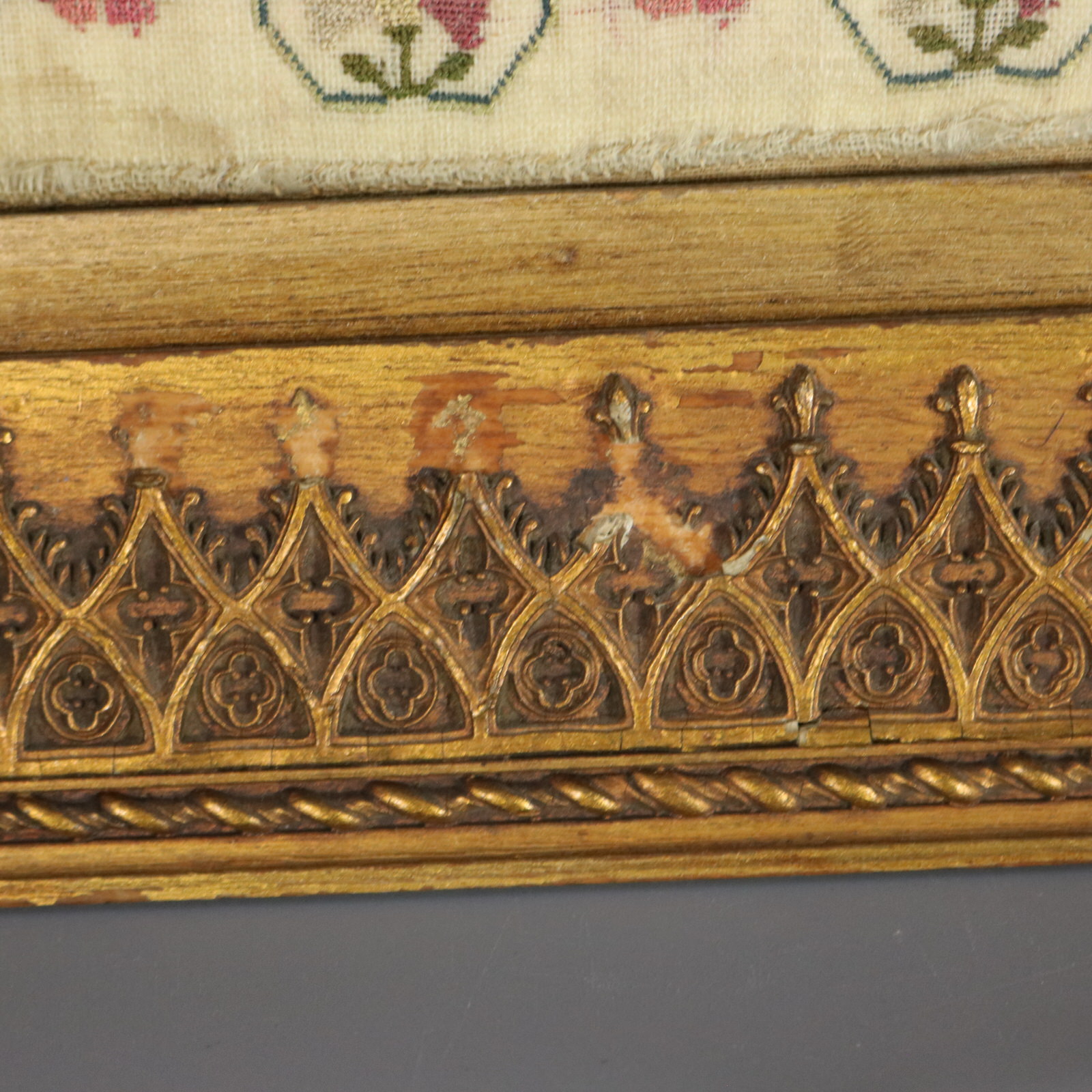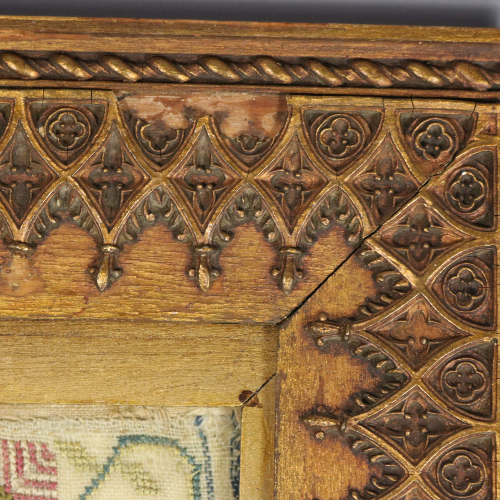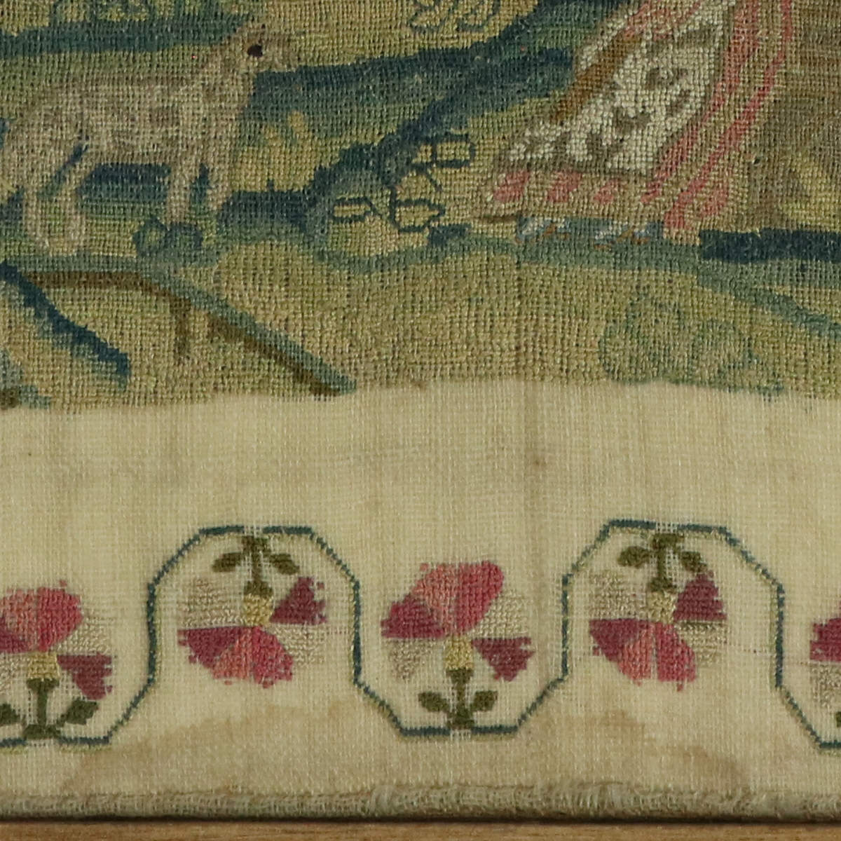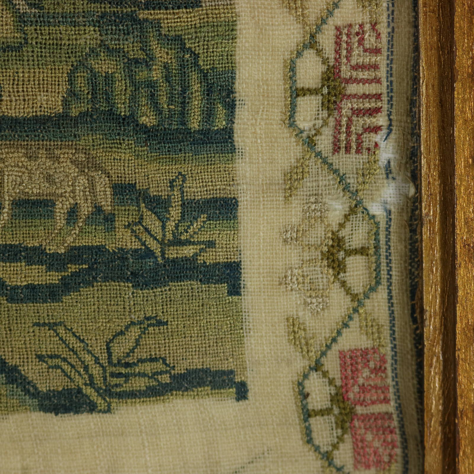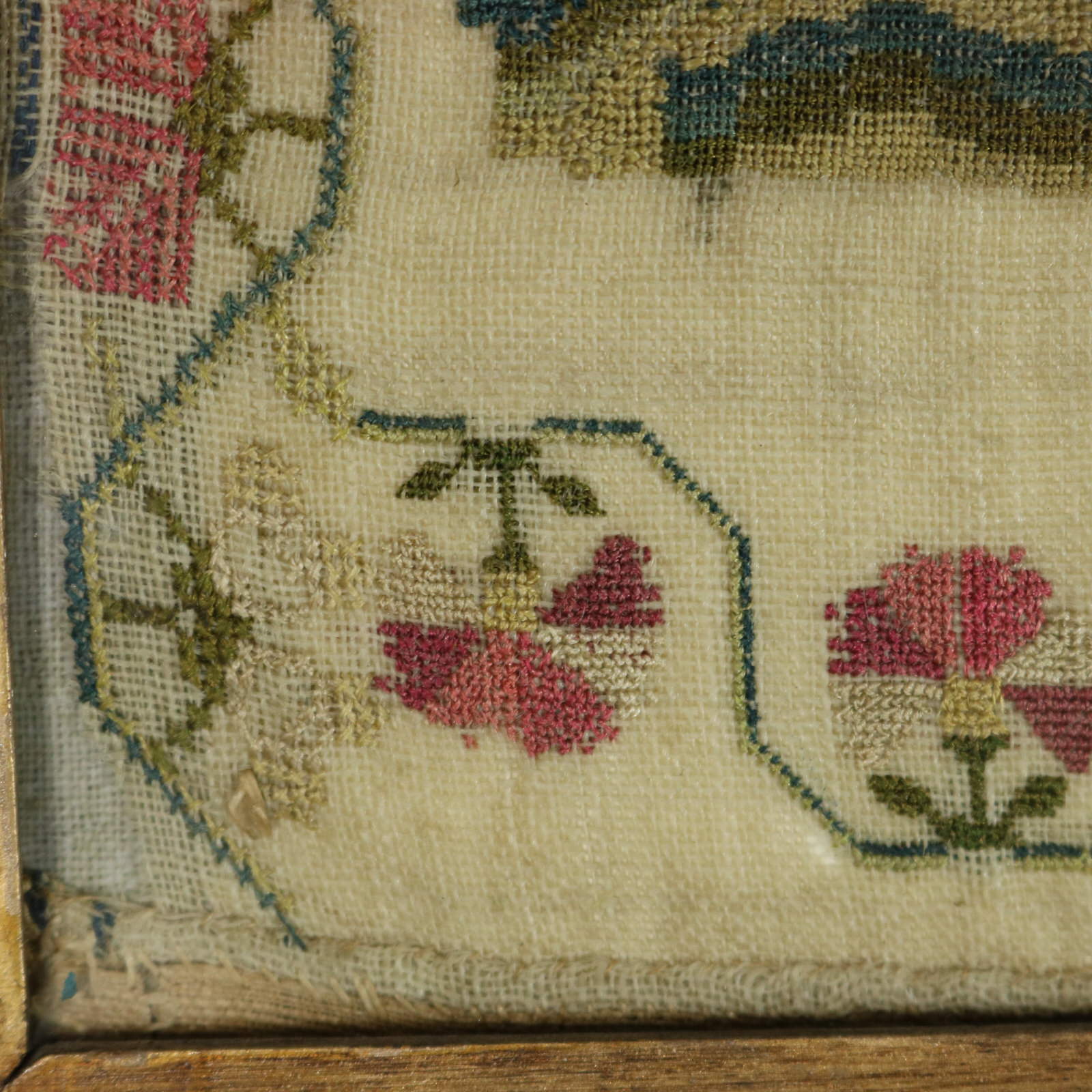 Mounting: The sampler is tacked to a wood stretcher frame. Frame backed with card and sealed with tape.