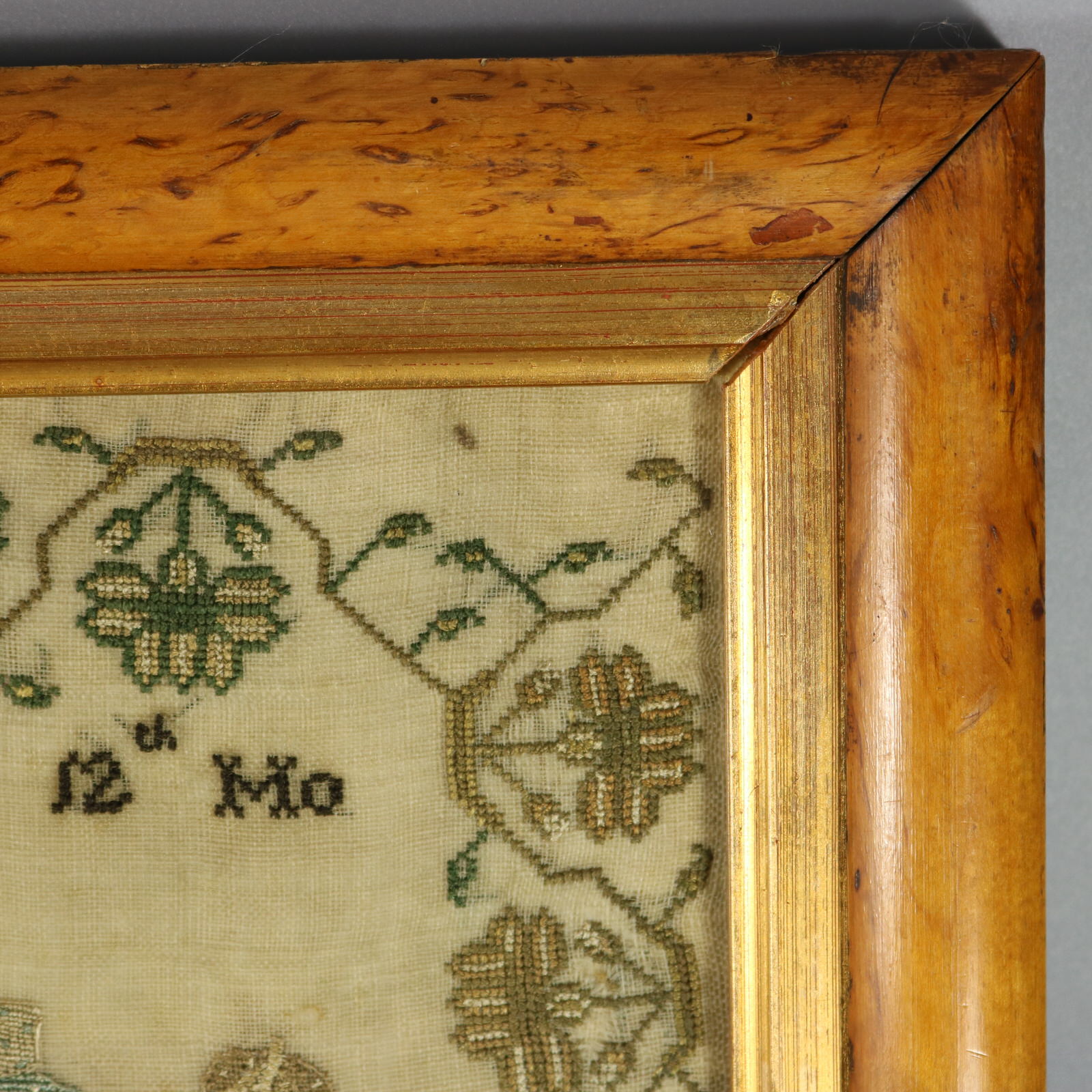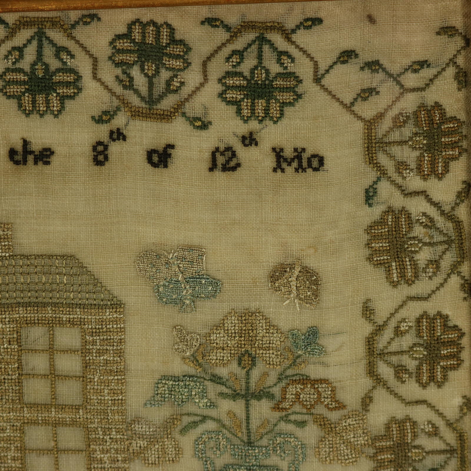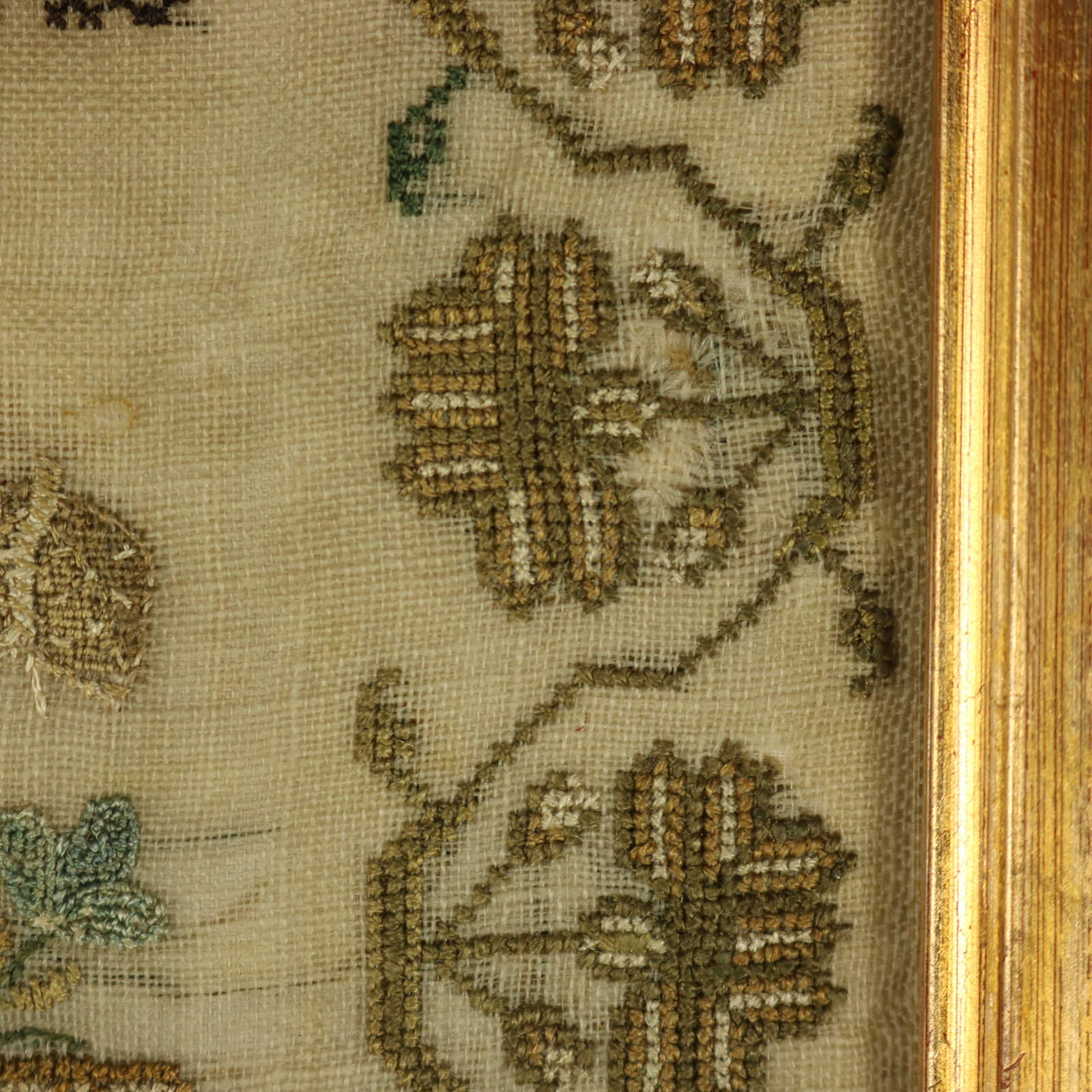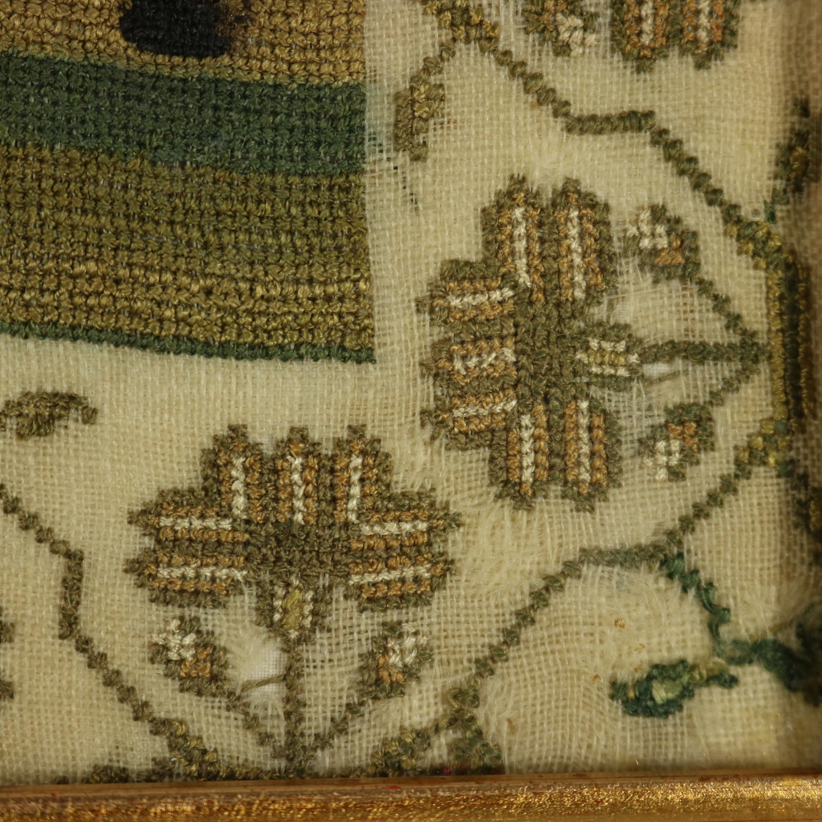 Mounting: The sampler is stitched to linen and stretched over acid free board. Frame backed with brown paper and sealed with tape.