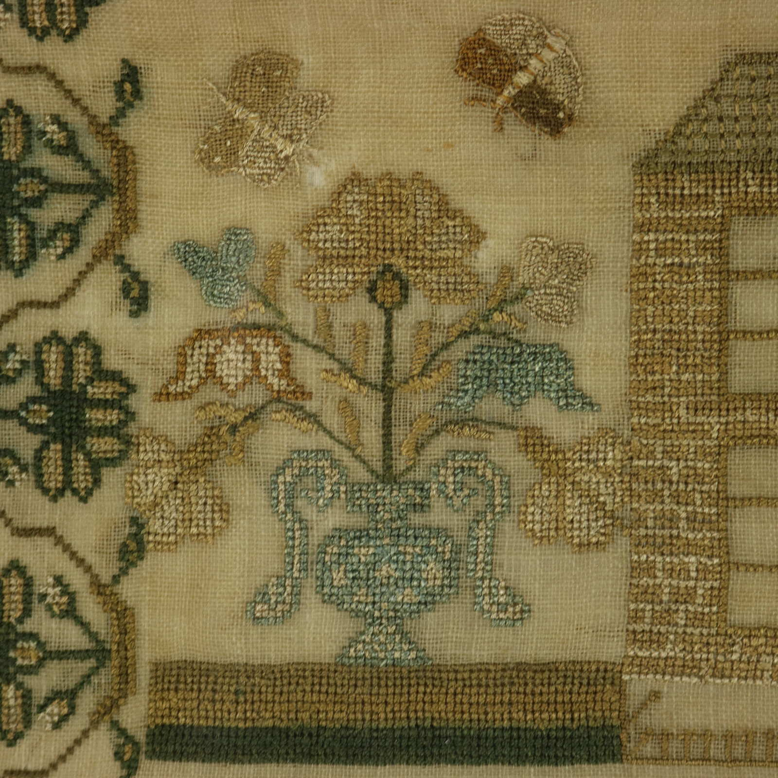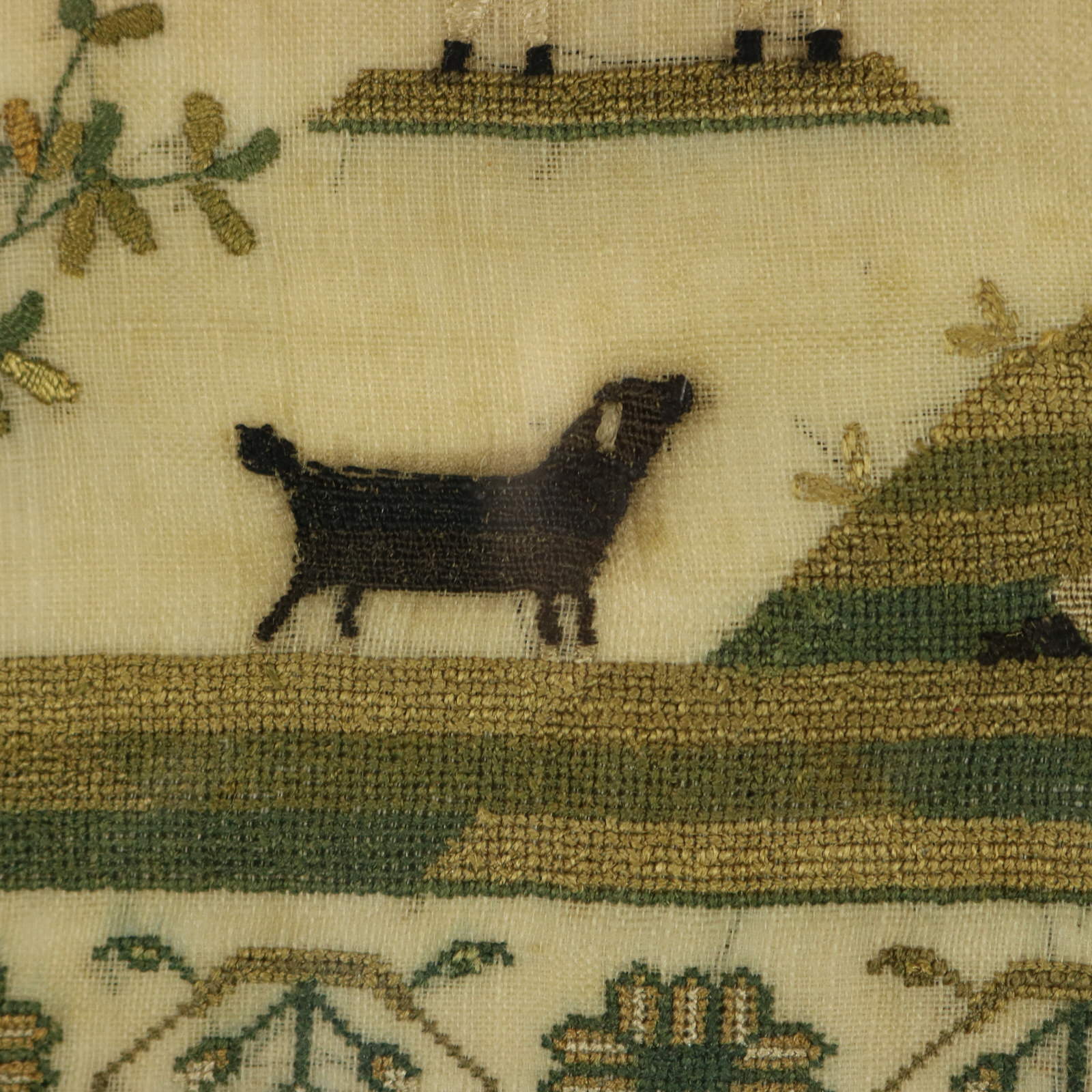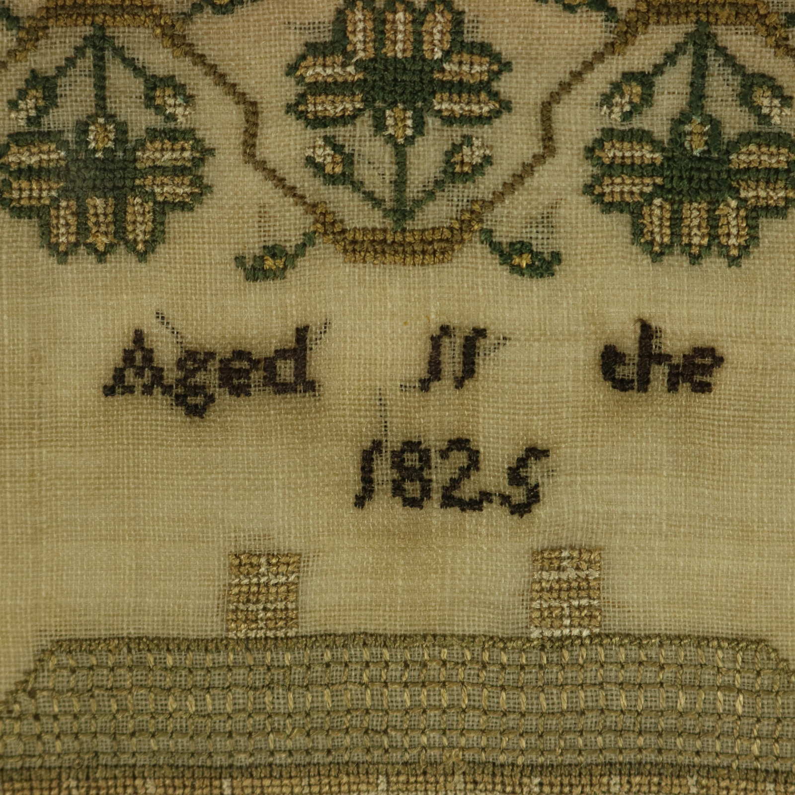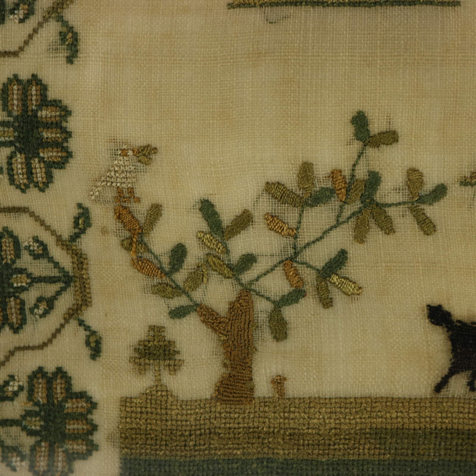 The sampler is worked in silk threads on a linen ground, mainly in cross stitch.