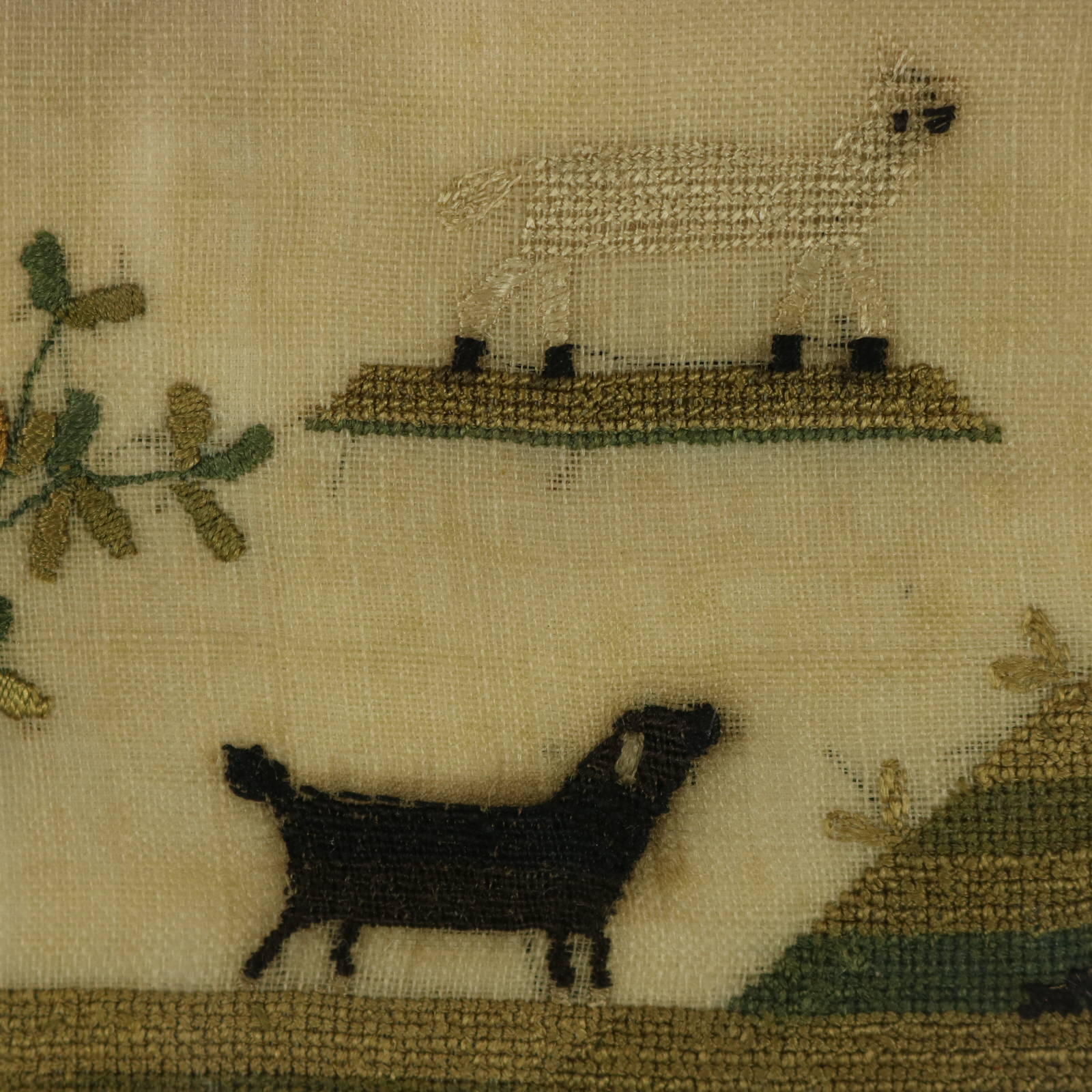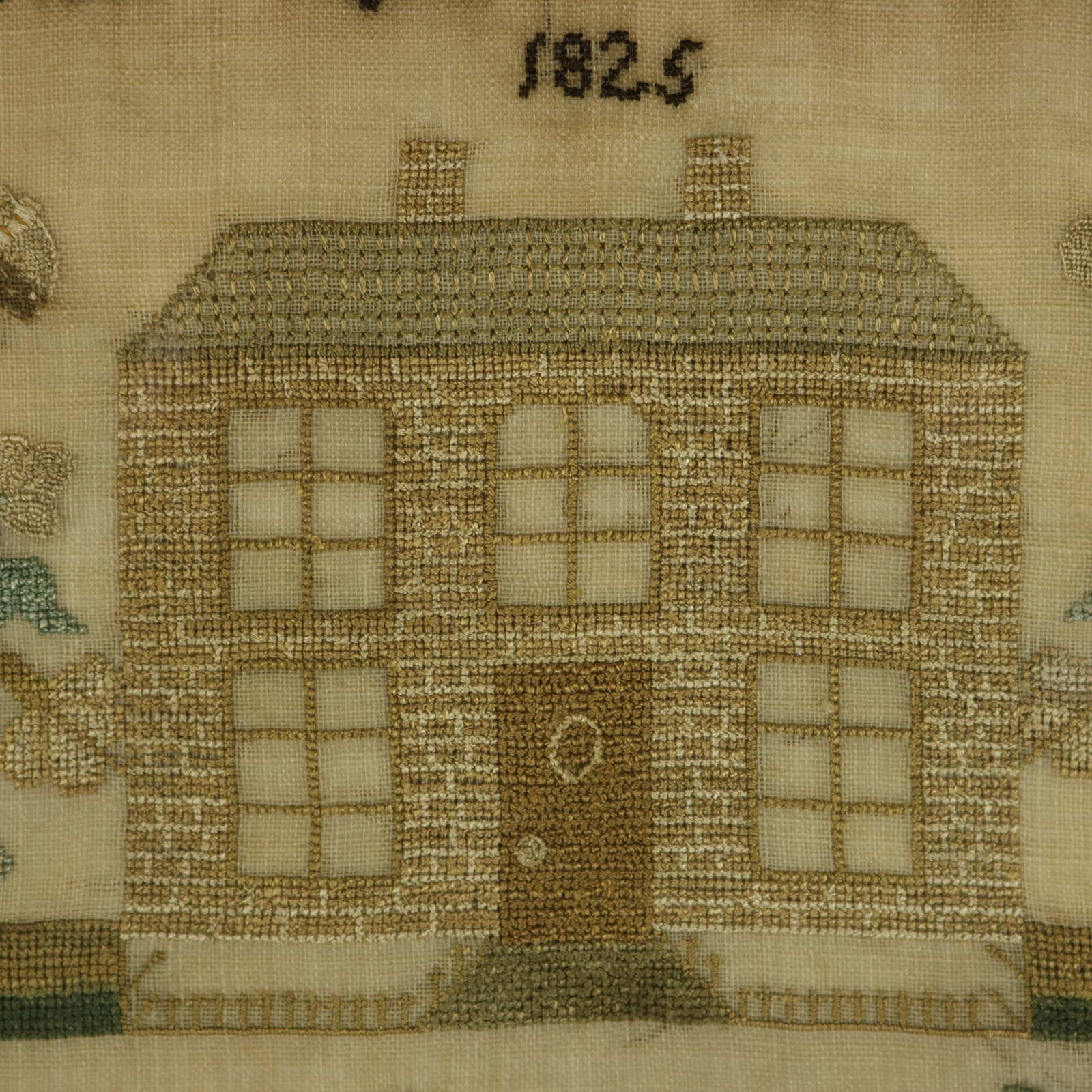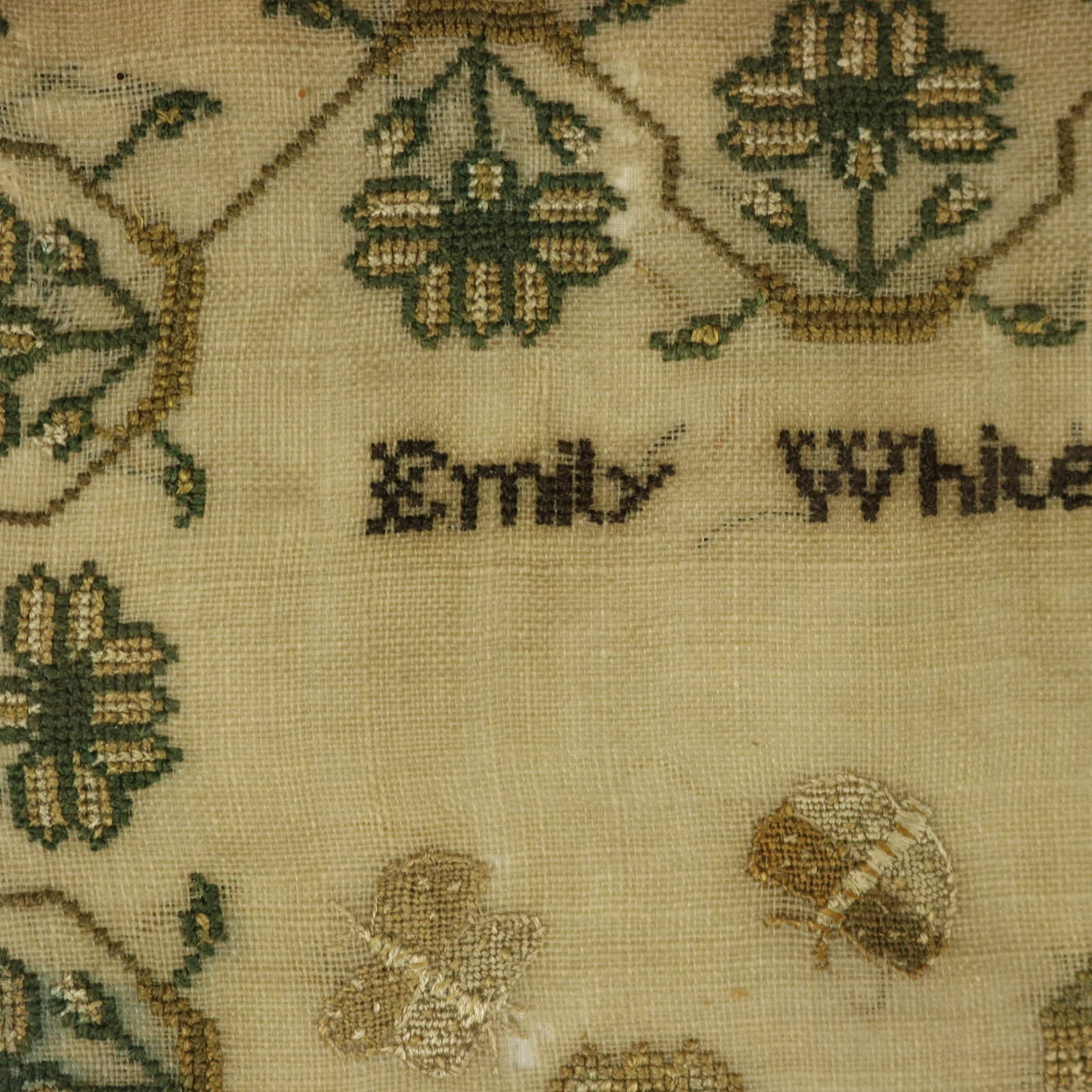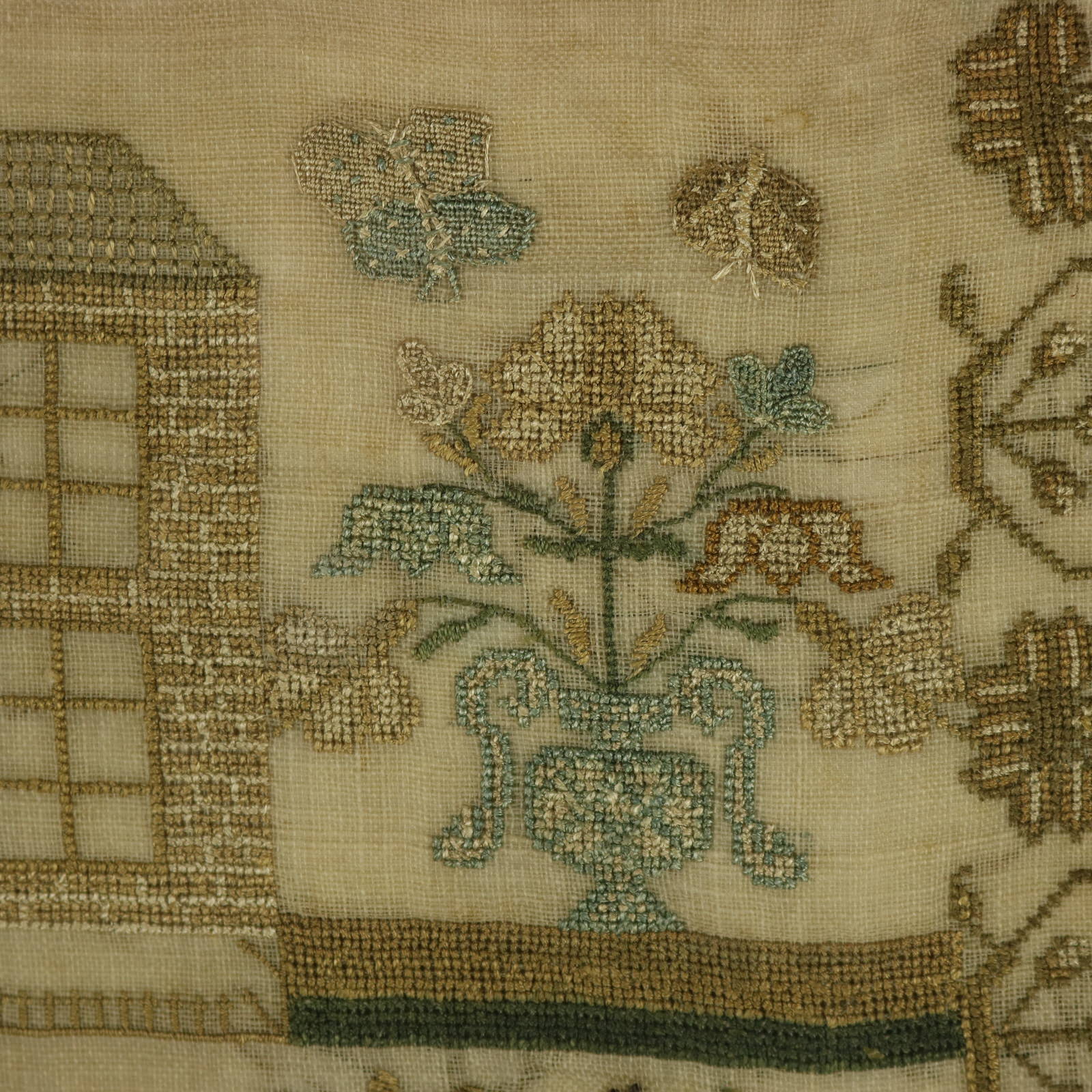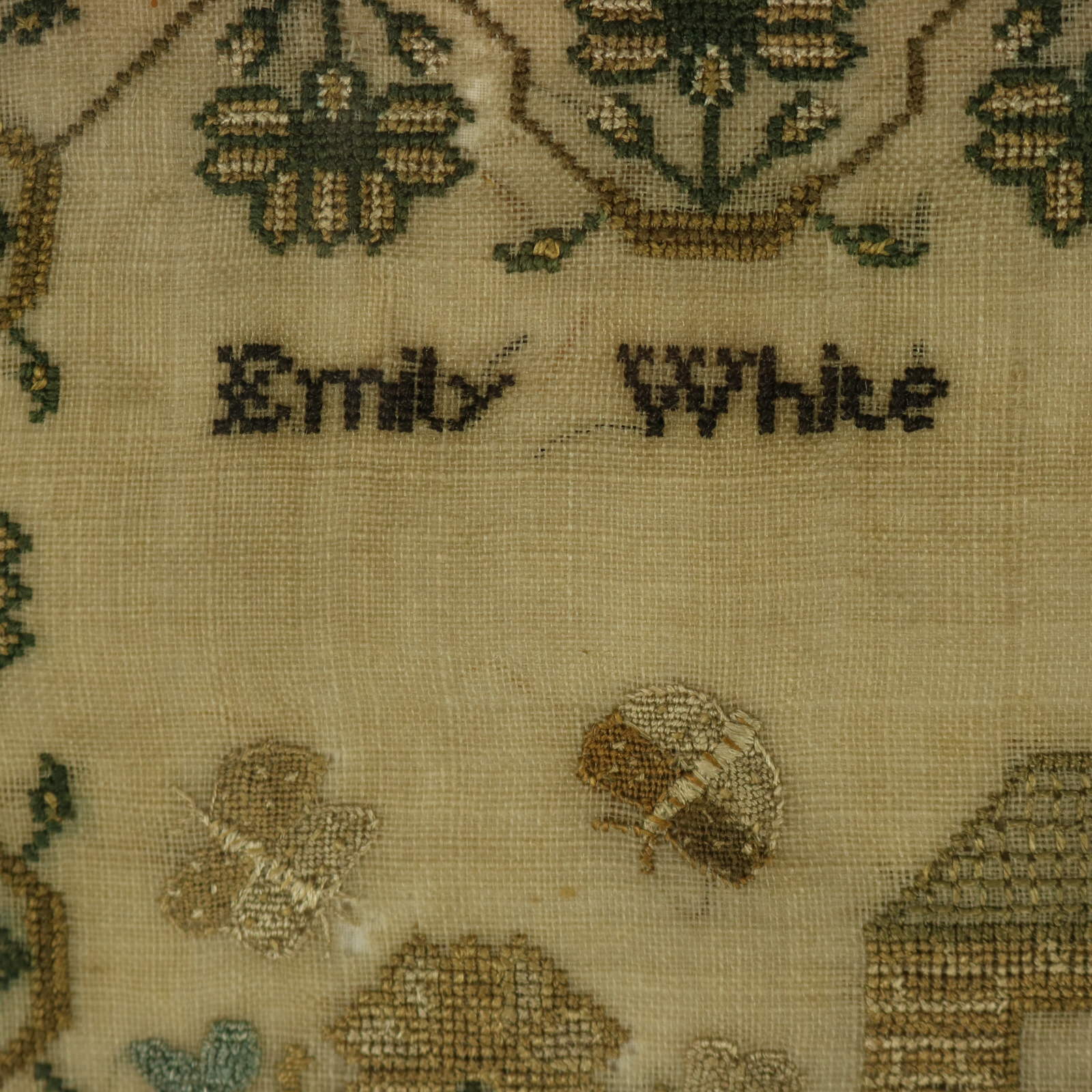 The sampler is worked in silk threads on a linen ground, mainly in cross stitch.