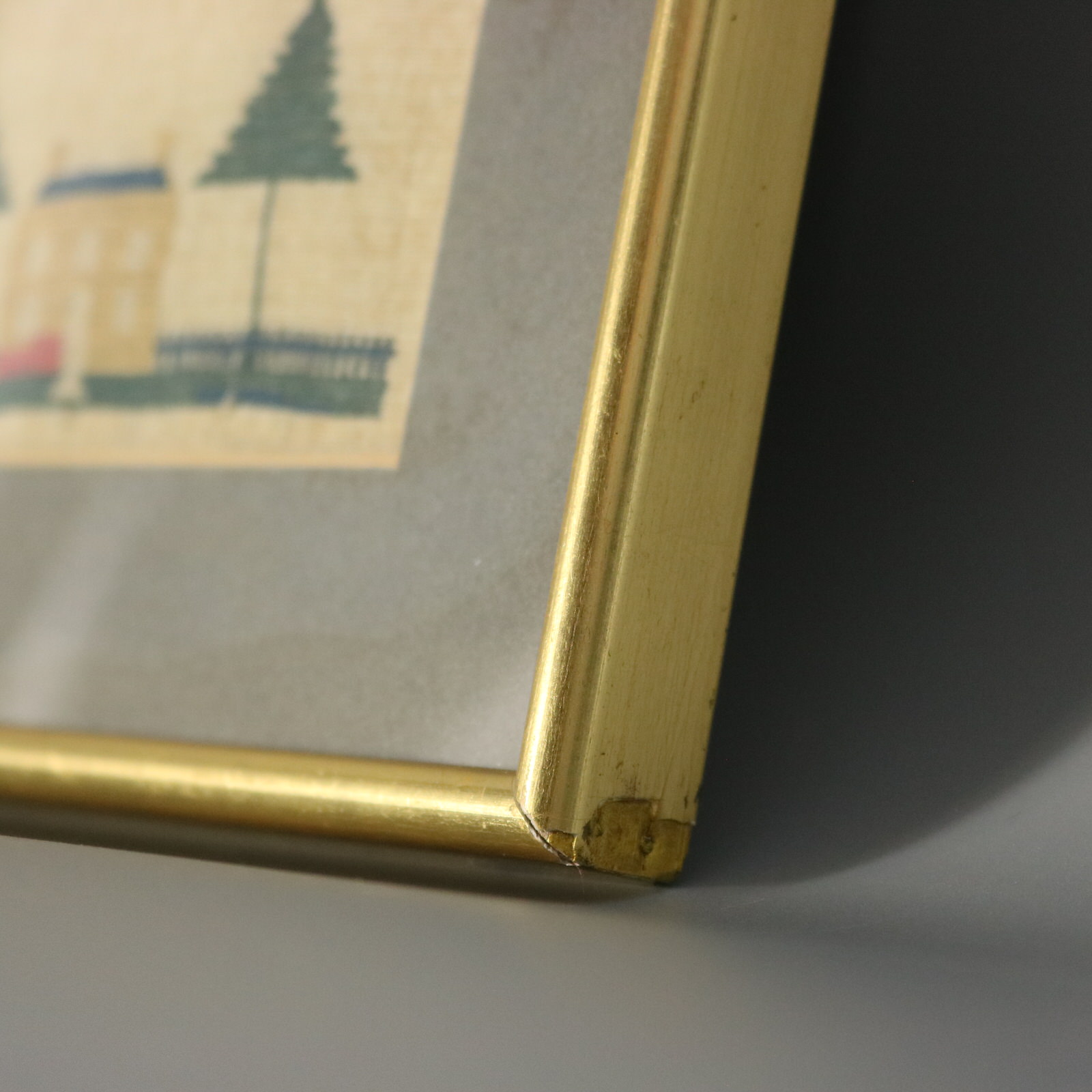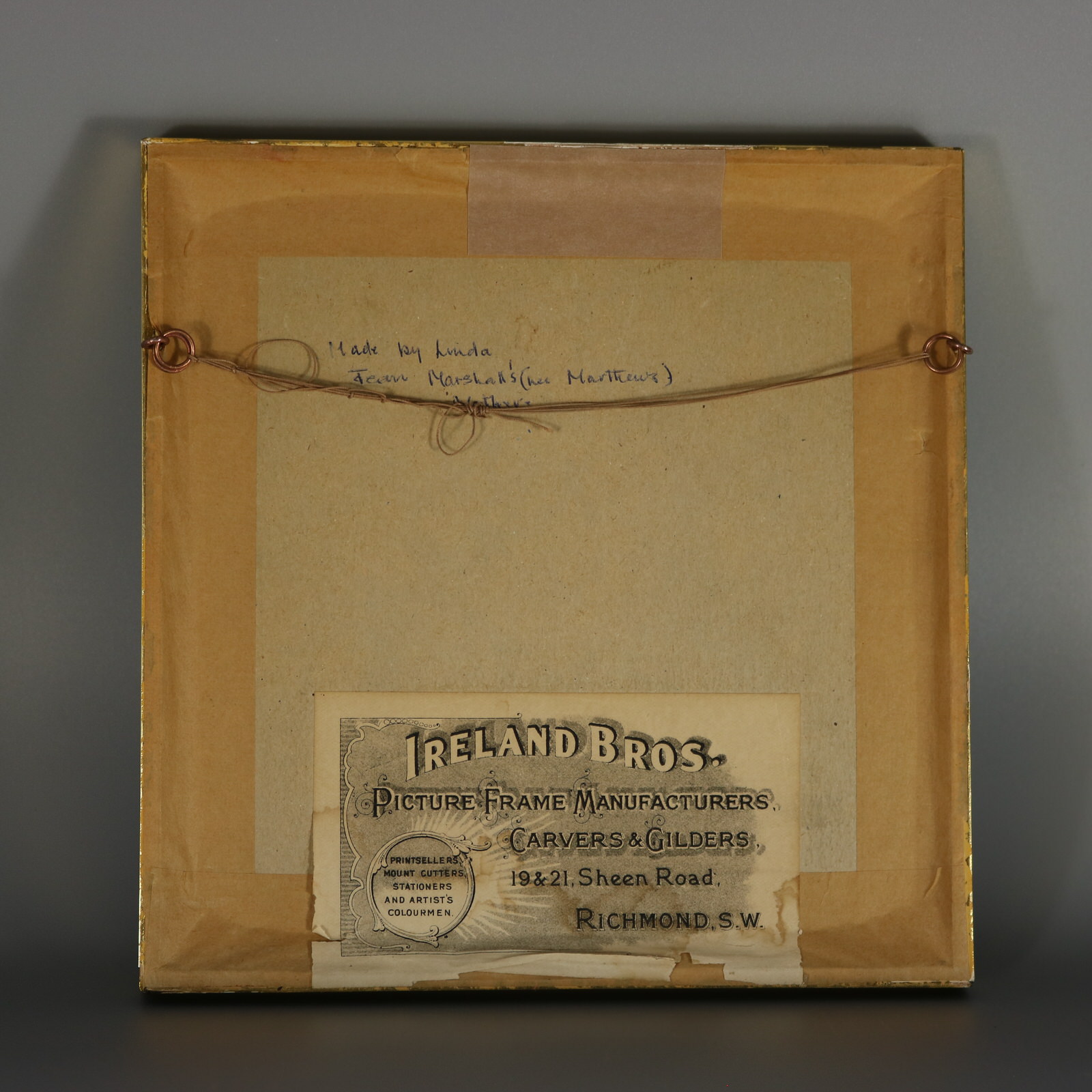 Frame backed with card and sealed with tape. Handwritten text to the reverse reads, 'Made by Linda Jean Marshall's (not Mathews') Mother.'