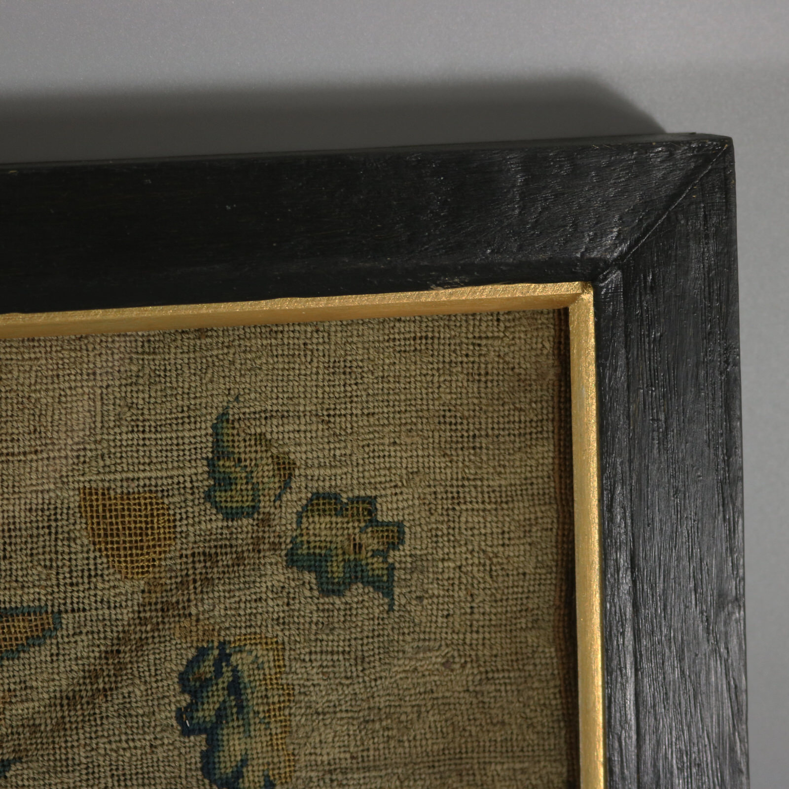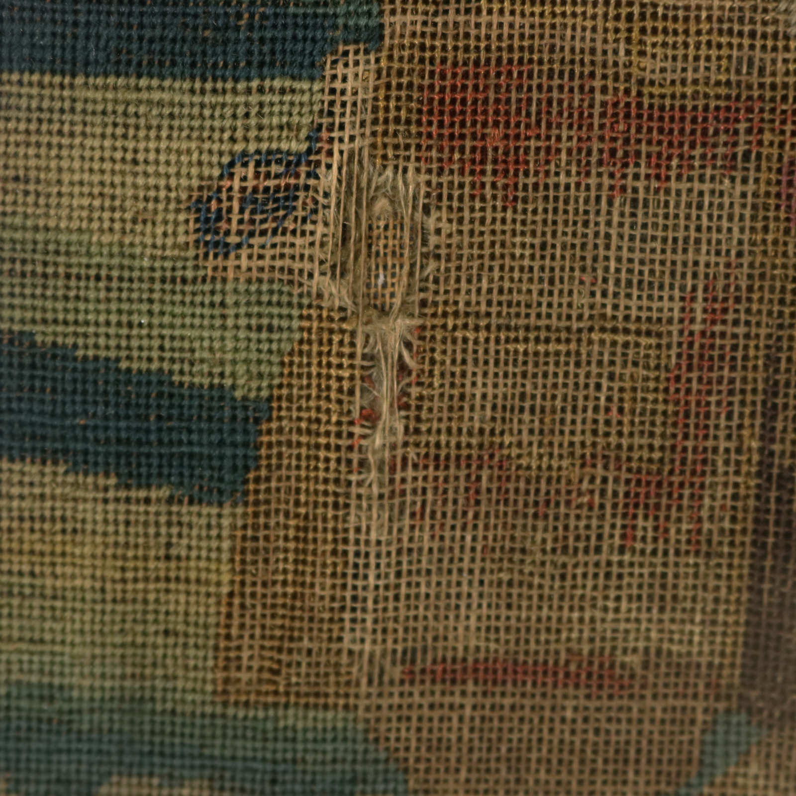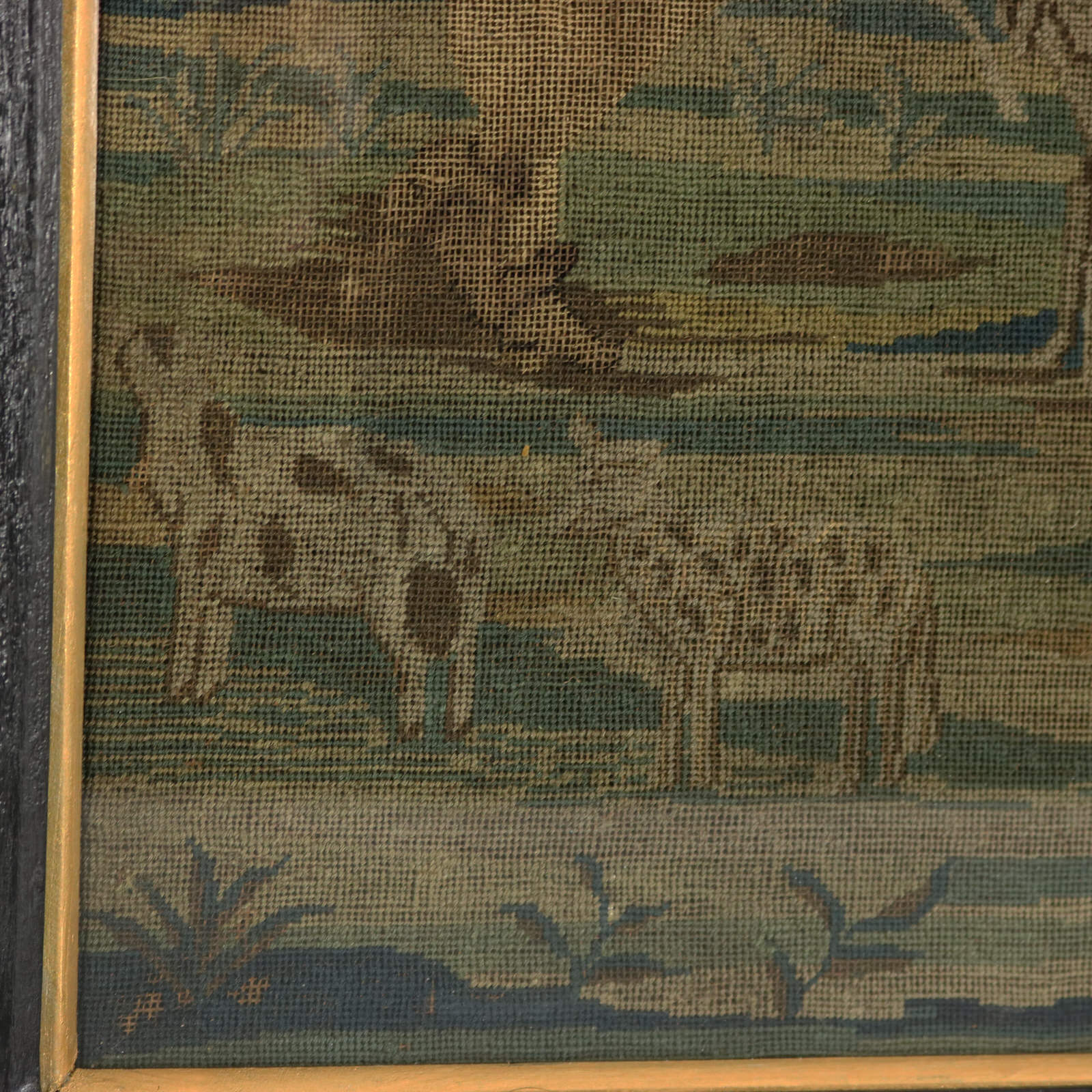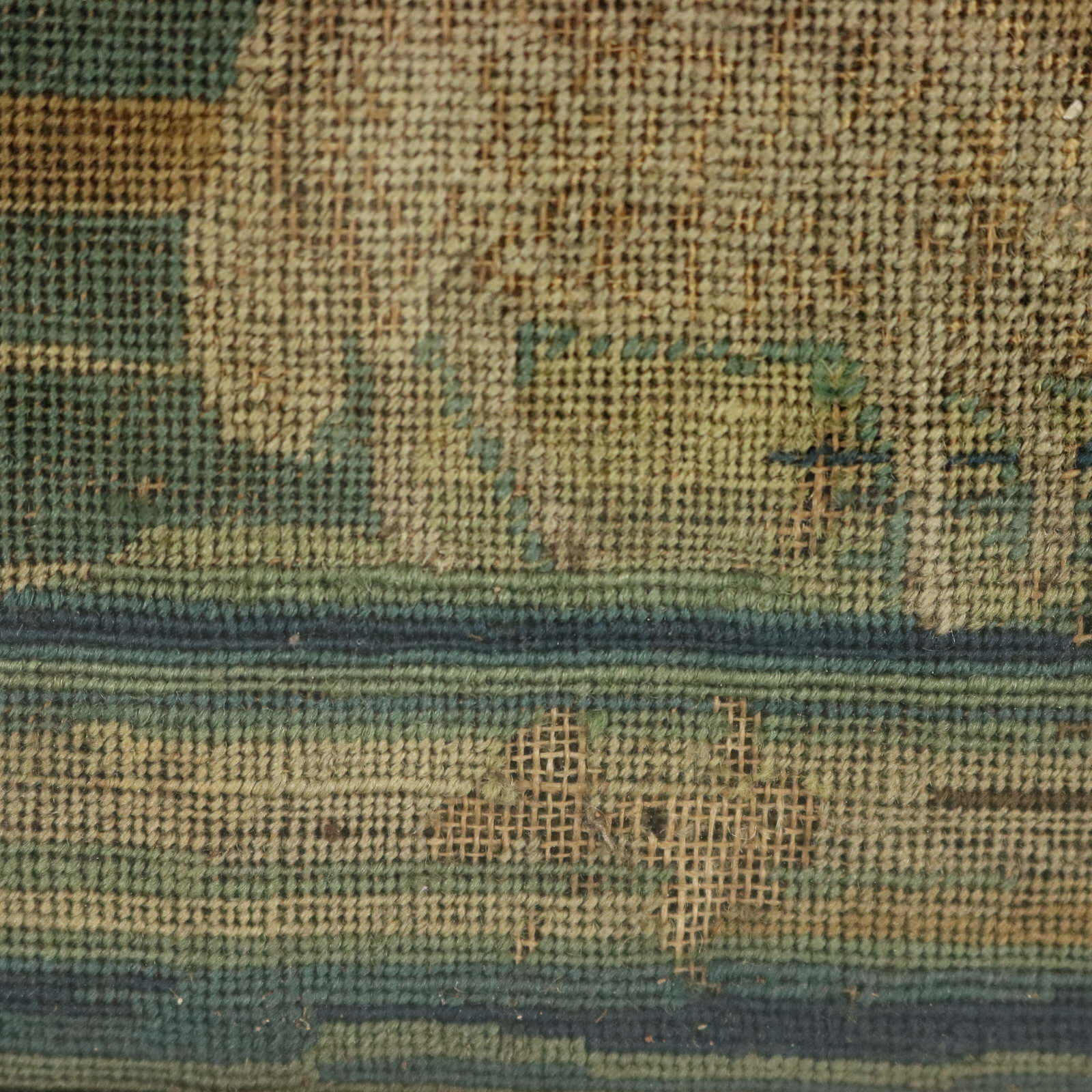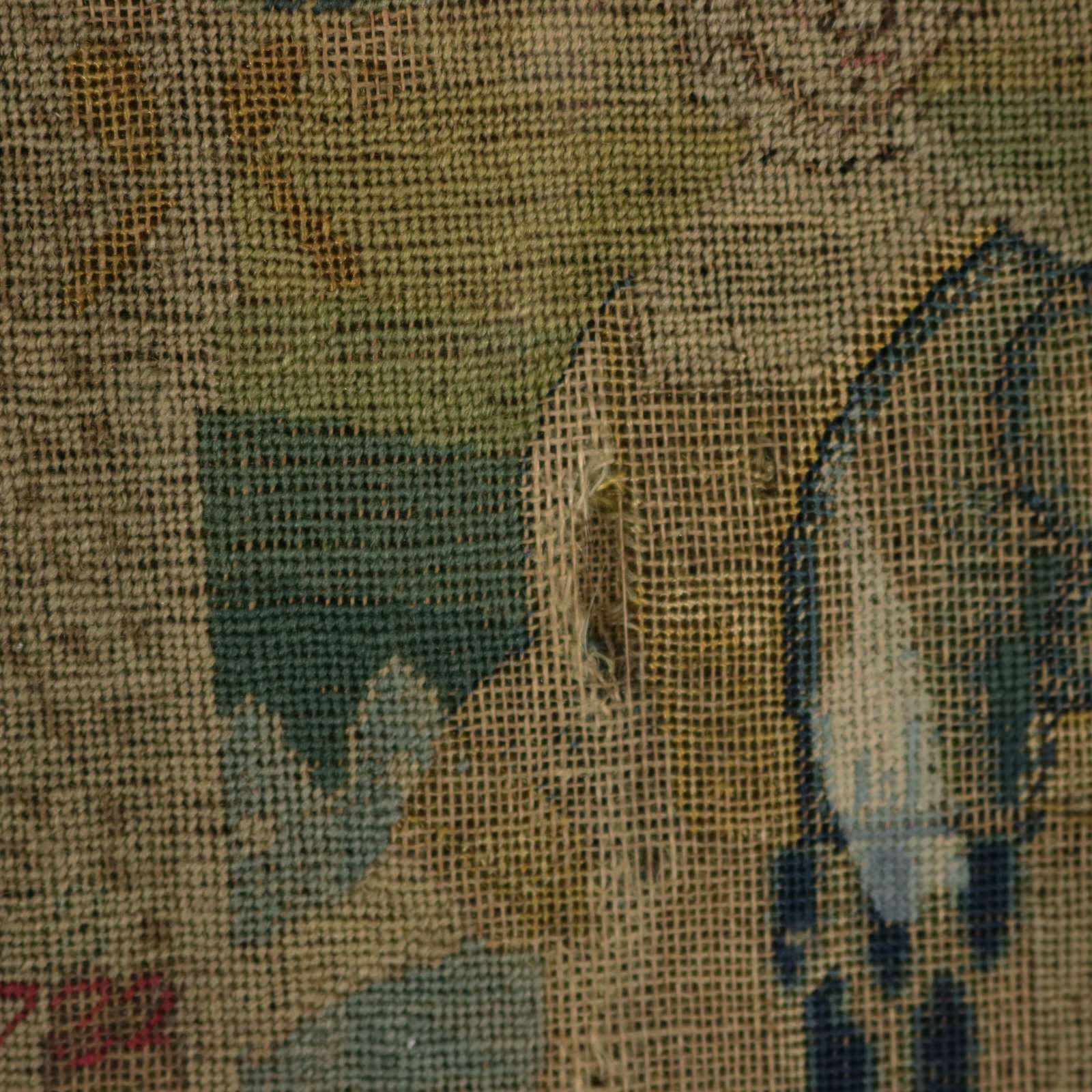 The piece is worked in petit point, using silk and fine wool-like threads on a canvas ground.