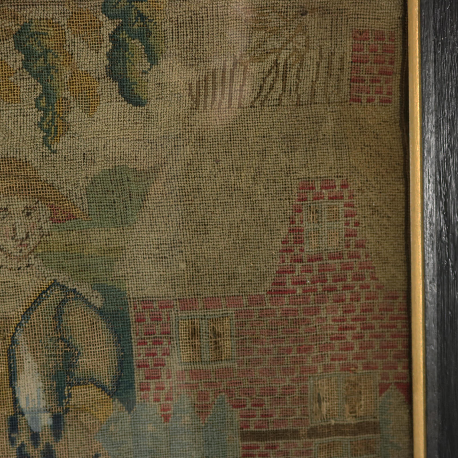 Framed in an old, repainted wood frame with glass.