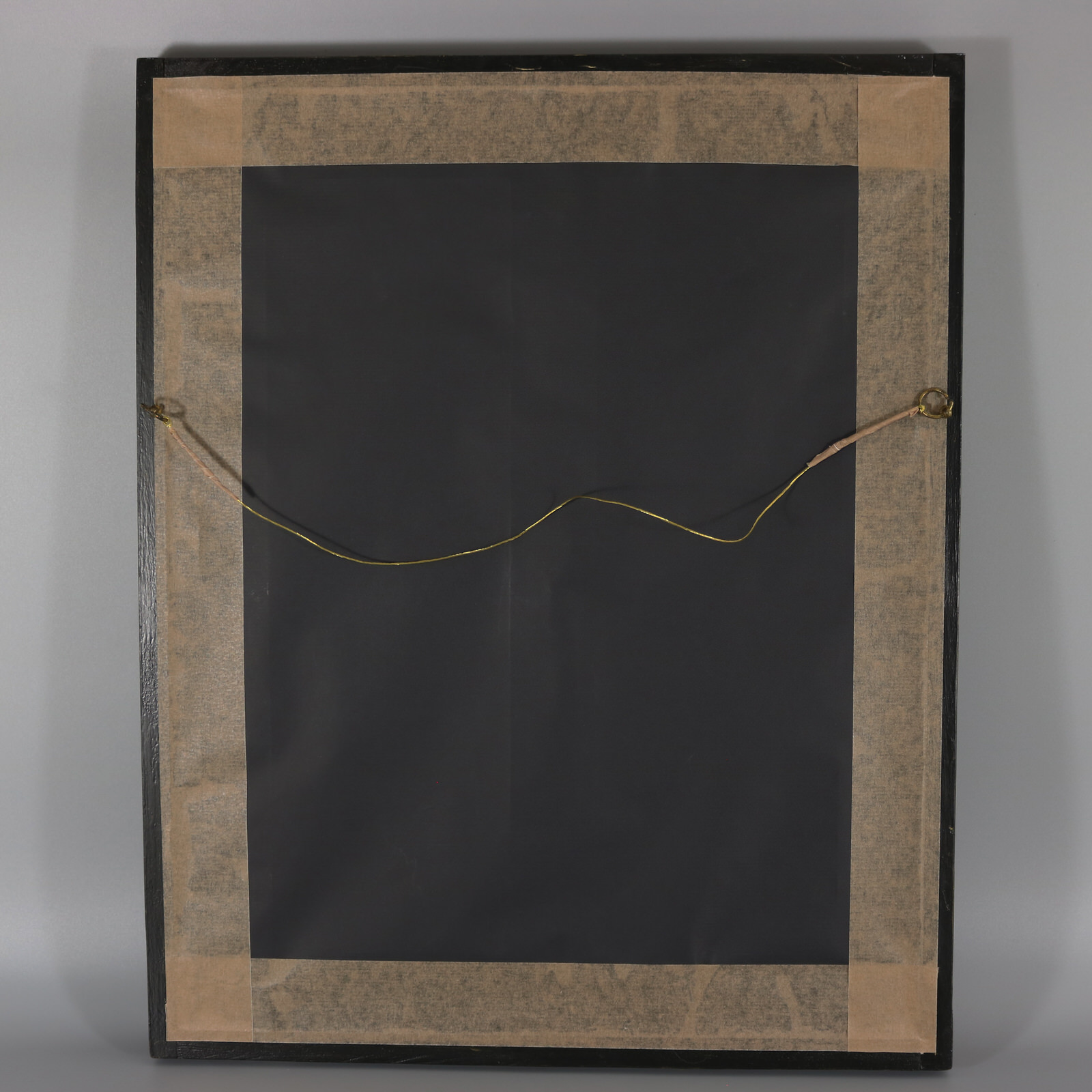 Mounting: The piece is tacked to a wood stretcher frame. Frame backed with paper and sealed with tape.