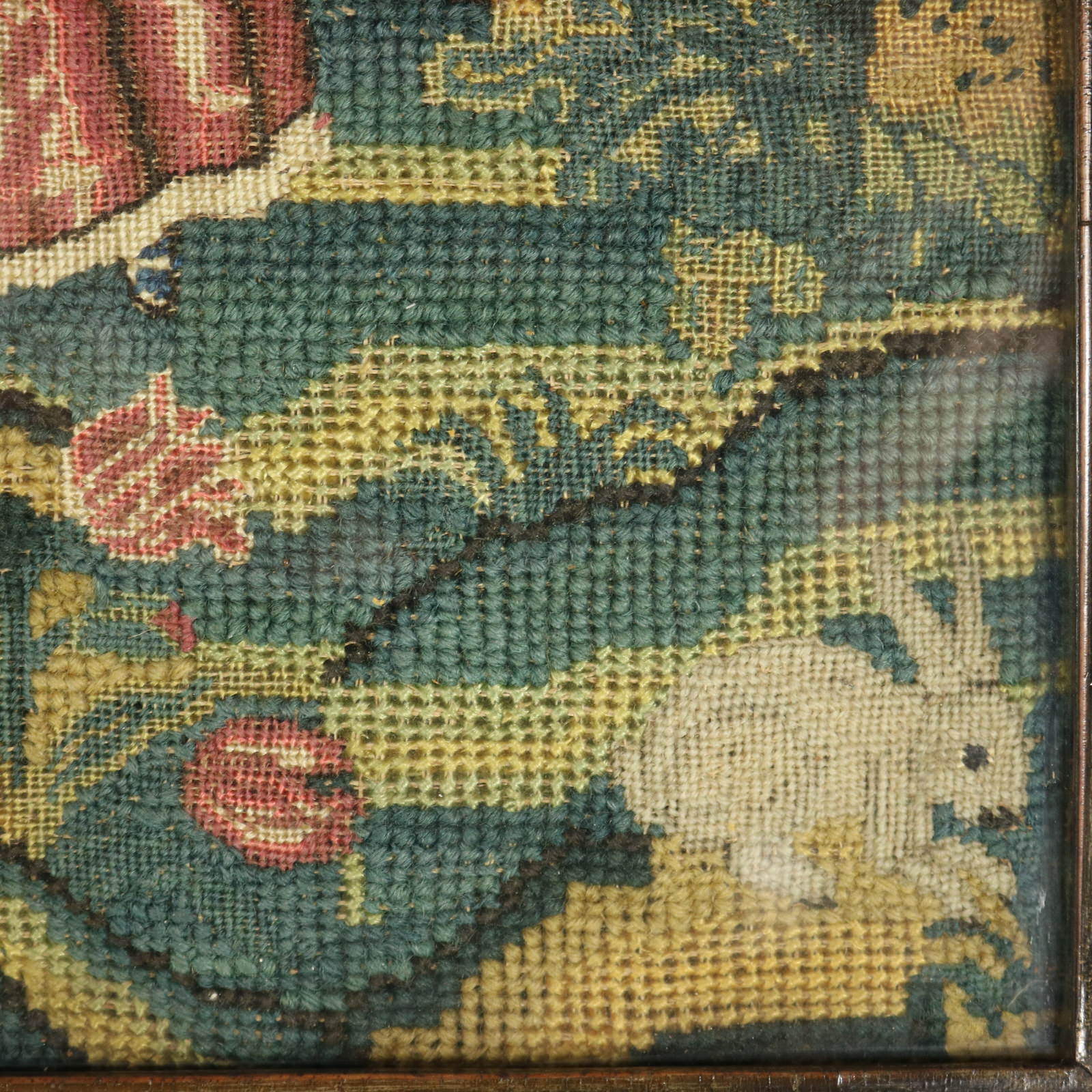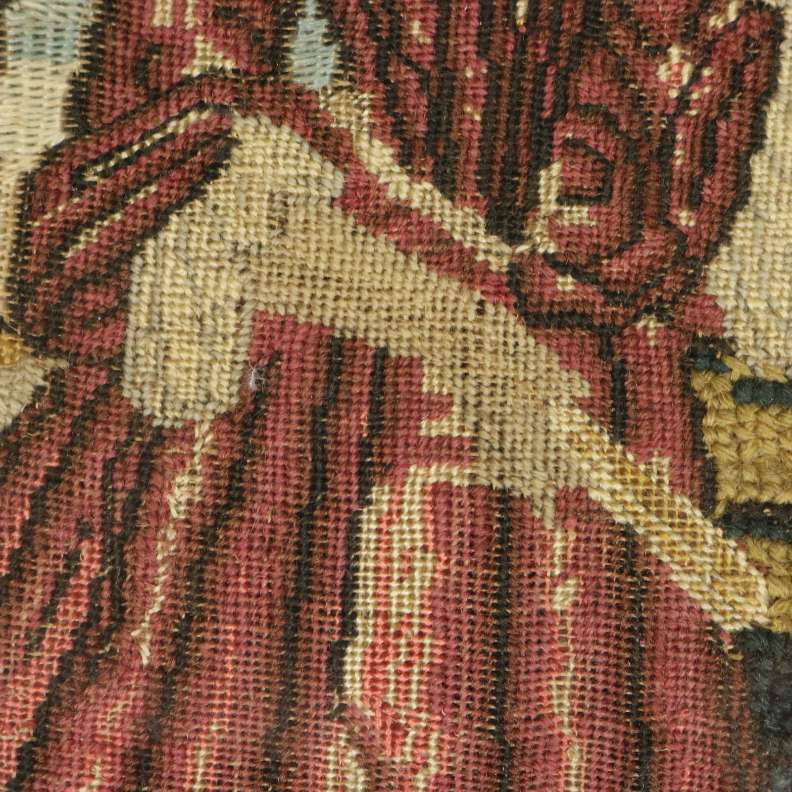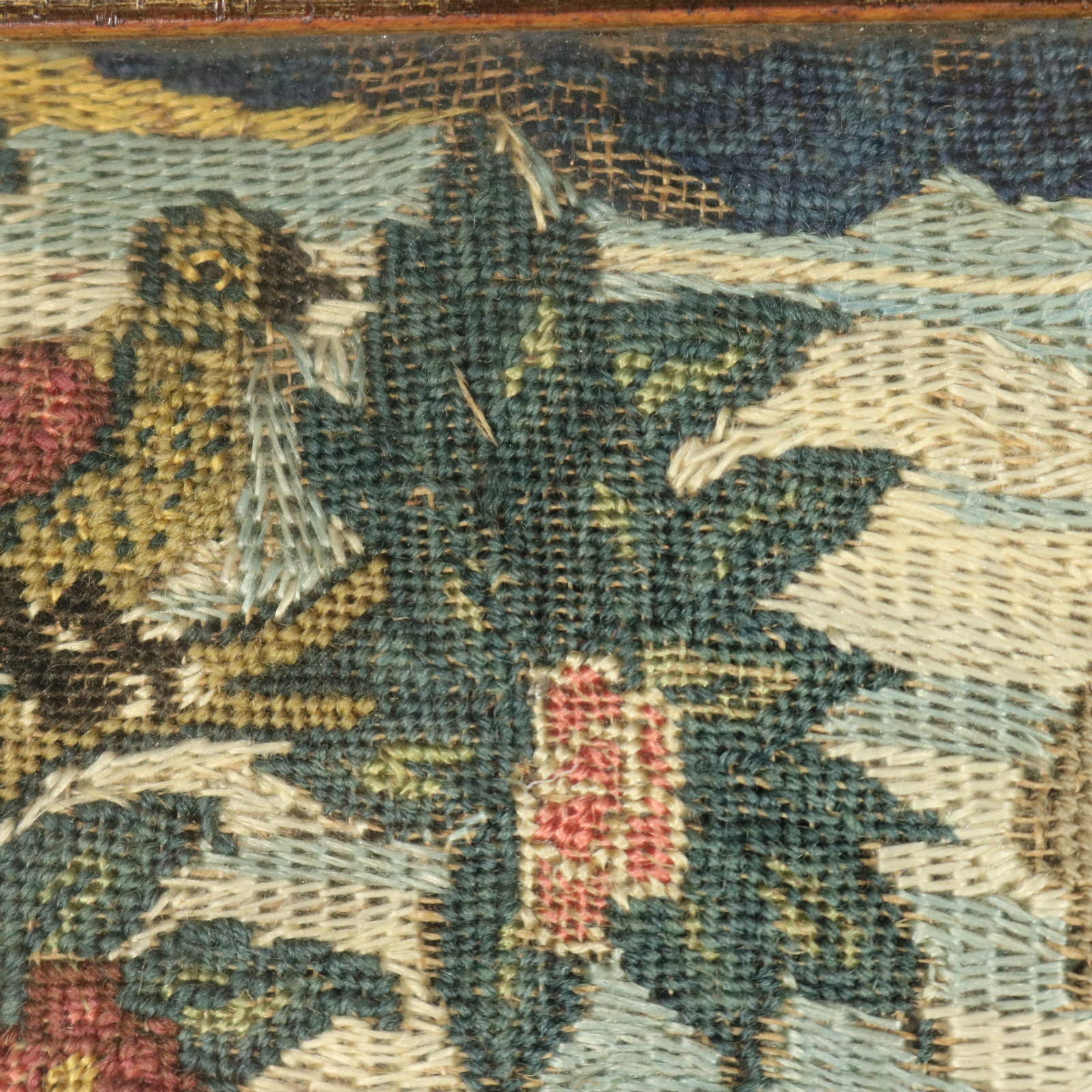 The piece is worked in petit point, using silk and fine wool-like threads on a canvas ground.