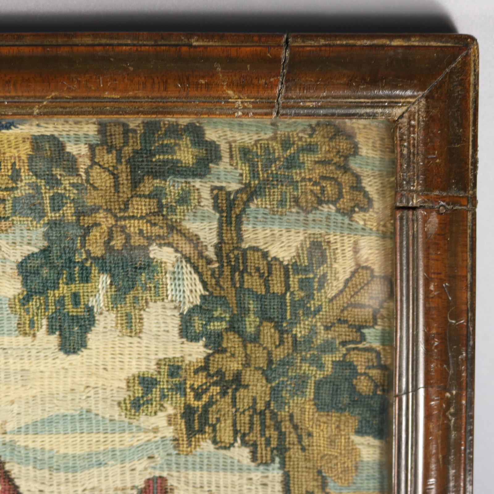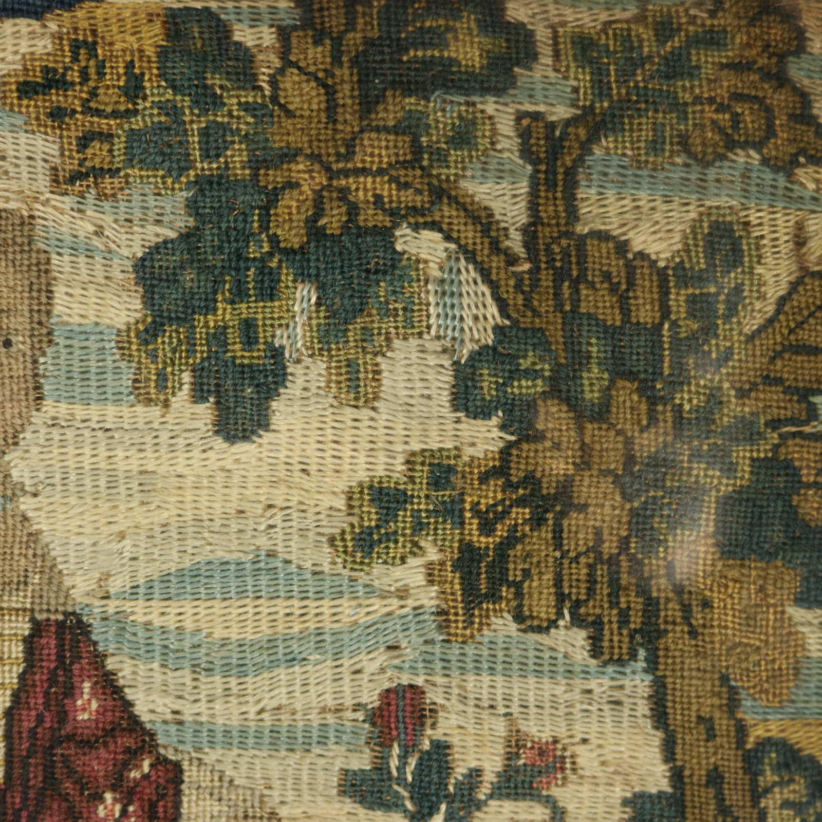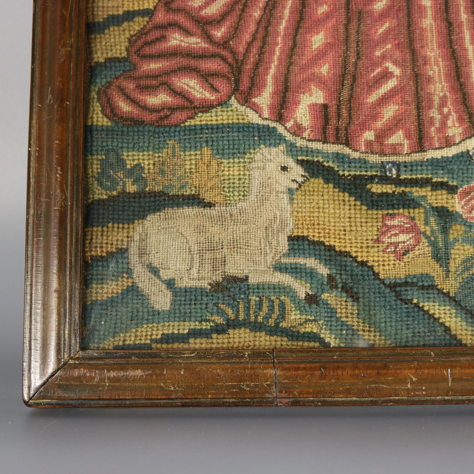 The piece is worked in petit point, using silk and fine wool-like threads on a canvas ground.