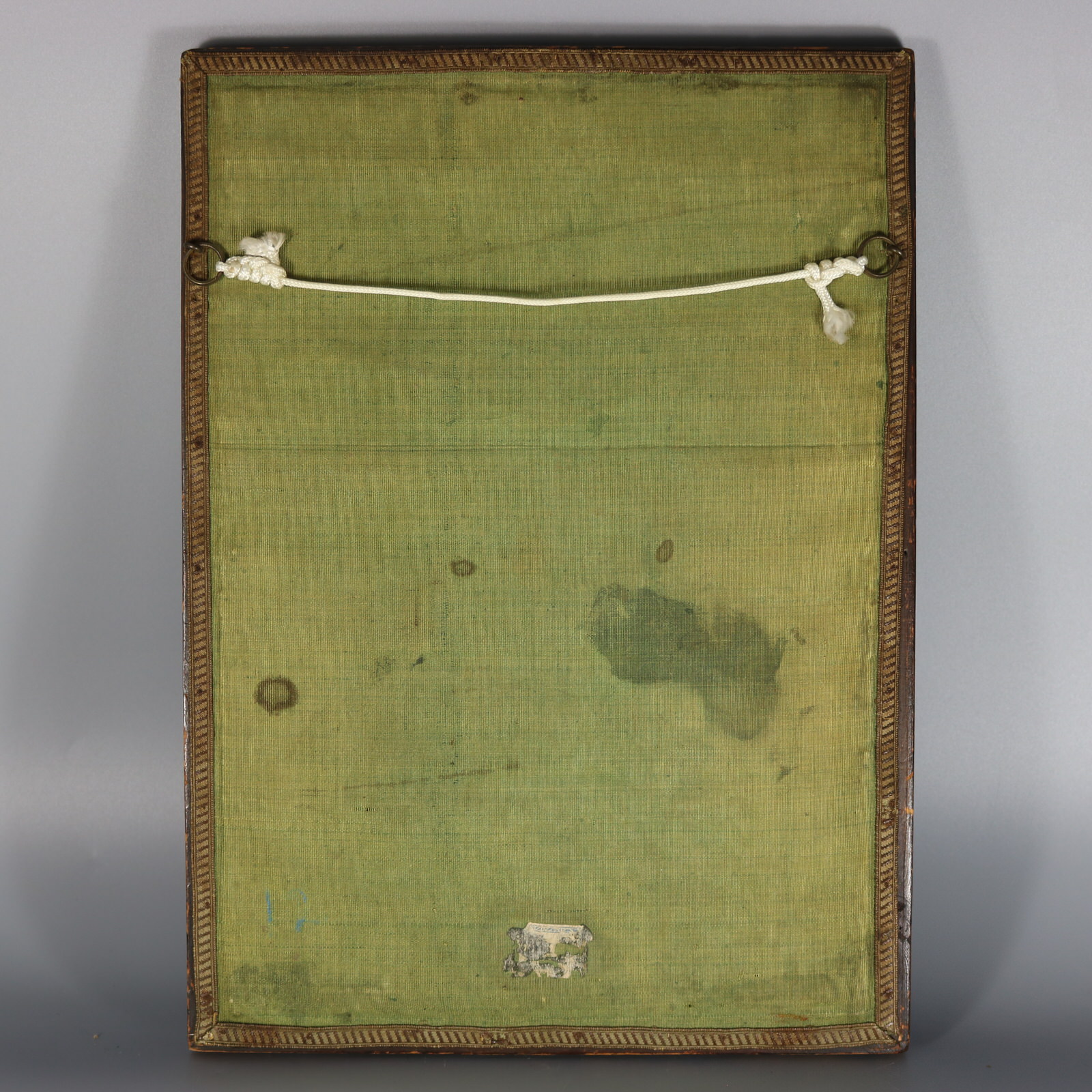 Framed in an old, possibly original wood frame with glass covering. The frame is backed with wood and covered with an old, possibly original sheet of material.