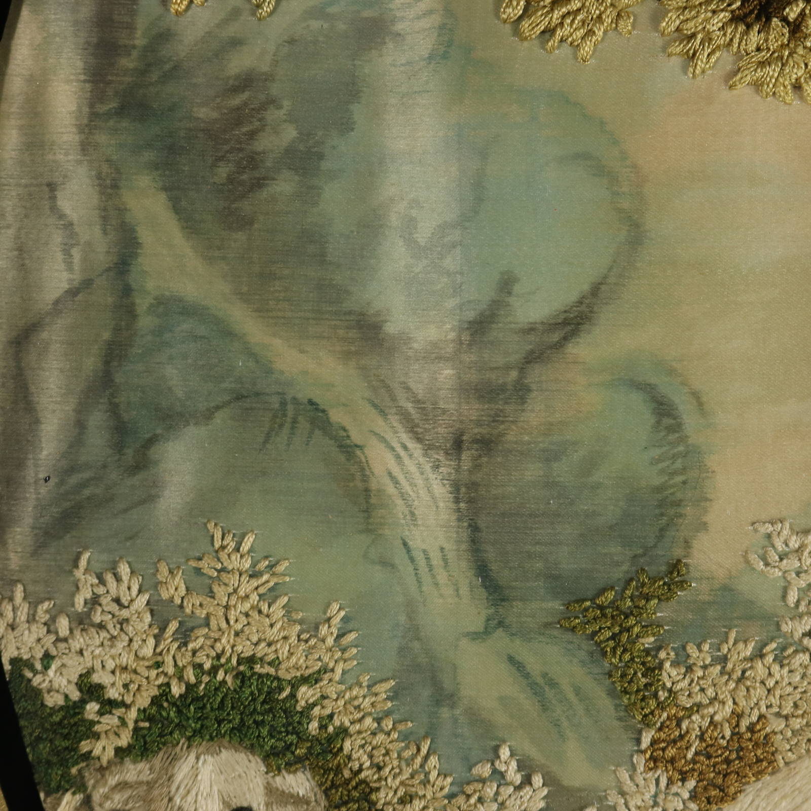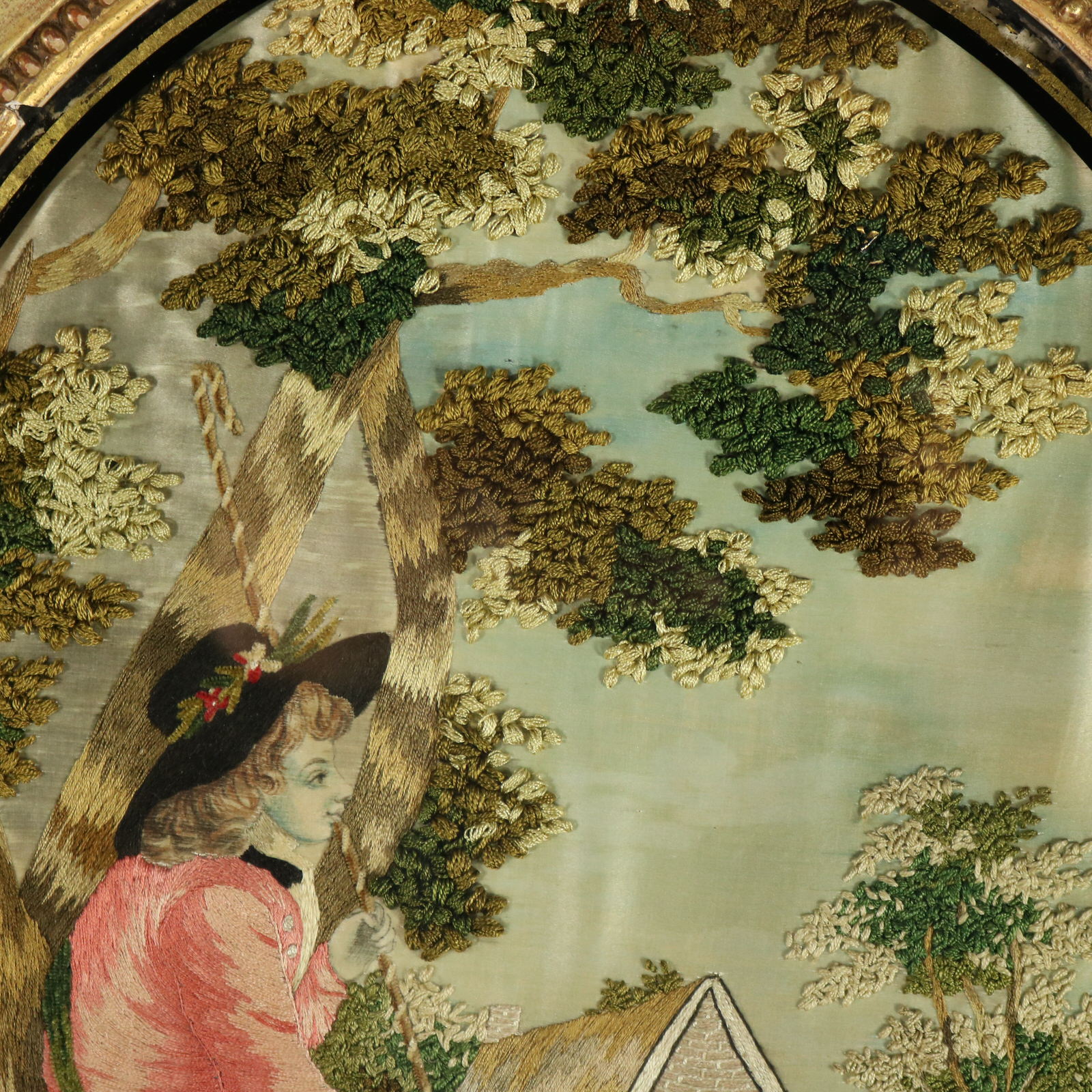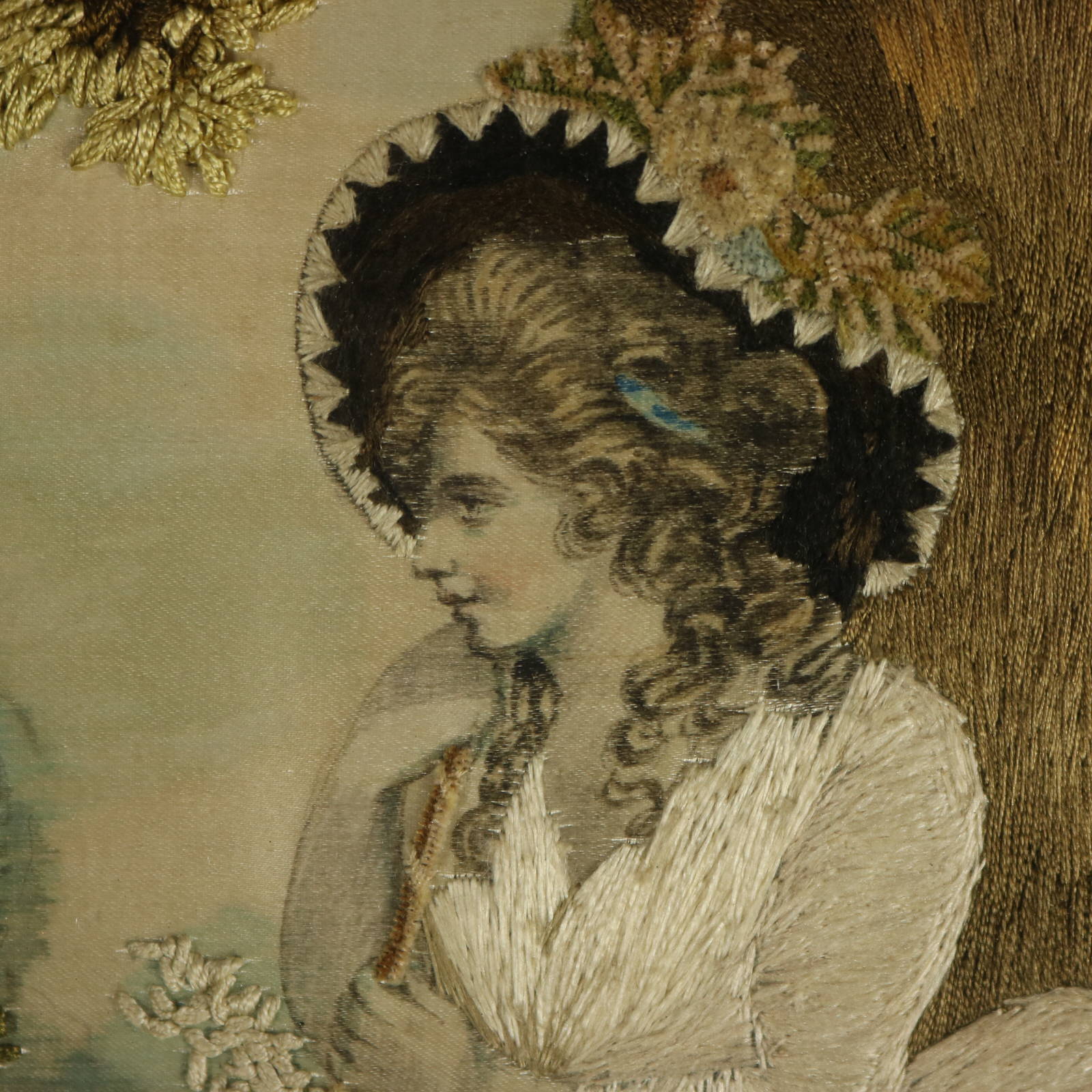 The embroidery is worked in silk on a silk ground, with painted details on the ground.