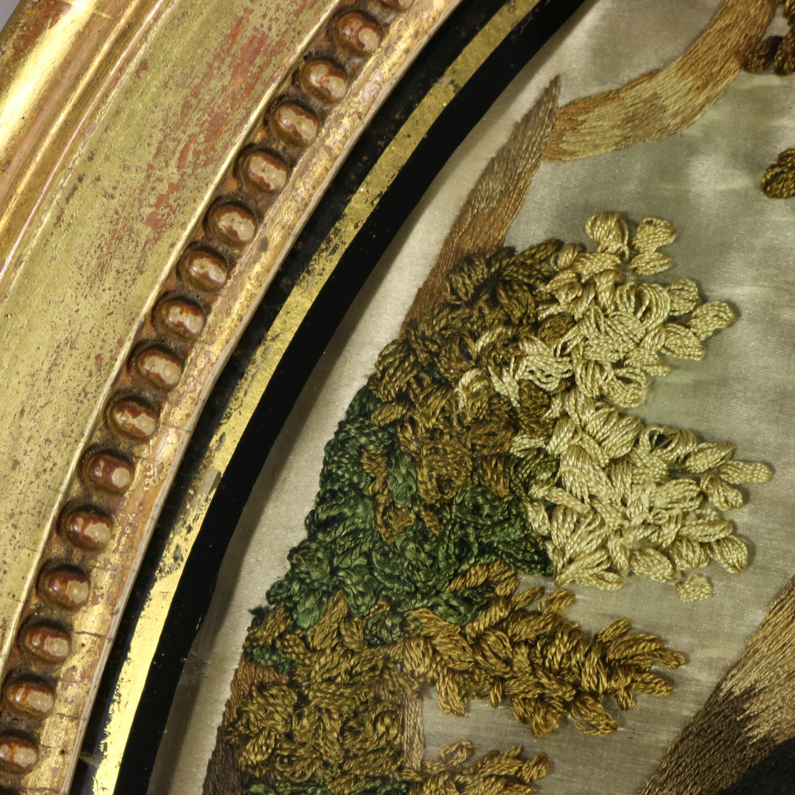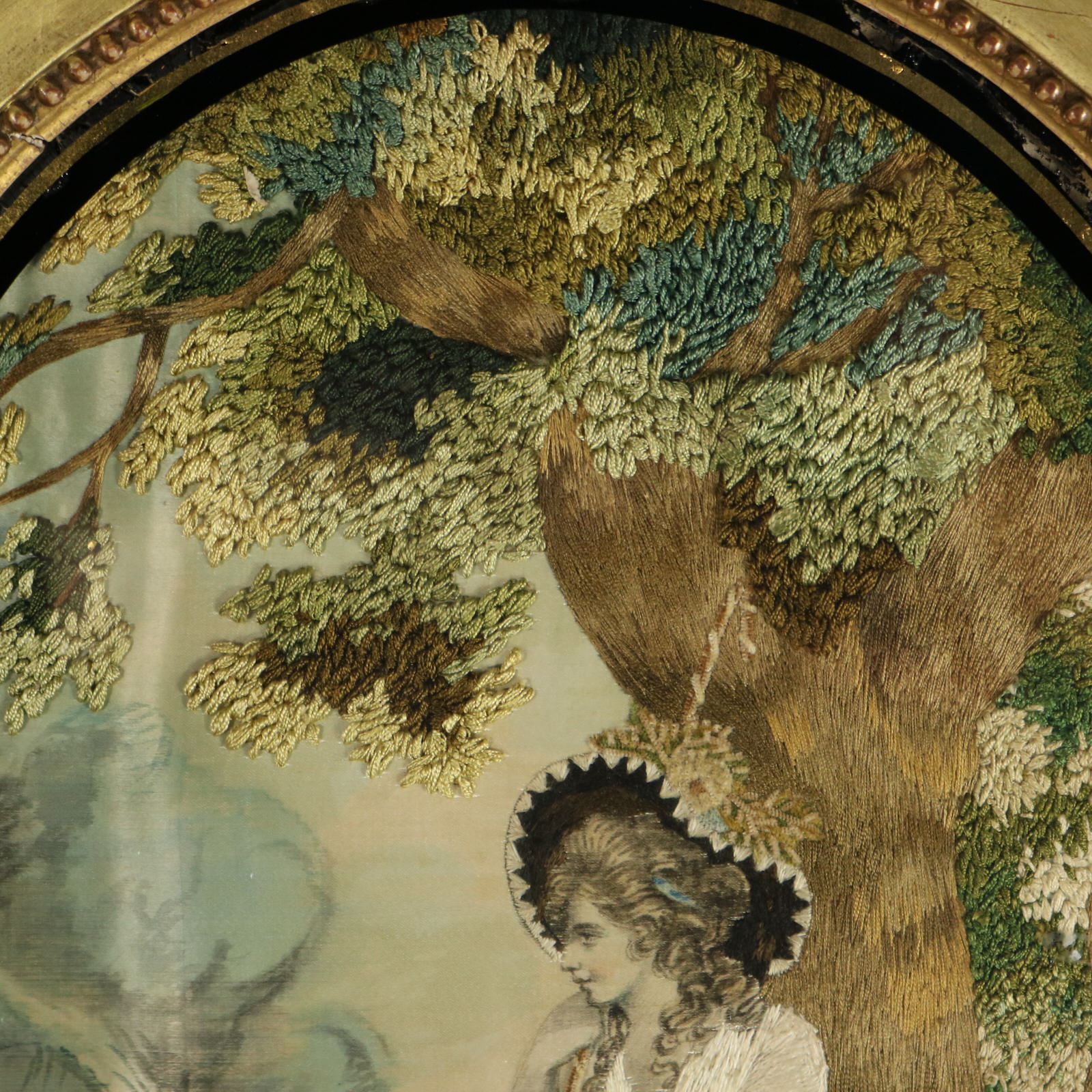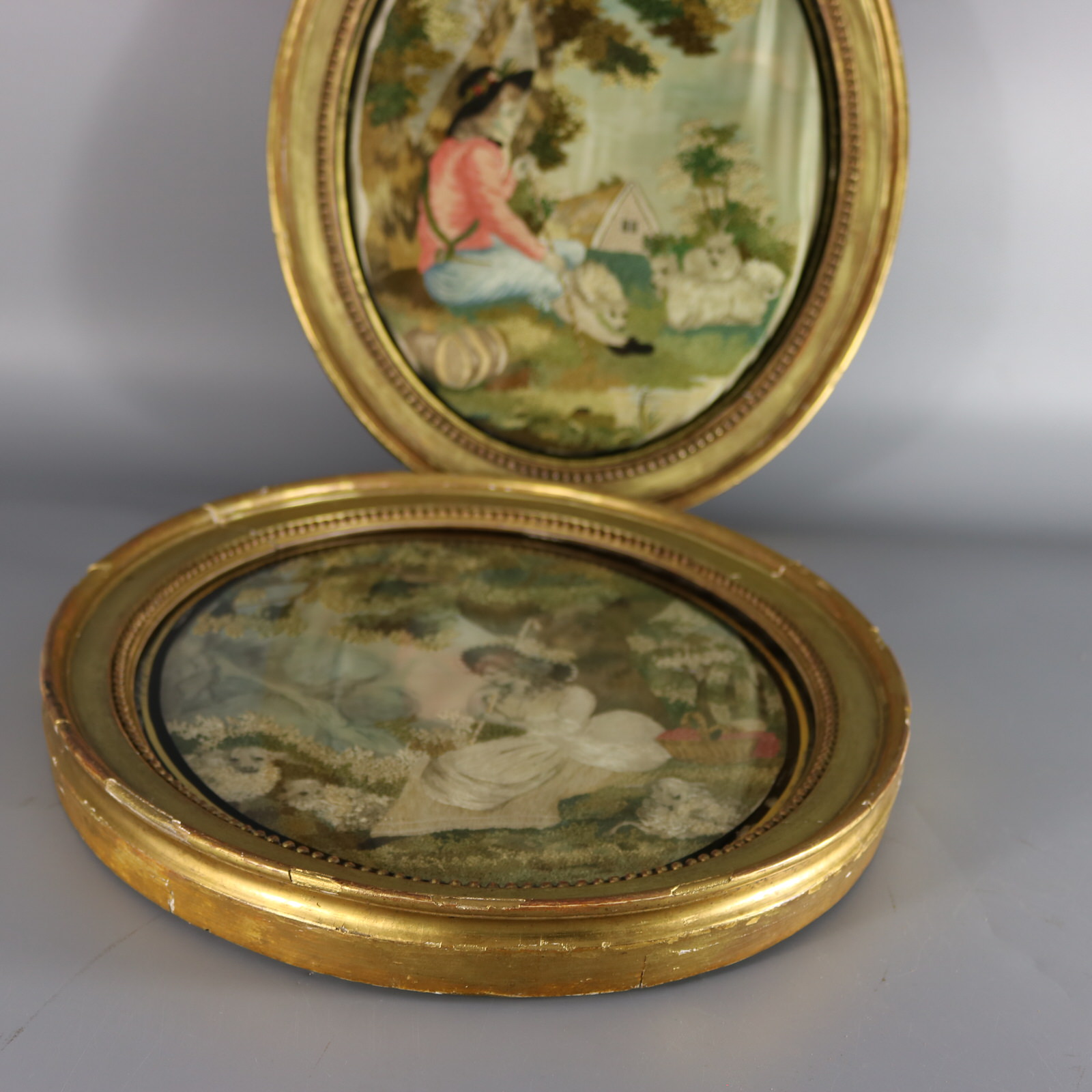 George III, circa 1800. 14.6ins high, 11.6ins wide, 1.6ins deep. Pair of oval Antique Georgian Silkwork Embroidered pictures depicting a shepherd and shepherdess in a country scene.