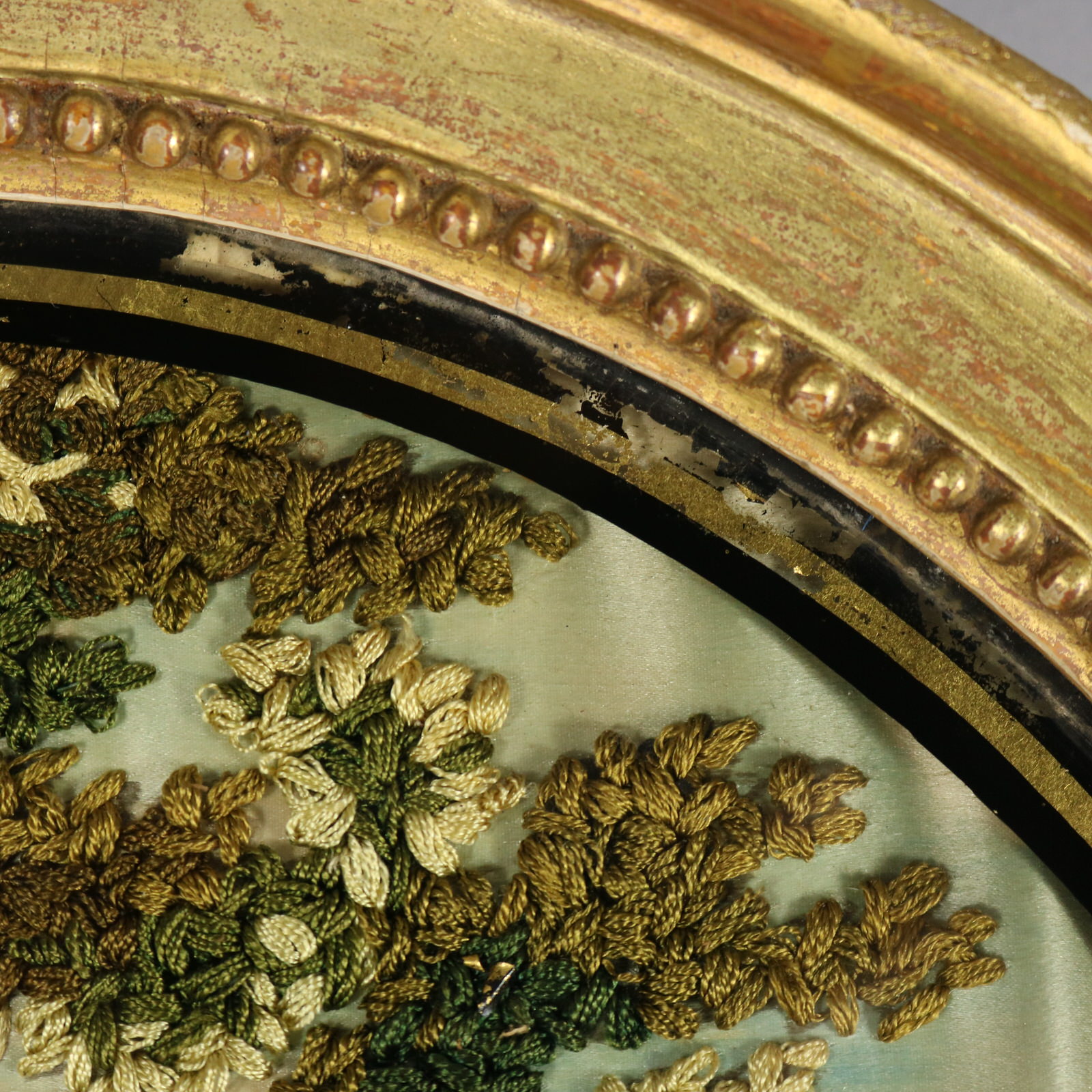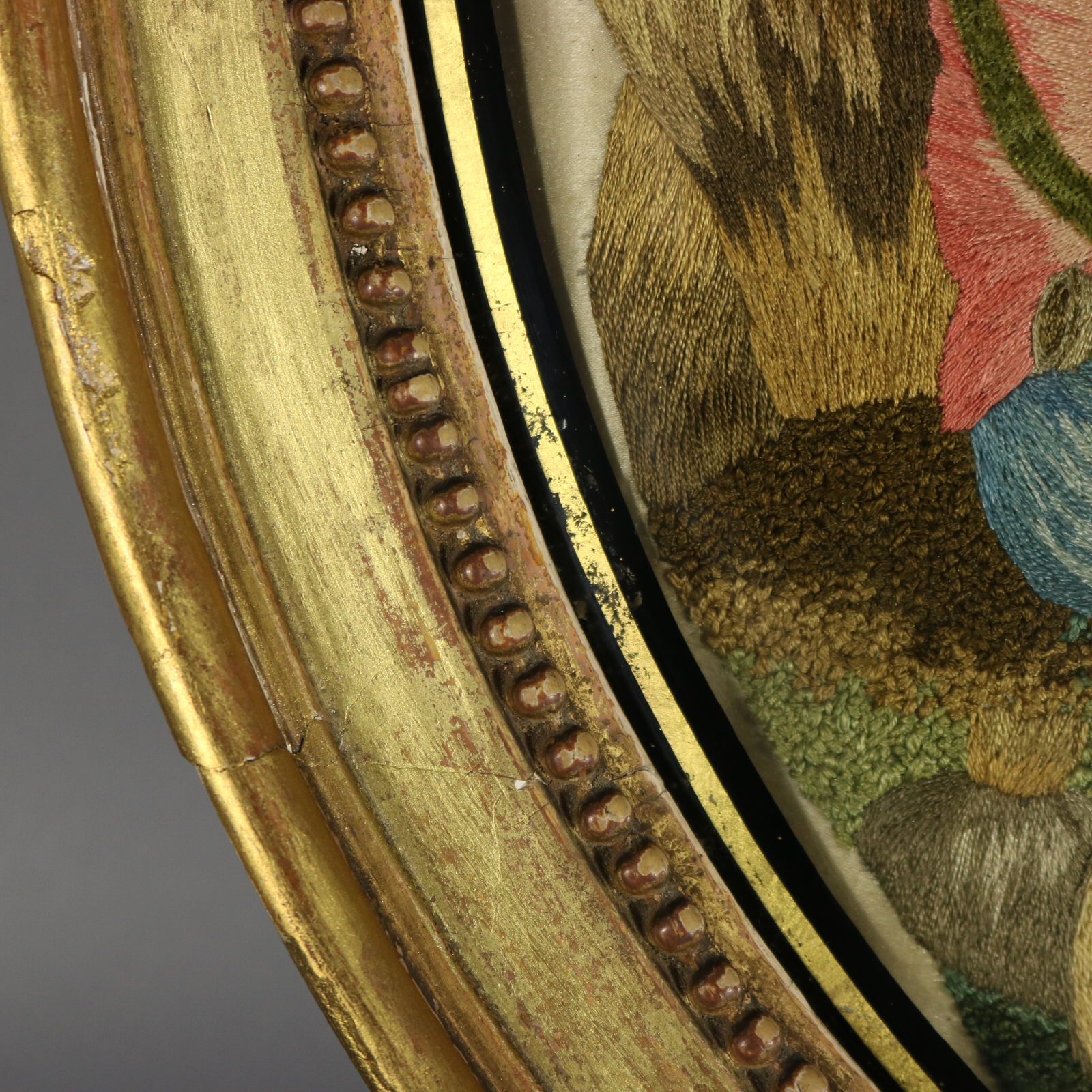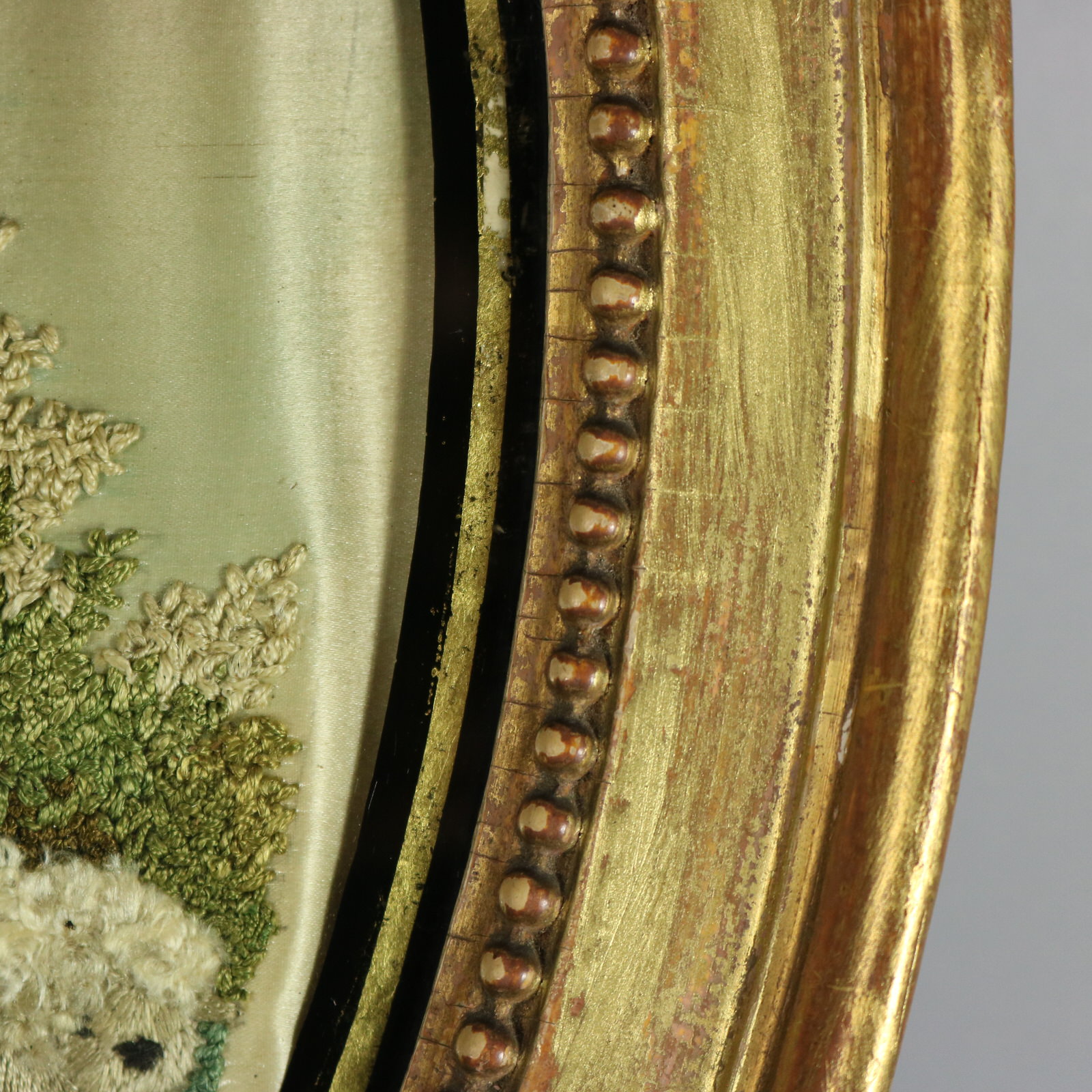 George III, circa 1800. 14.6ins high, 11.6ins wide, 1.6ins deep. Pair of oval Antique Georgian Silkwork Embroidered pictures depicting a shepherd and shepherdess in a country scene.
