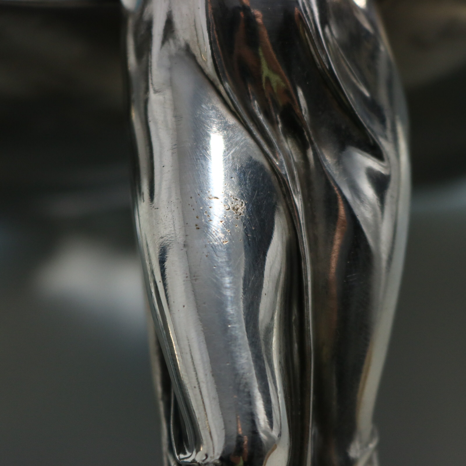 Circa 1910. 8.3ins high, 11.6ins wide, 8.7ins deep. WMF Art Nouveau visiting card tray decorated with a fairy standing before two large lily leaves, holding a dove in her hands.