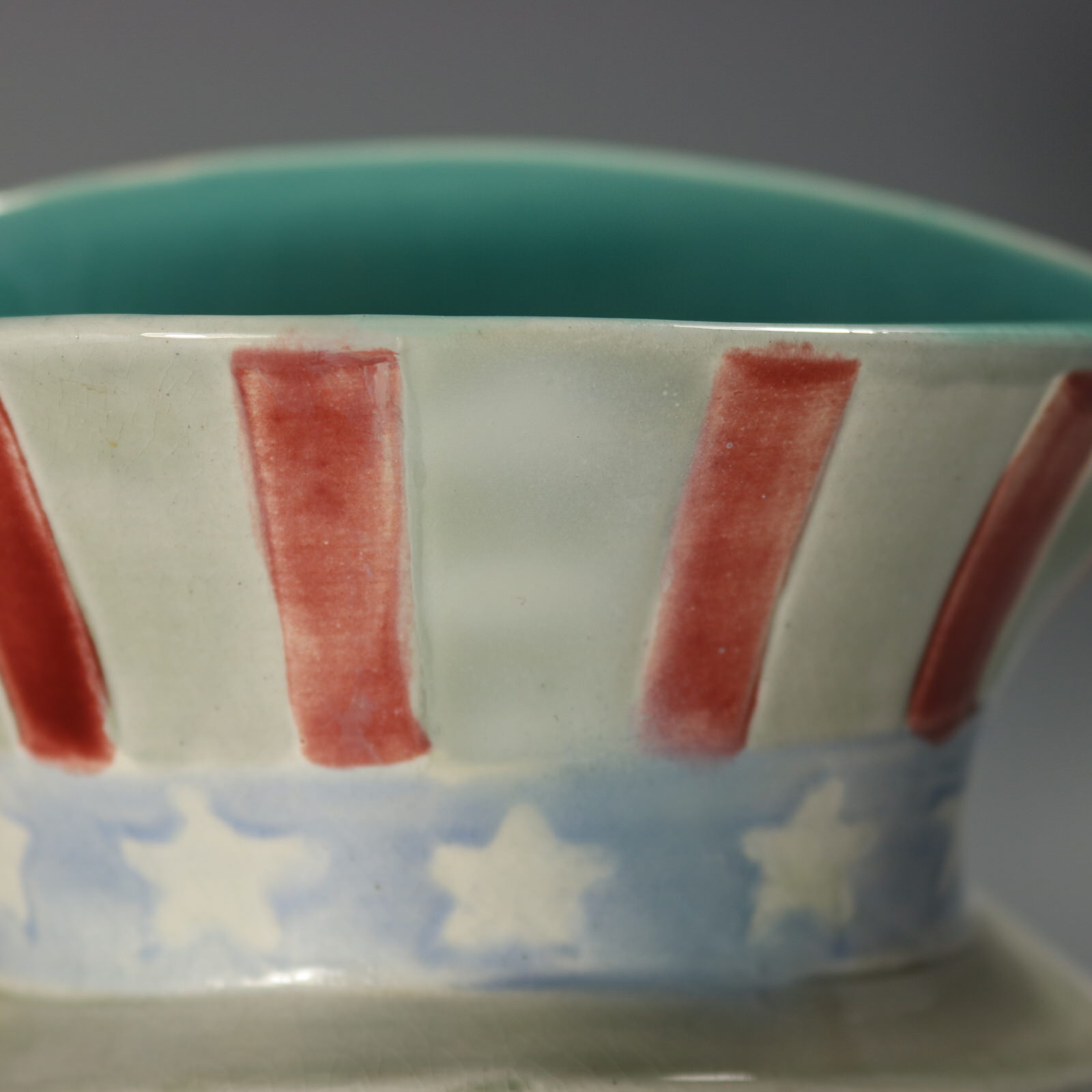 This jug represents 'Uncle Sam,' a national personification of the USA. Colouration: pink, grey, blue, are predominant.