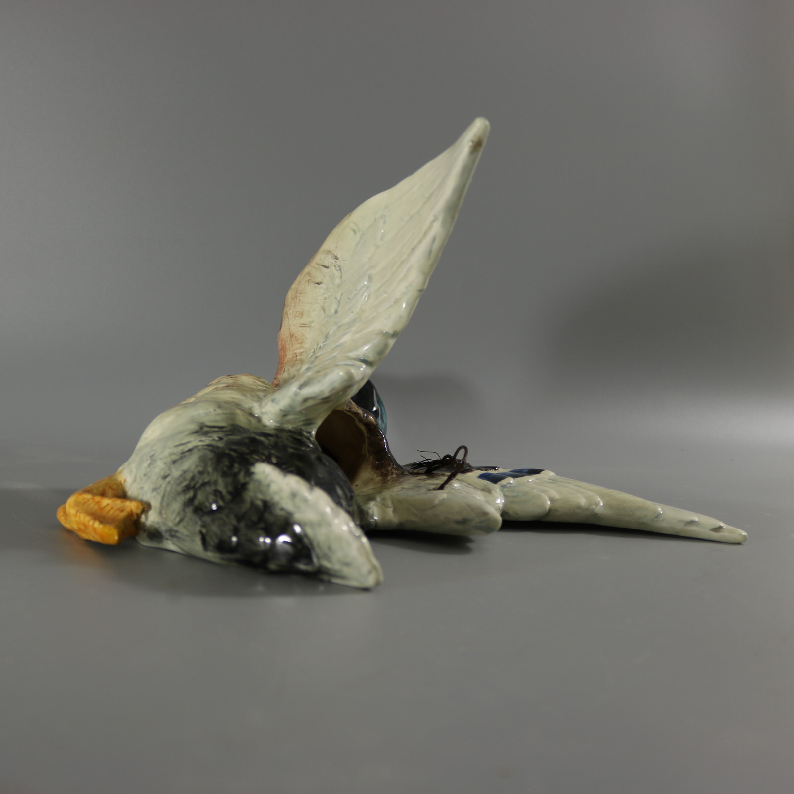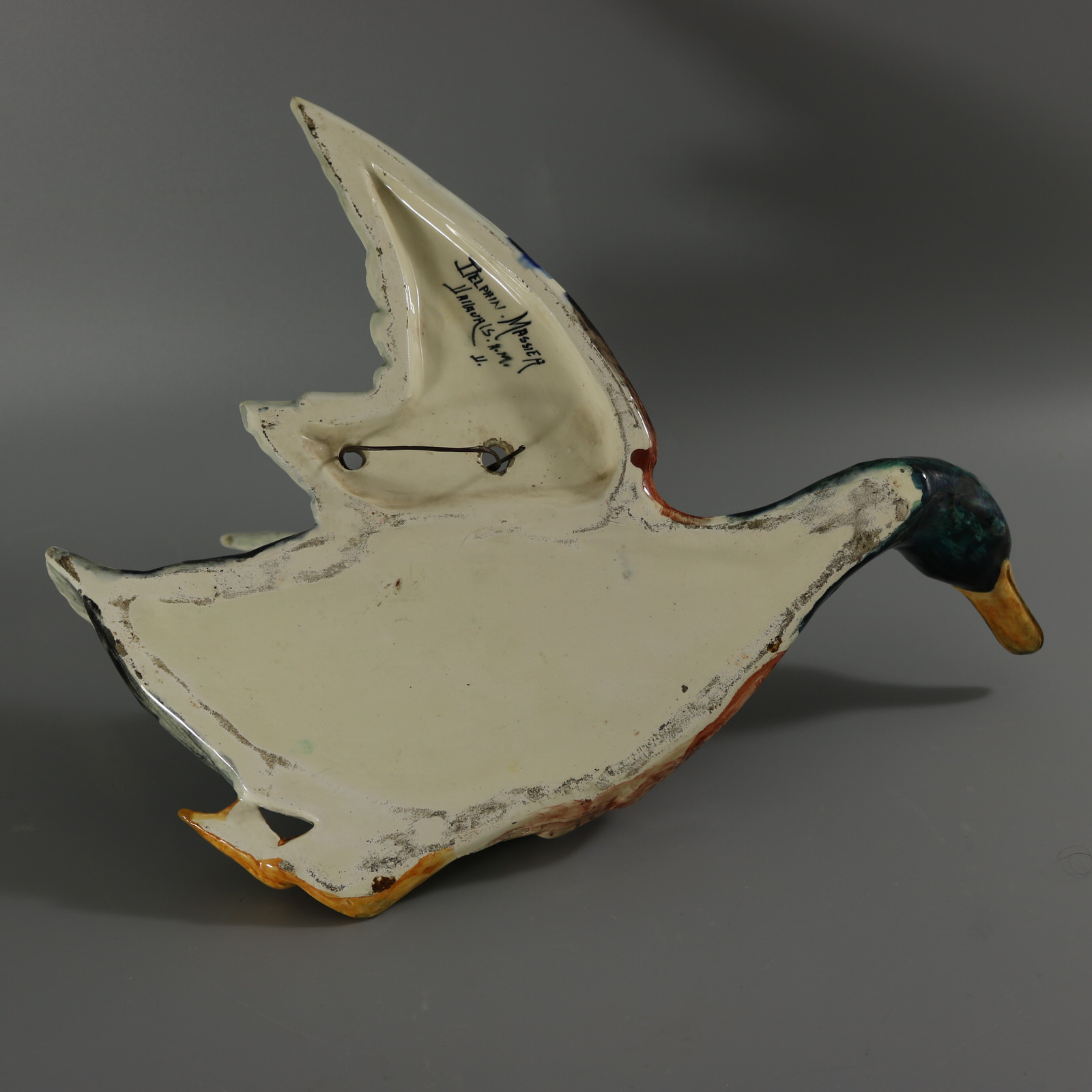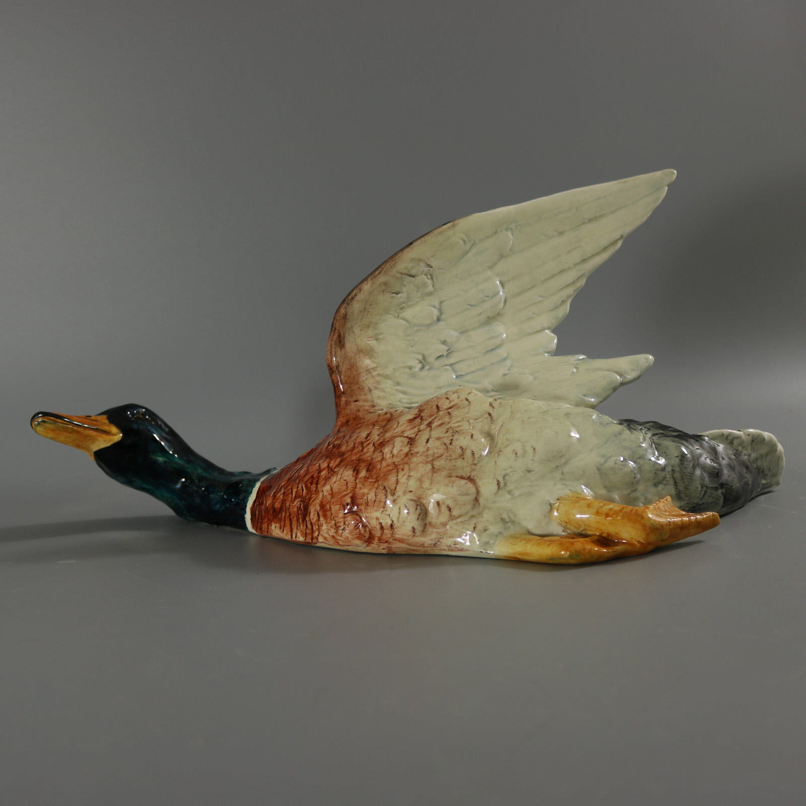 Circa 1890. 13.8ins high, 17.3ins wide, 9.1ins depth. Delphin Massier Majolica wall pocket which features a duck (mallard) in flight, with wings raised.