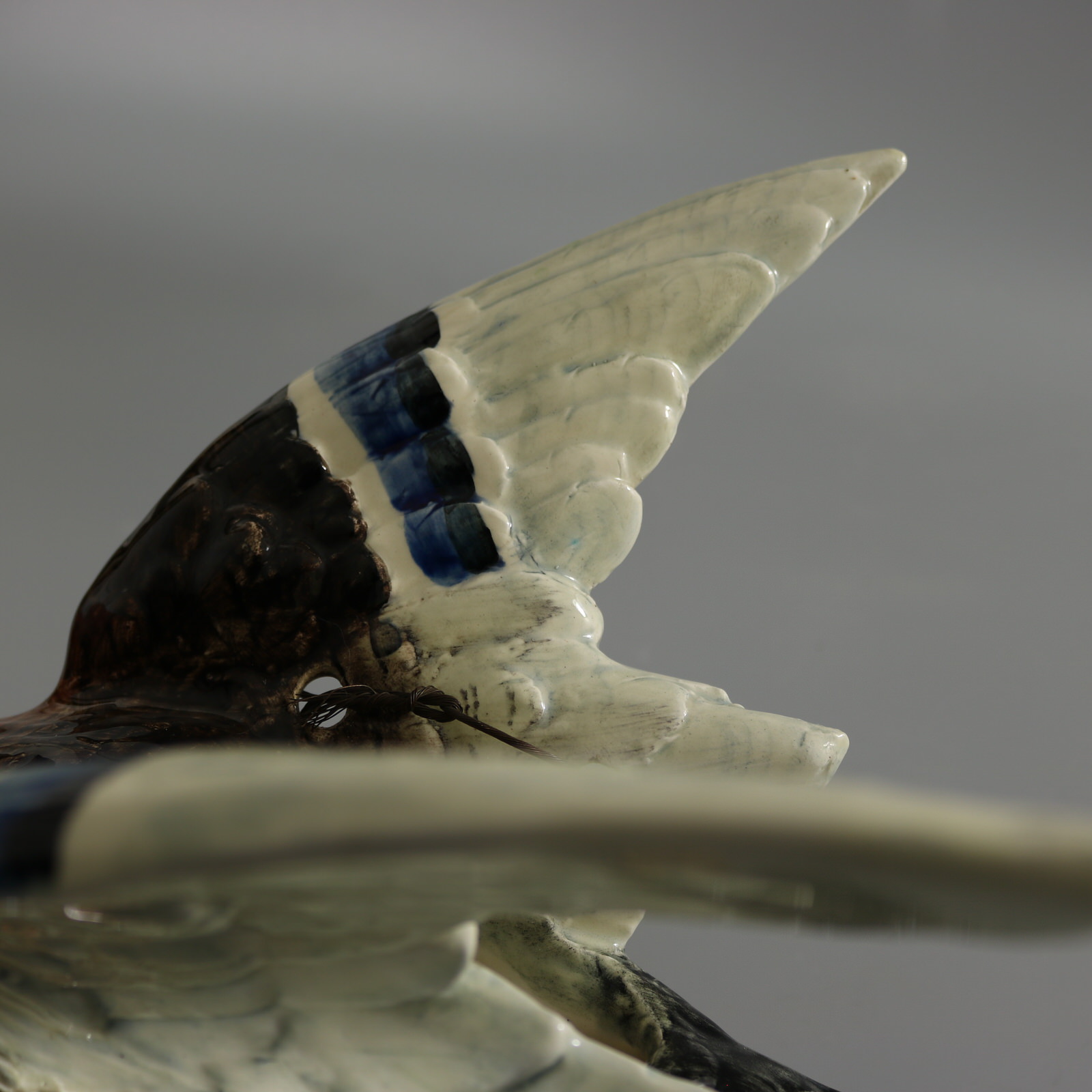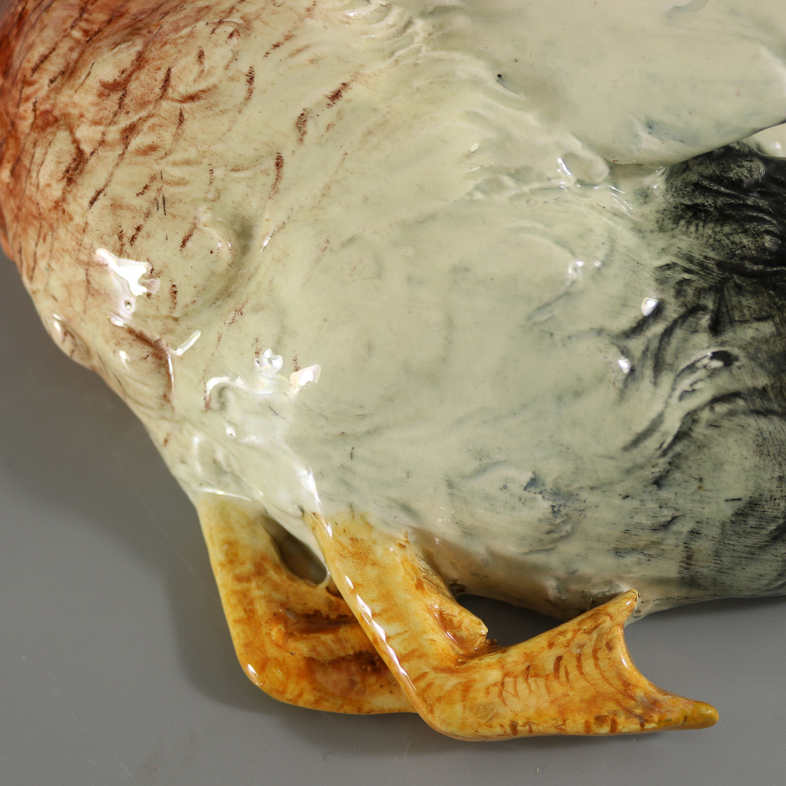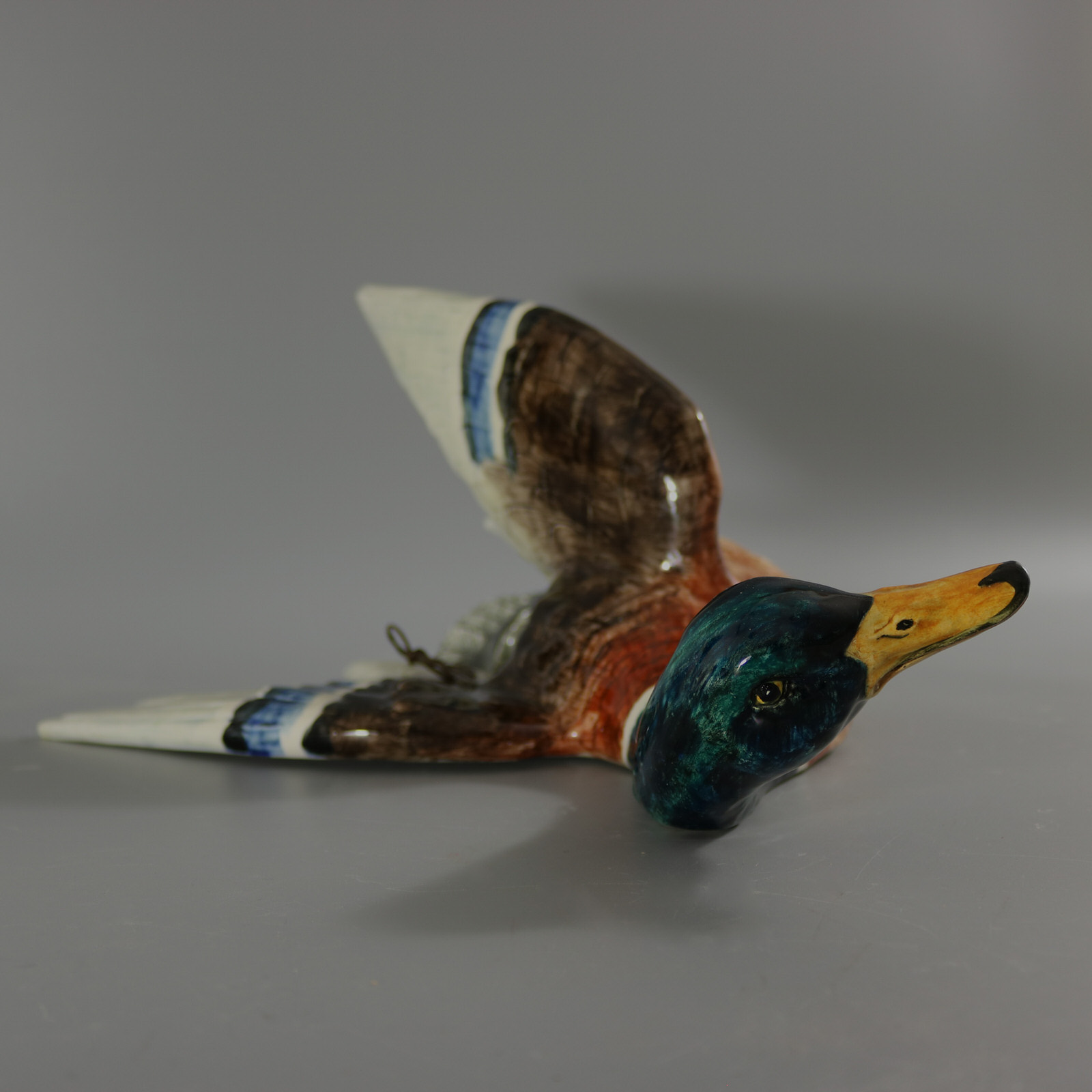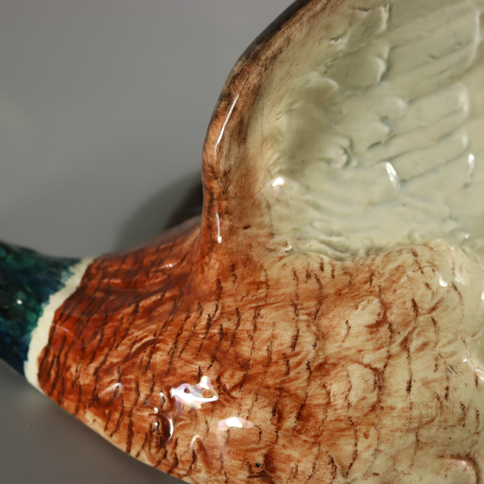 Circa 1890. 13.8ins high, 17.3ins wide, 9.1ins depth. Delphin Massier Majolica wall pocket which features a duck (mallard) in flight, with wings raised.