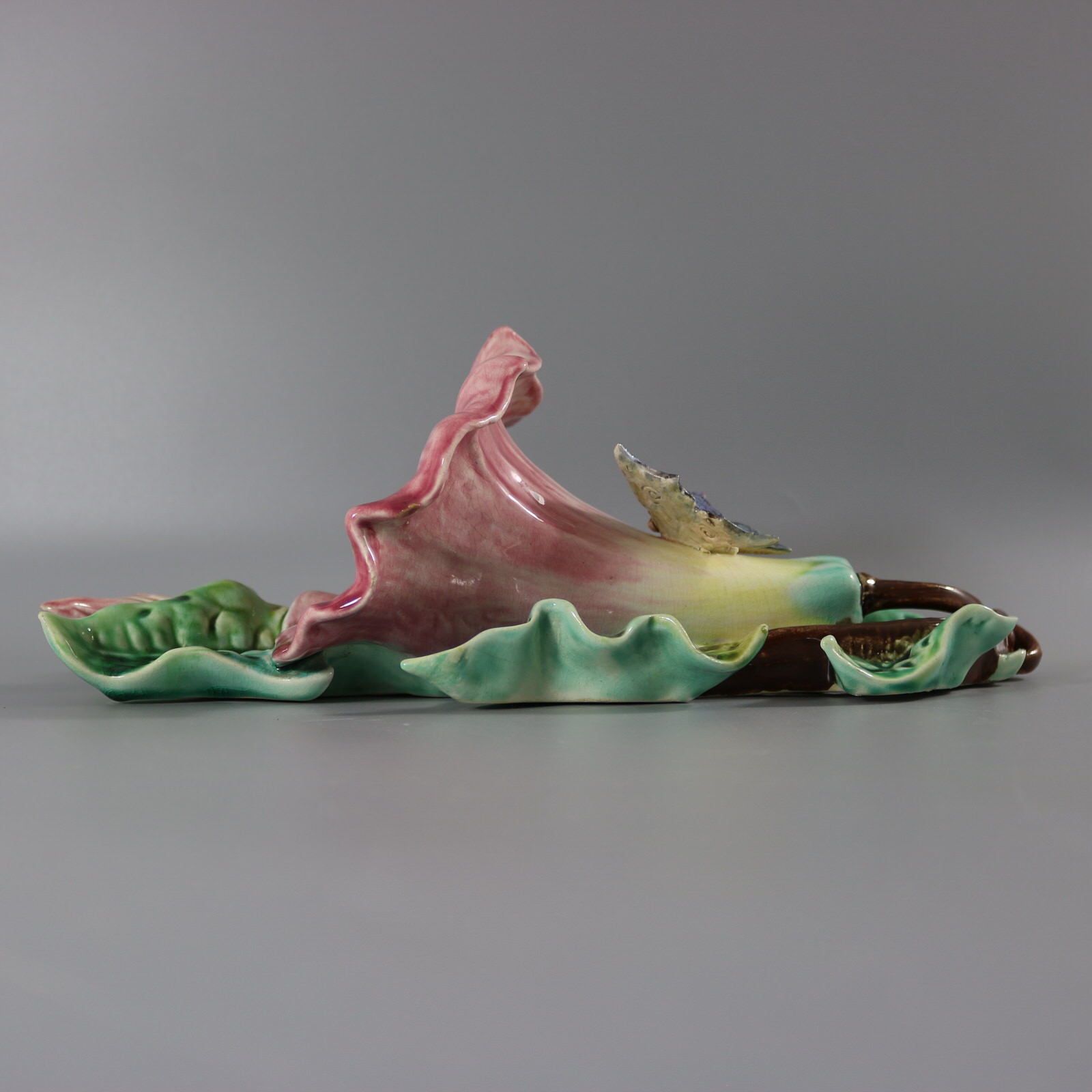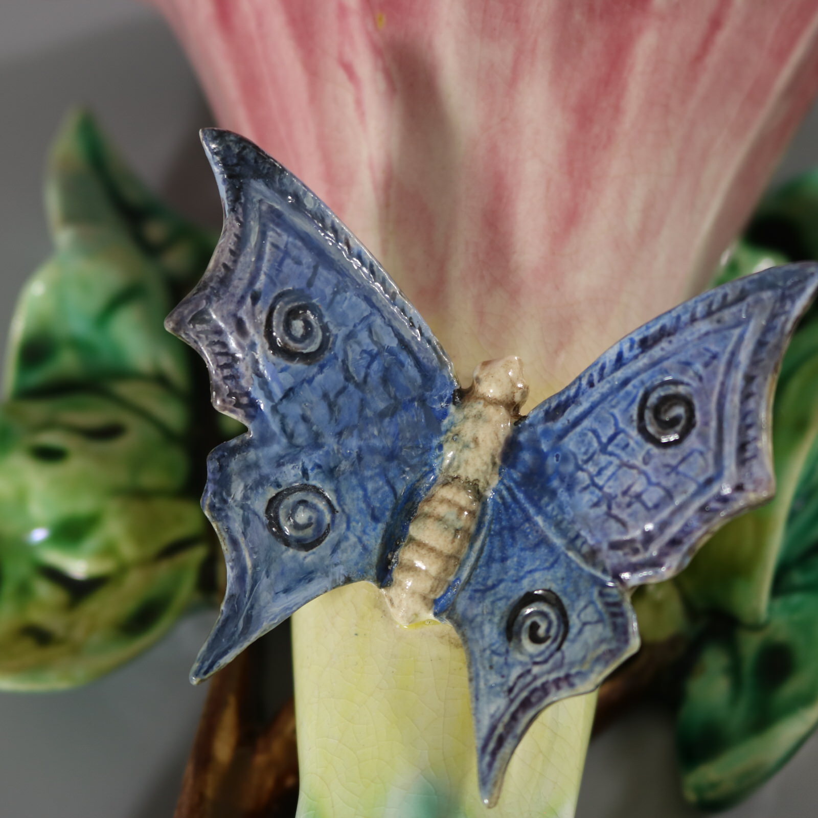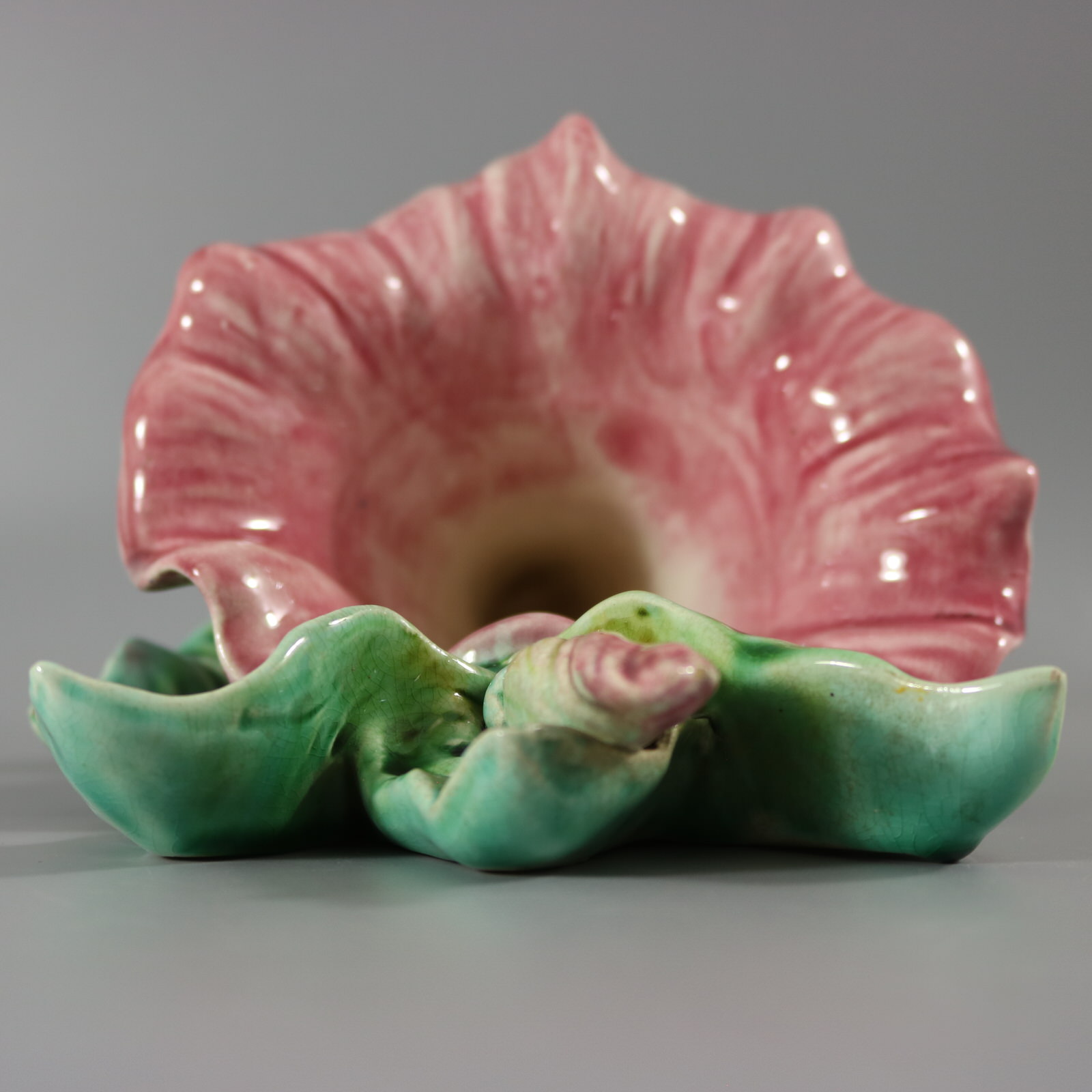 Circa 1900. 14.2ins high, 7.1ins wide, 5.1ins depth. Fives-Lille Majolica wall pocket which features a large trumpet flower on a bed of leaves.