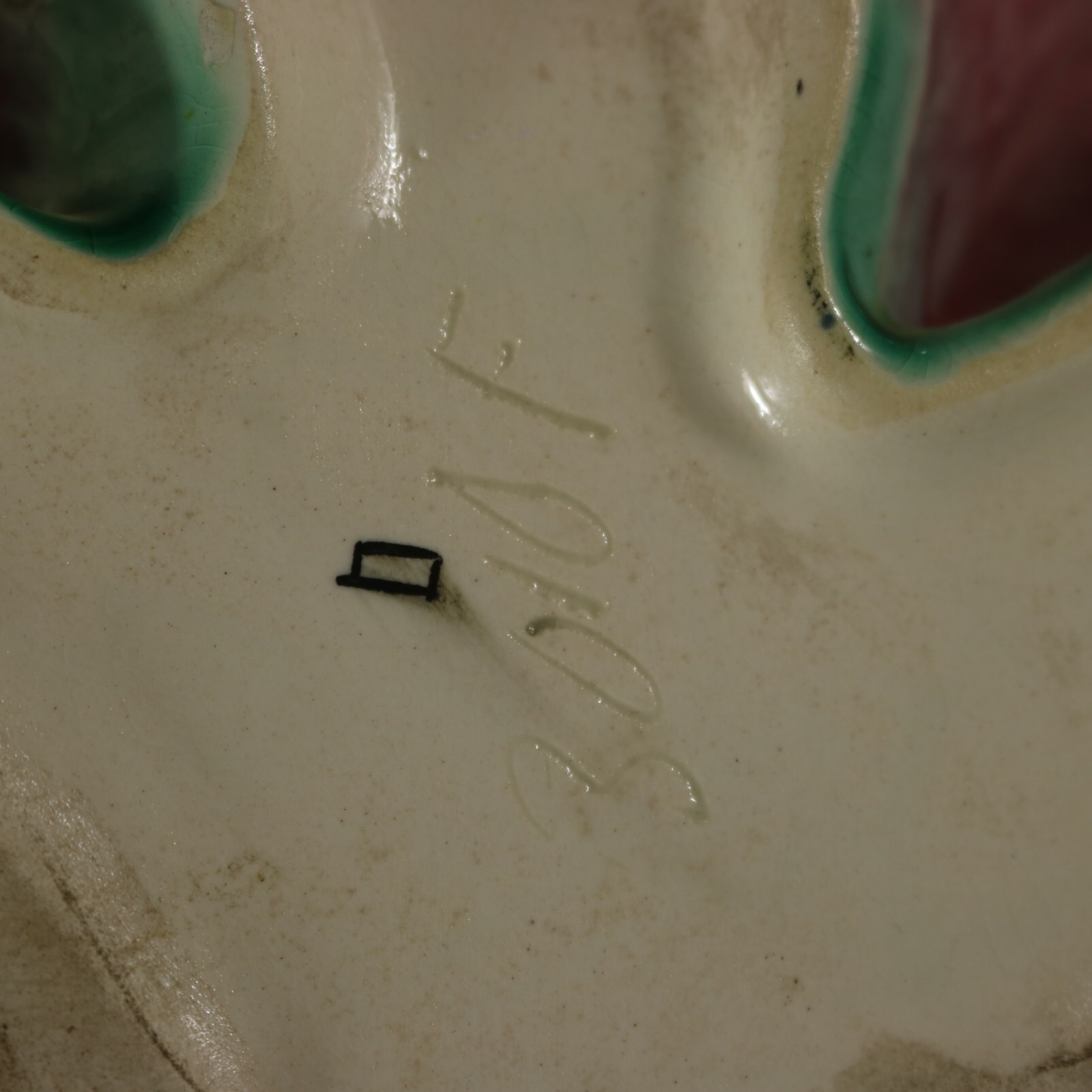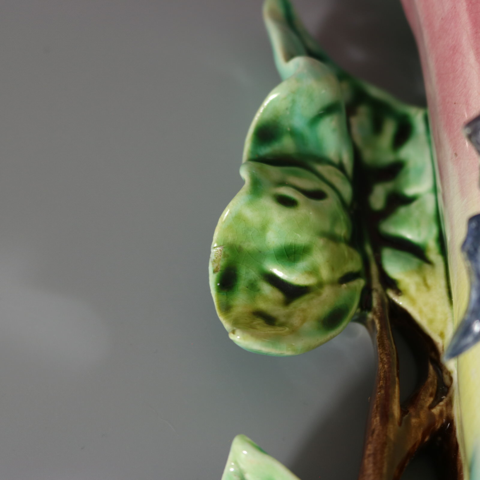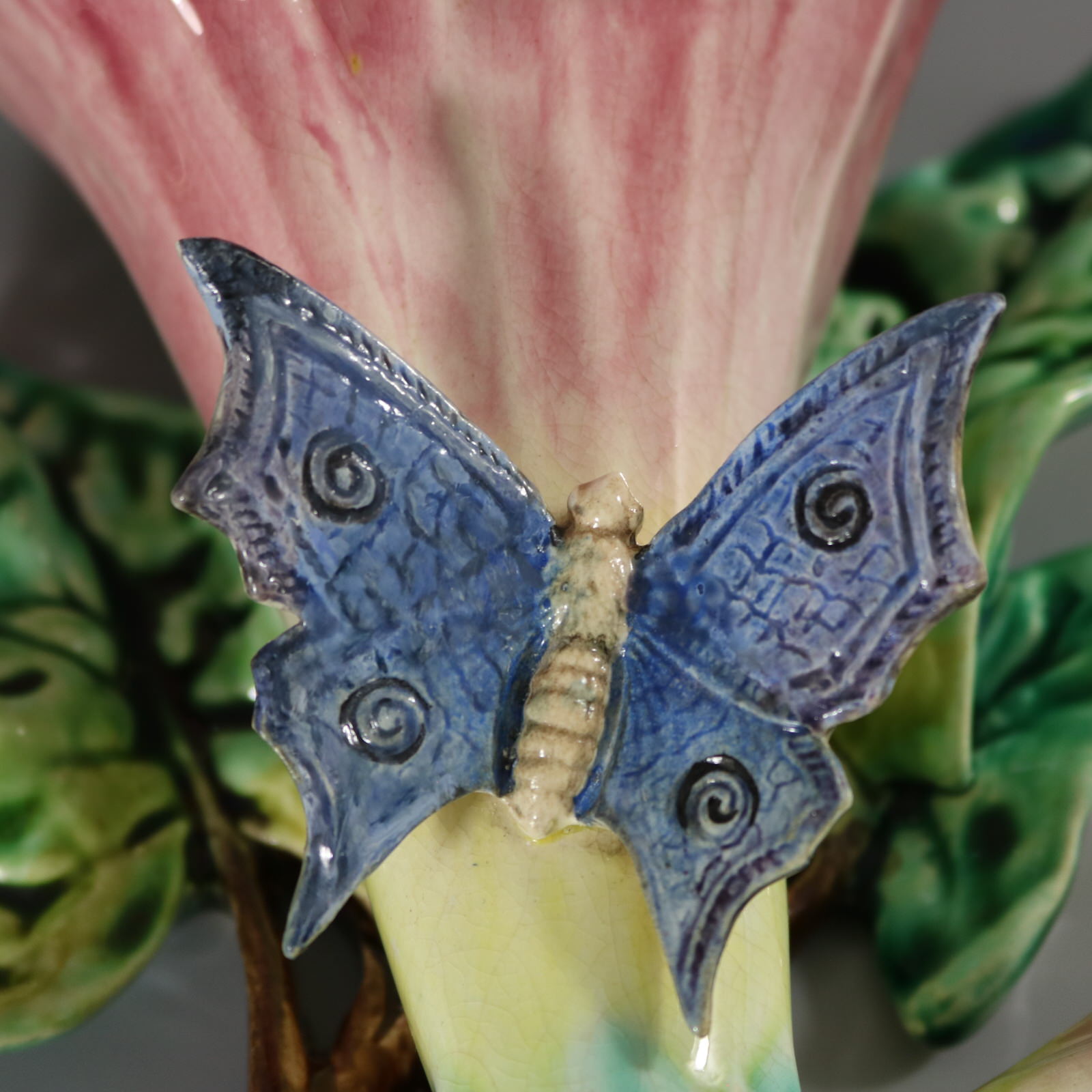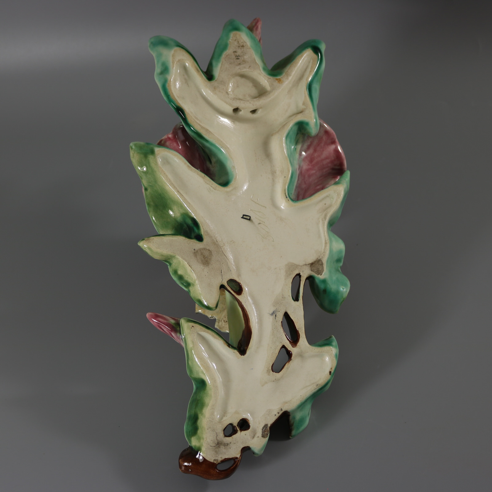 Circa 1900. 14.2ins high, 7.1ins wide, 5.1ins depth. Fives-Lille Majolica wall pocket which features a large trumpet flower on a bed of leaves.