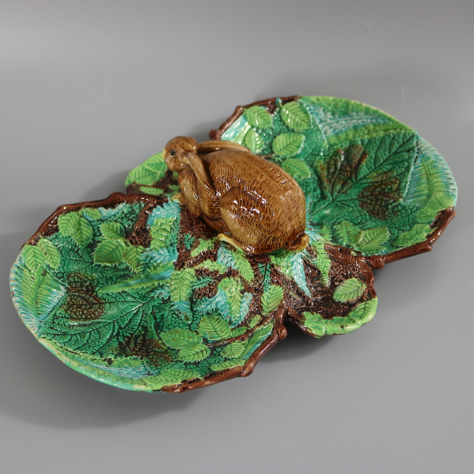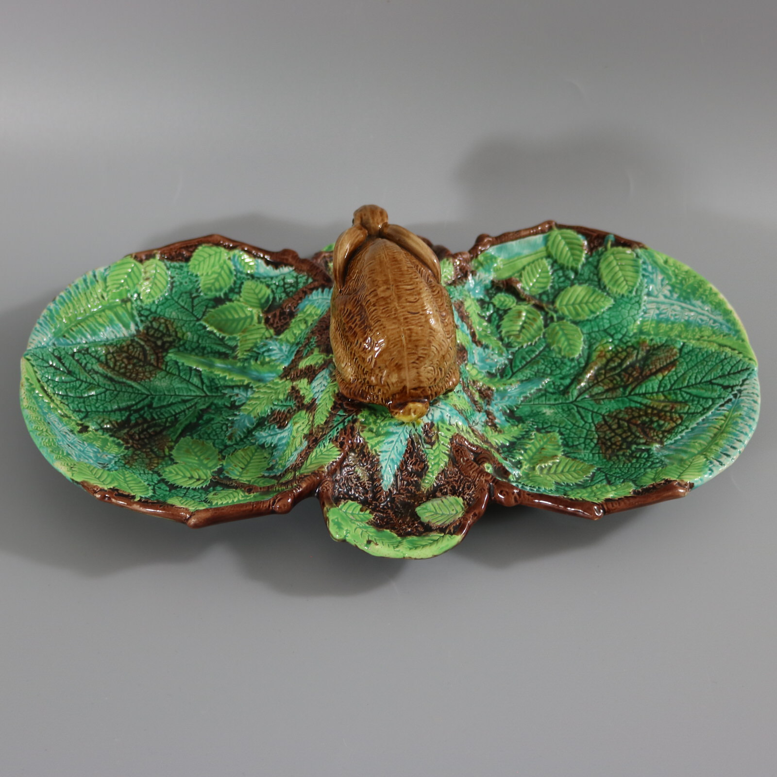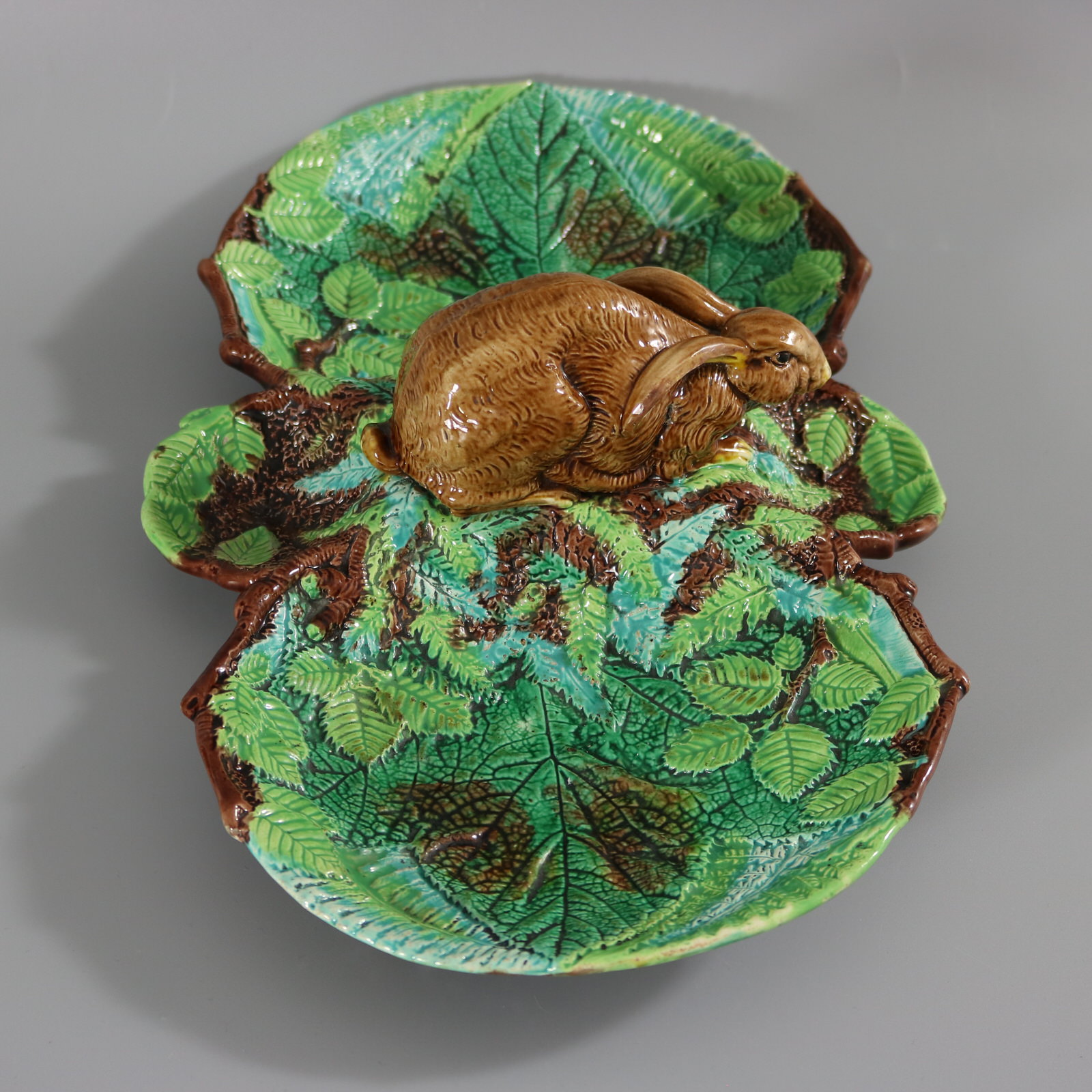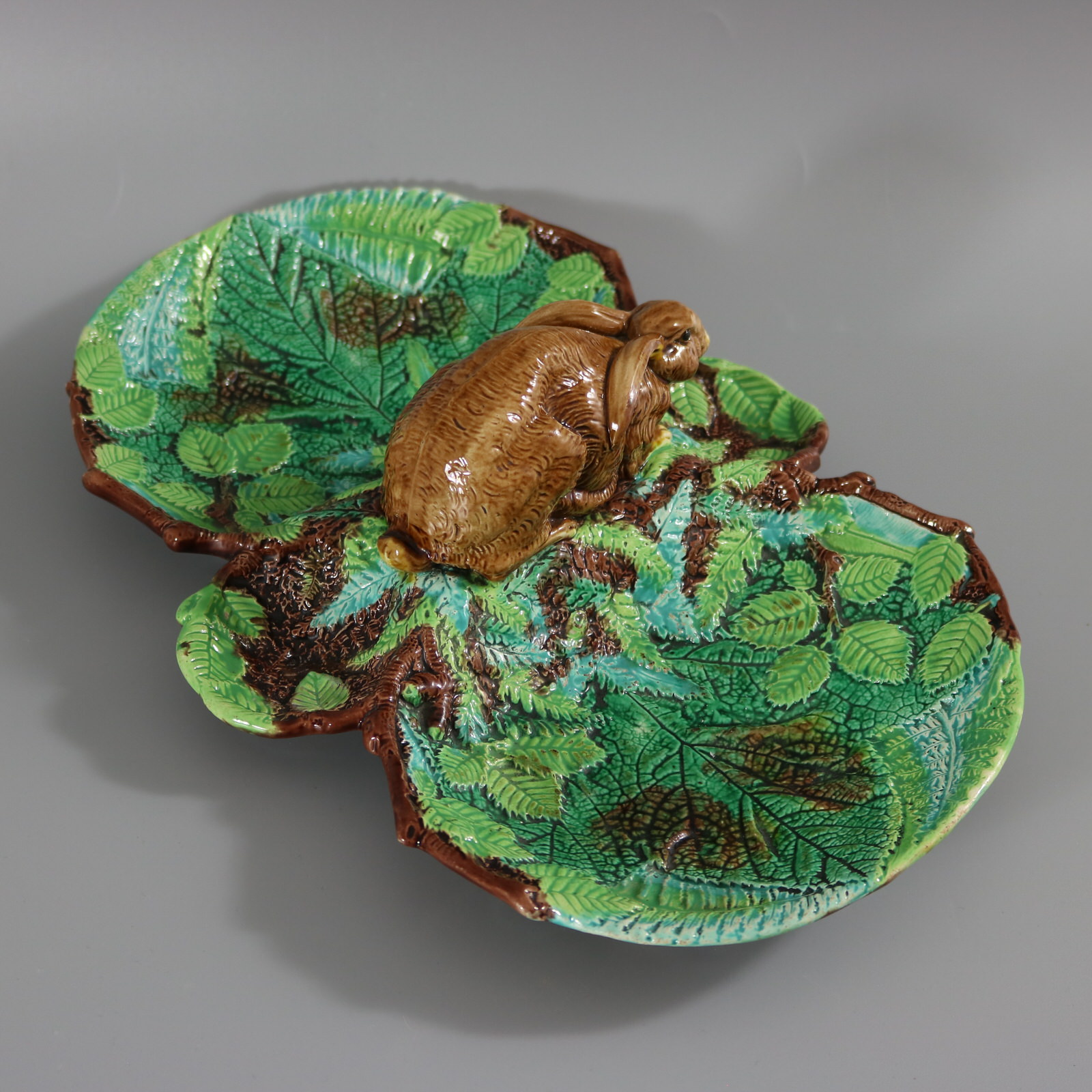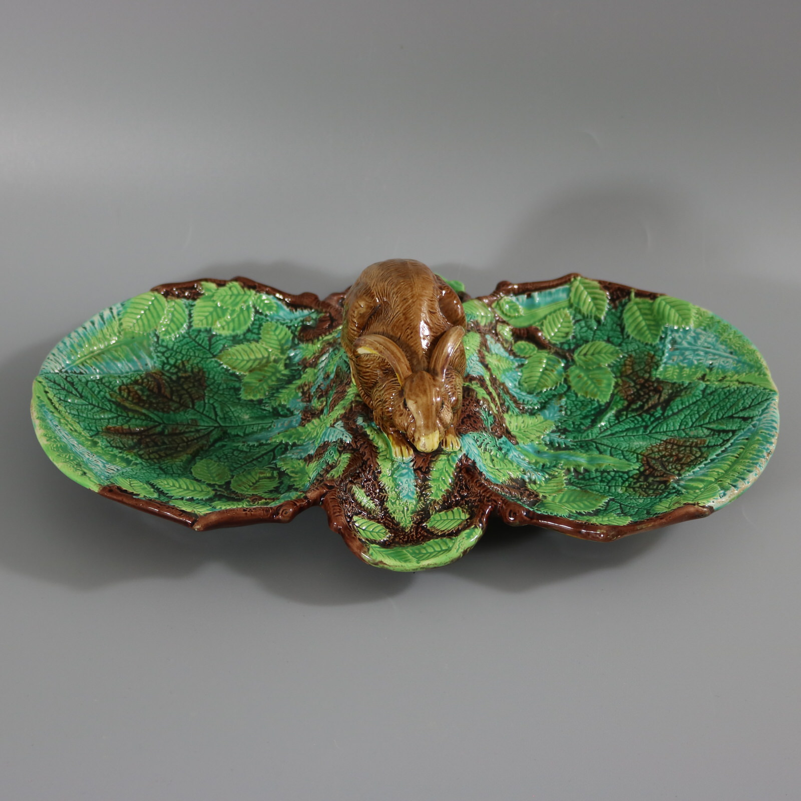 Victorian, circa 1869. 3.5ins high, 13.2ins wide, 8.7ins depth. George Jones Majolica nut dish which features a rabbit handle to the centre.