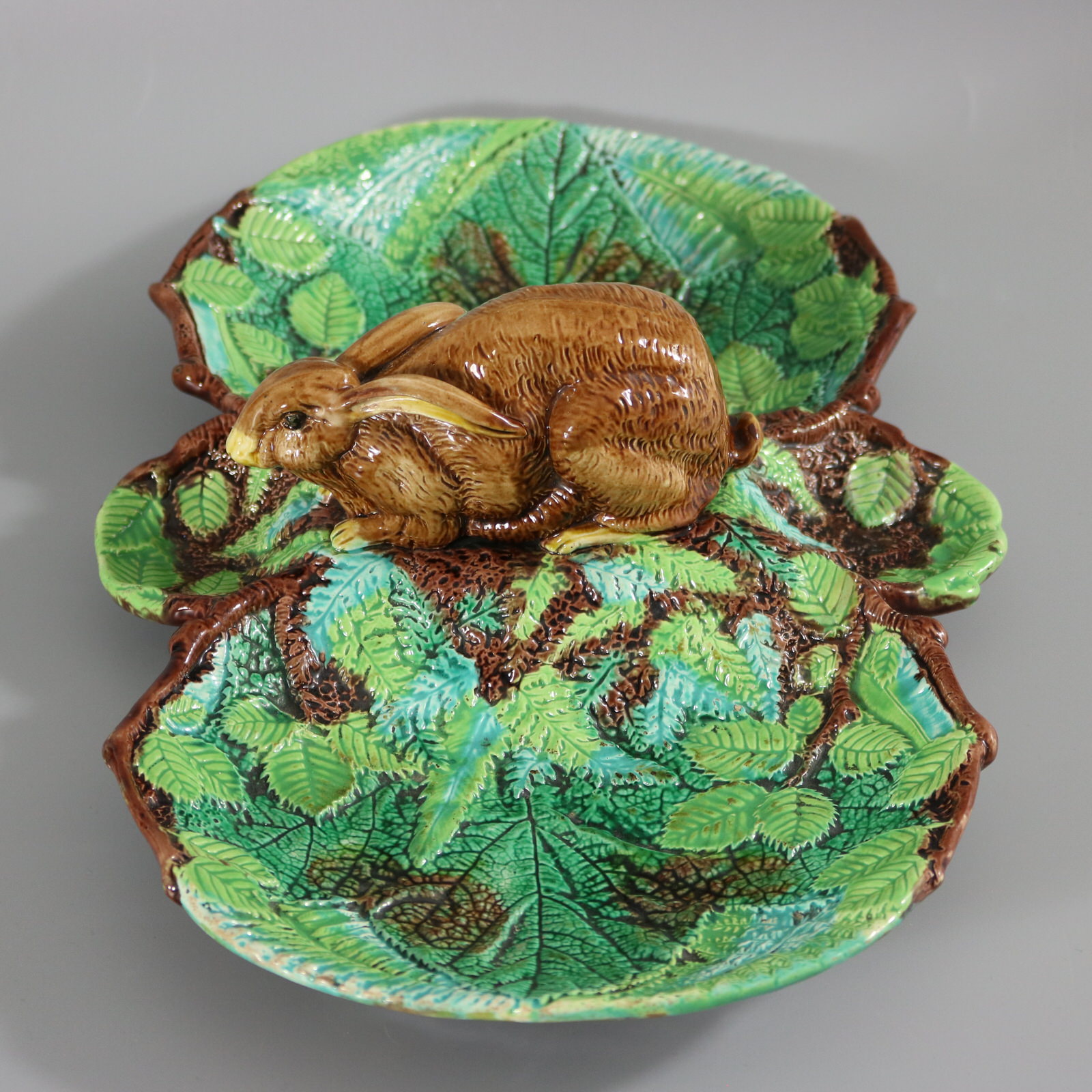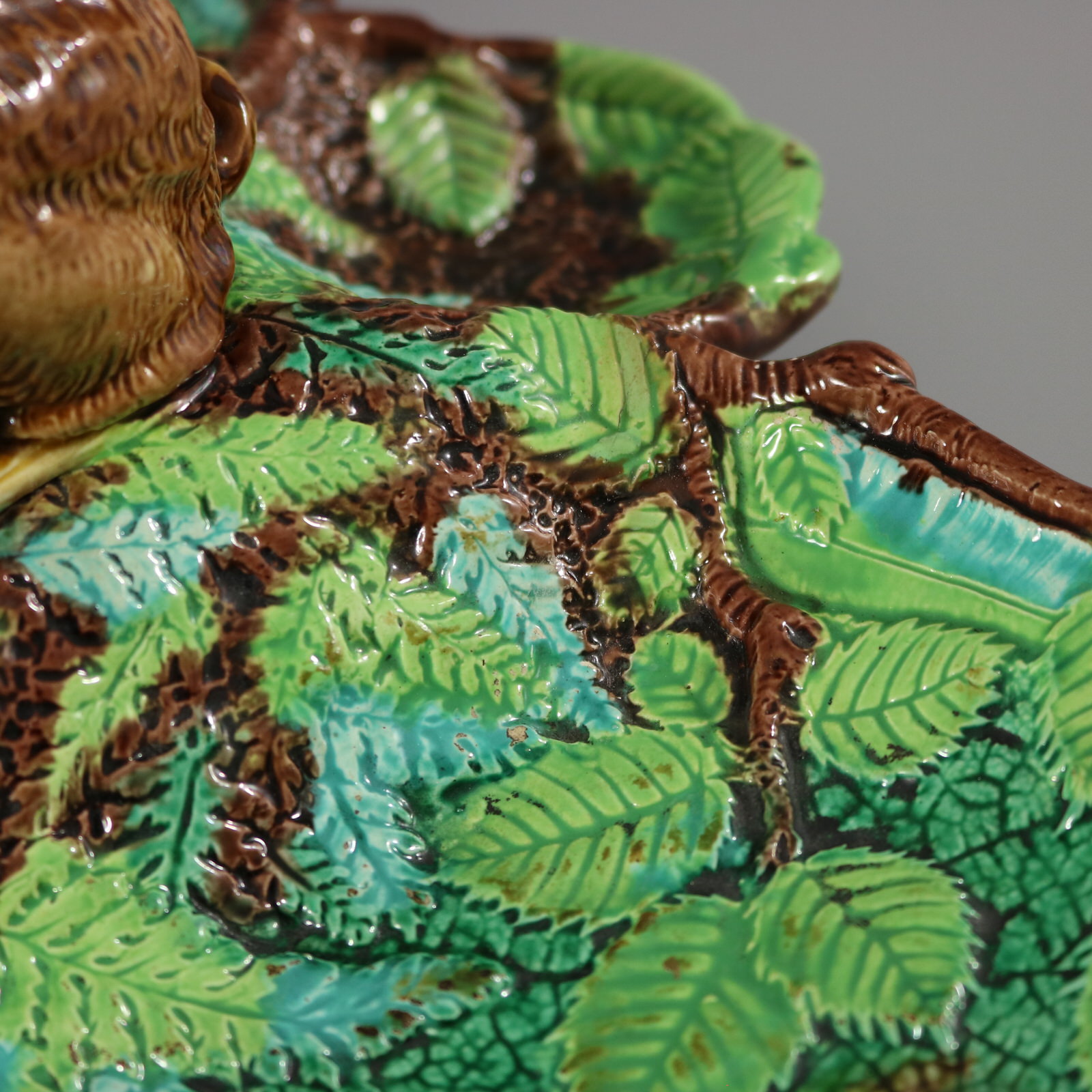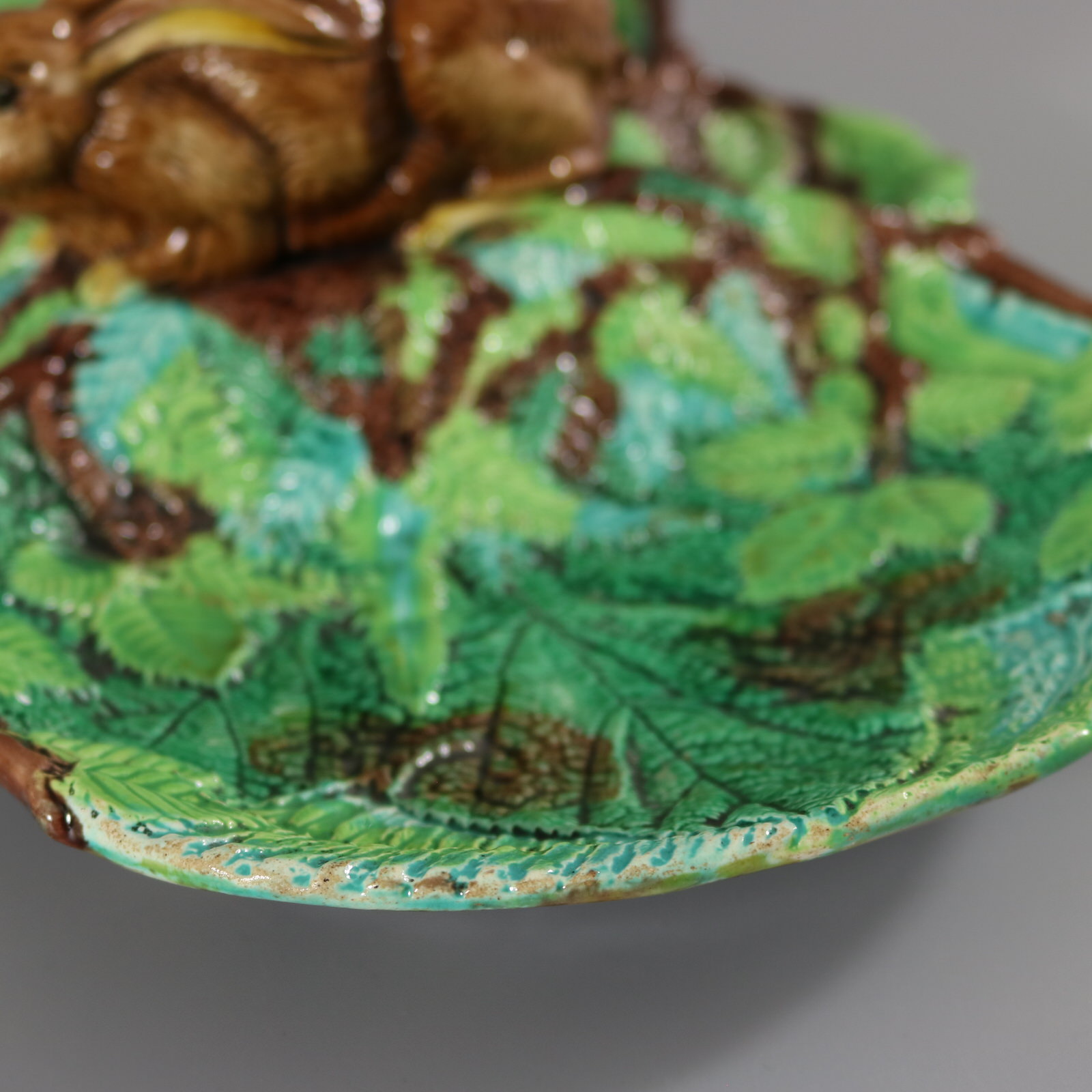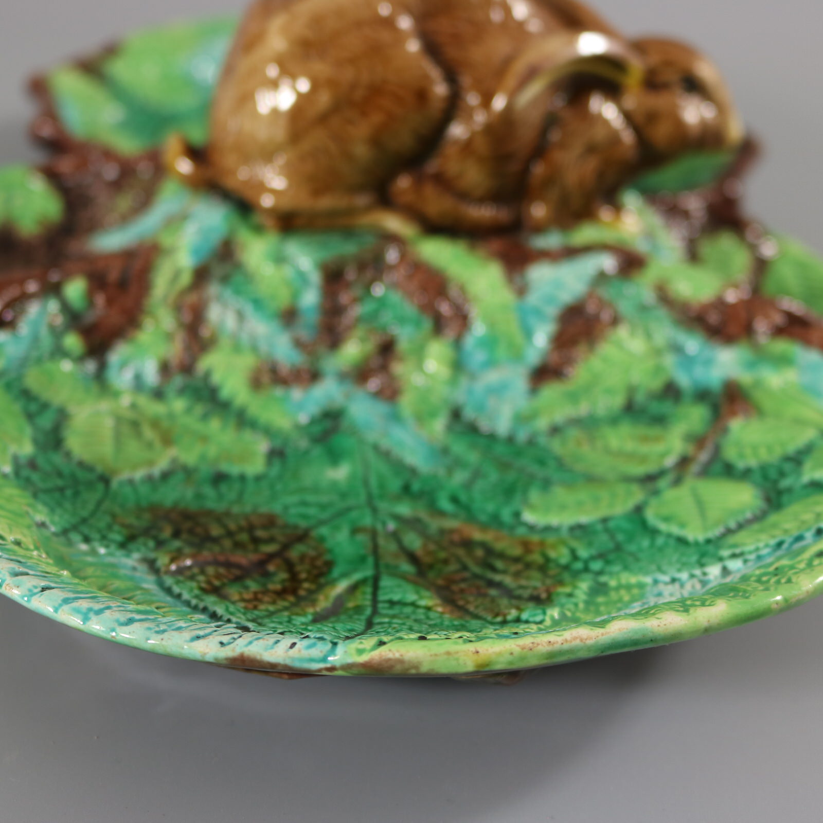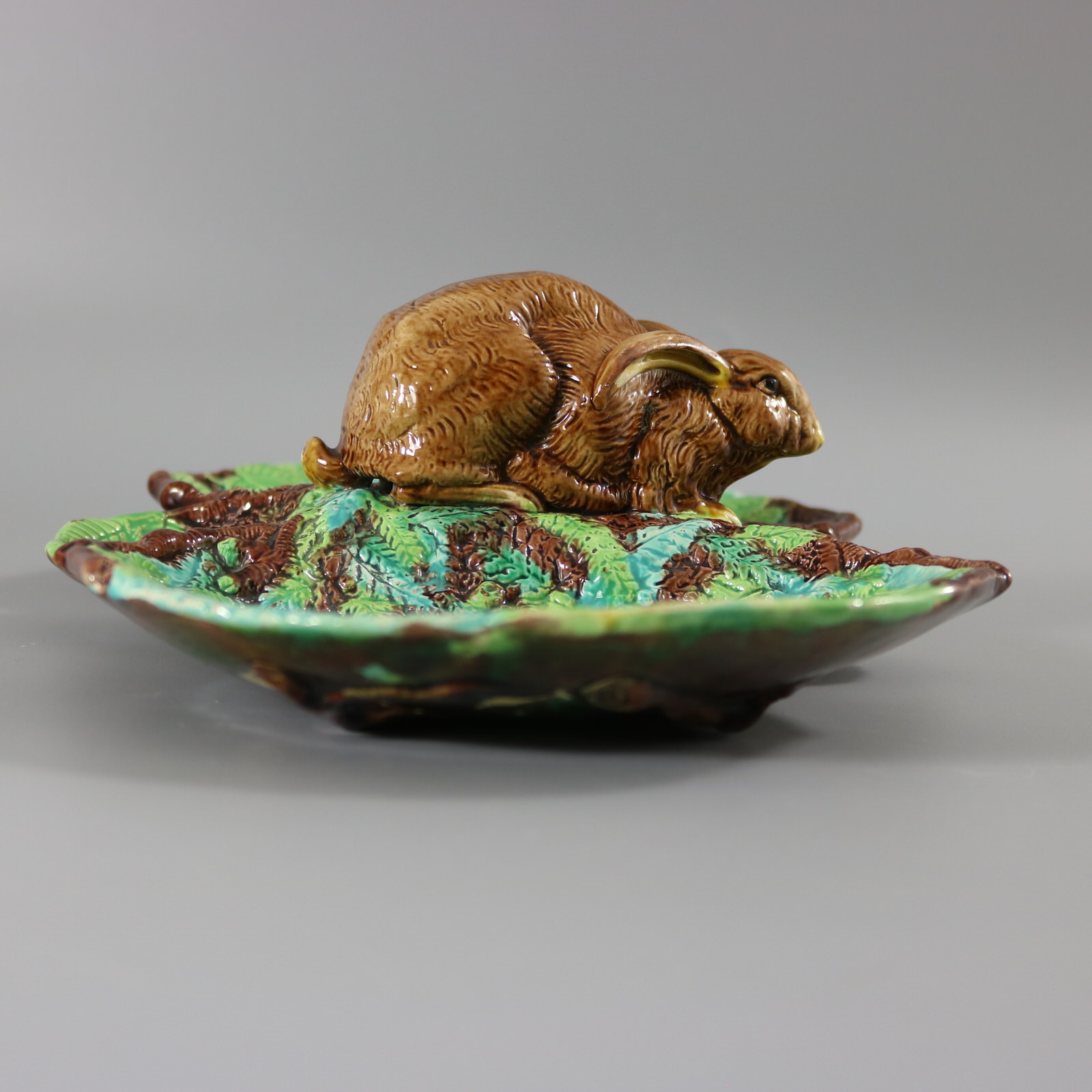Victorian, circa 1869. 3.5ins high, 13.2ins wide, 8.7ins depth. George Jones Majolica nut dish which features a rabbit handle to the centre.
