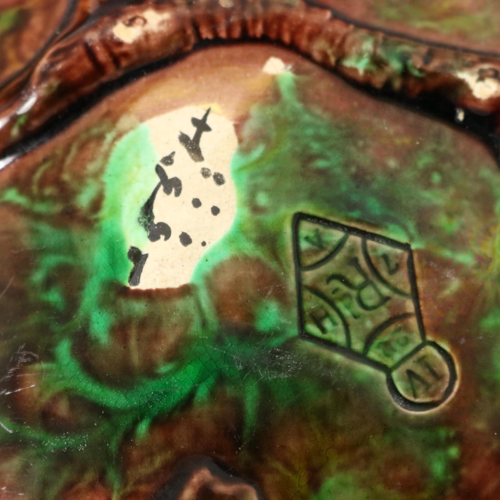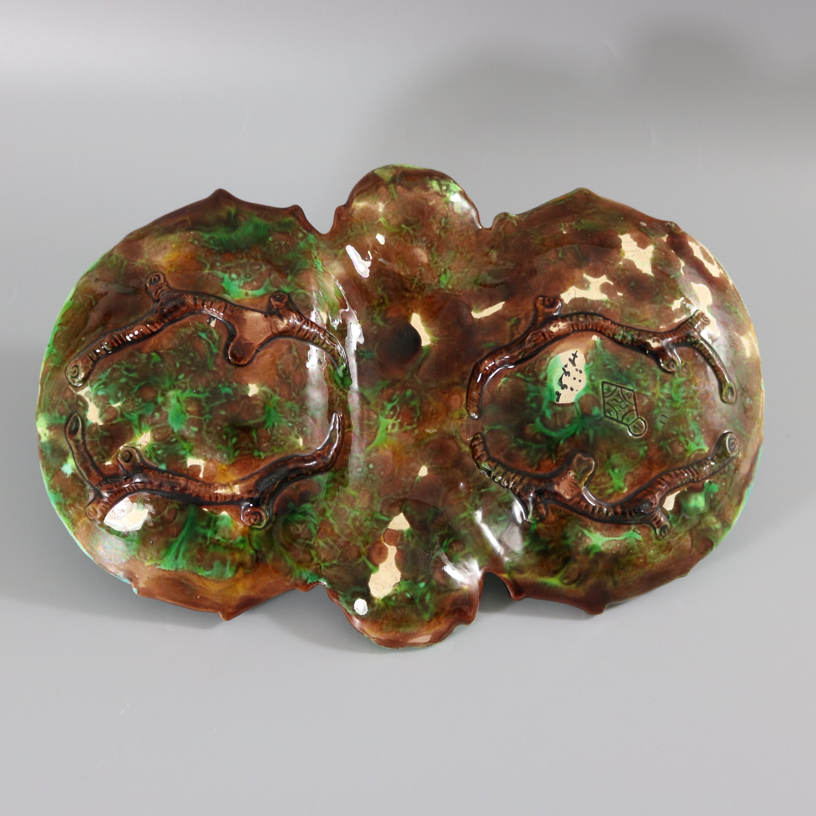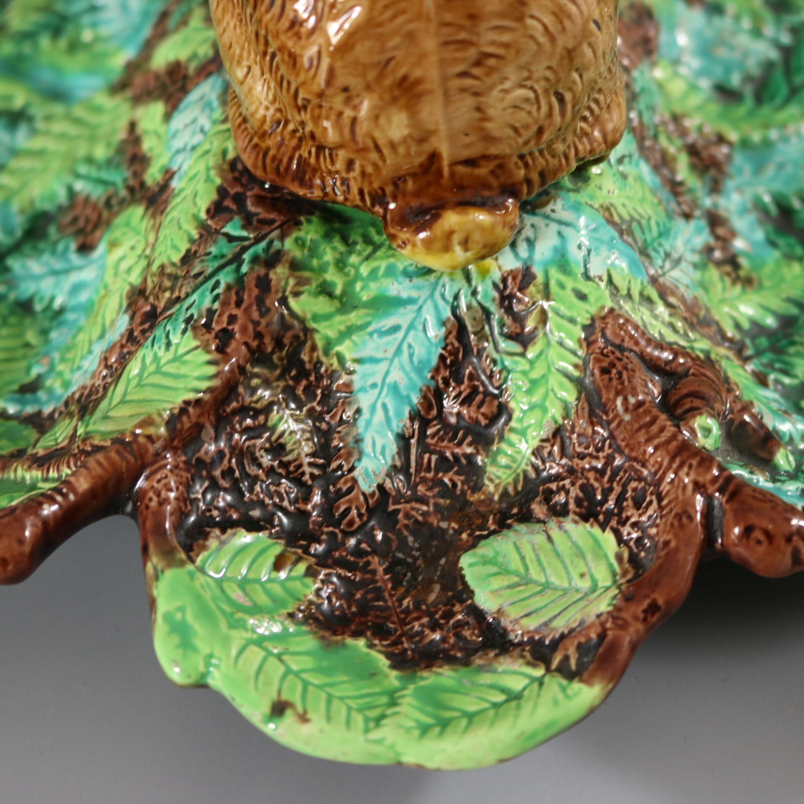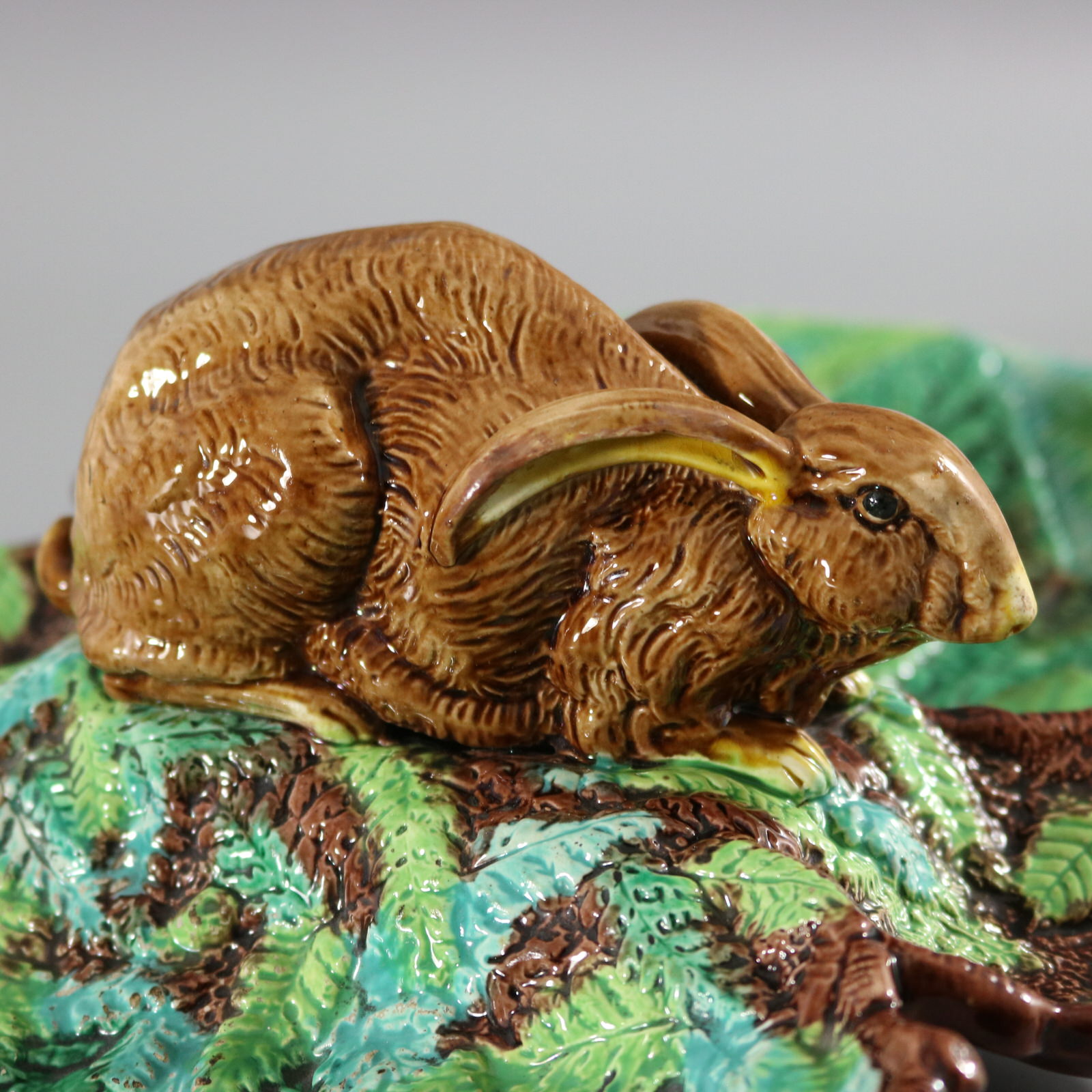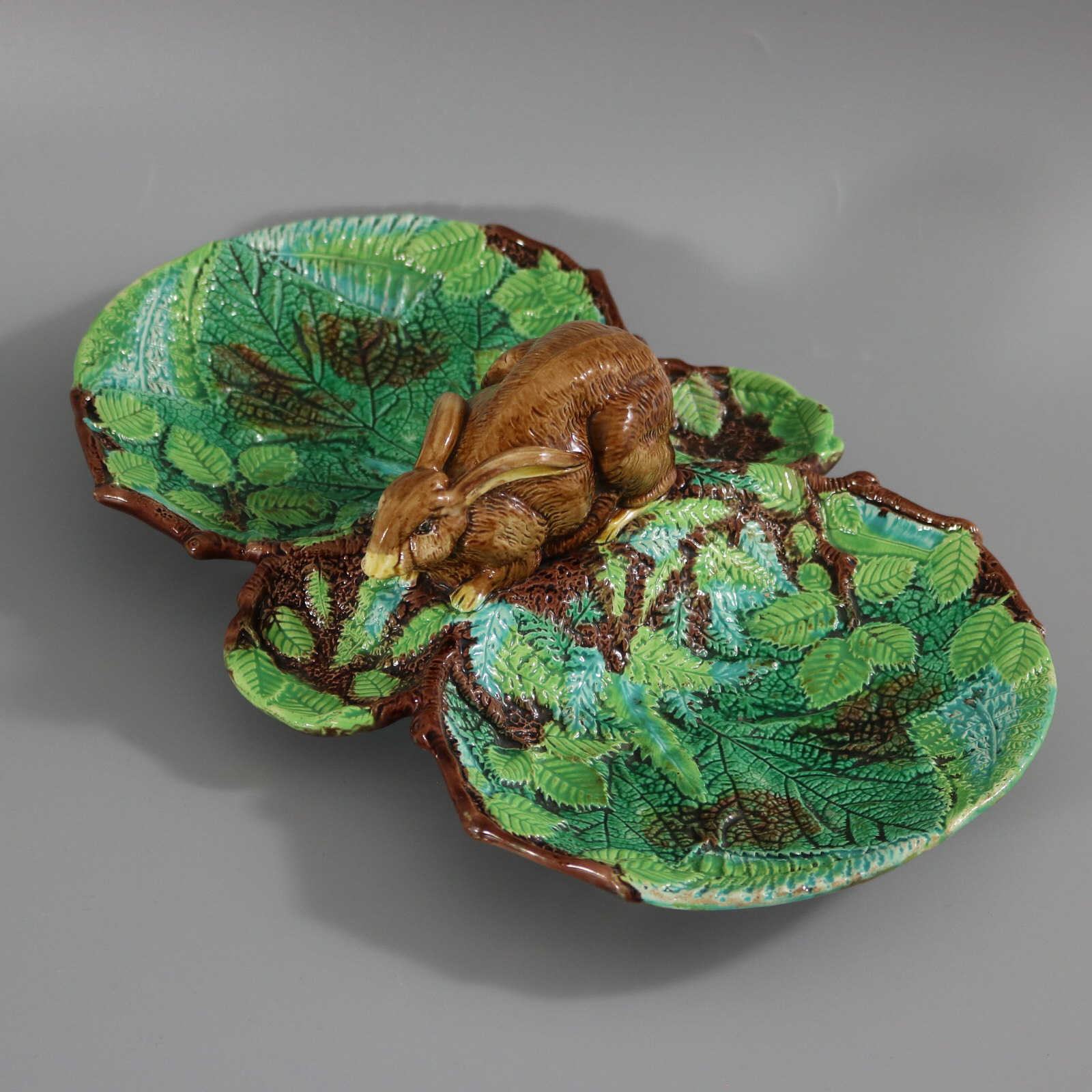 Victorian, circa 1869. 3.5ins high, 13.2ins wide, 8.7ins depth. George Jones Majolica nut dish which features a rabbit handle to the centre.