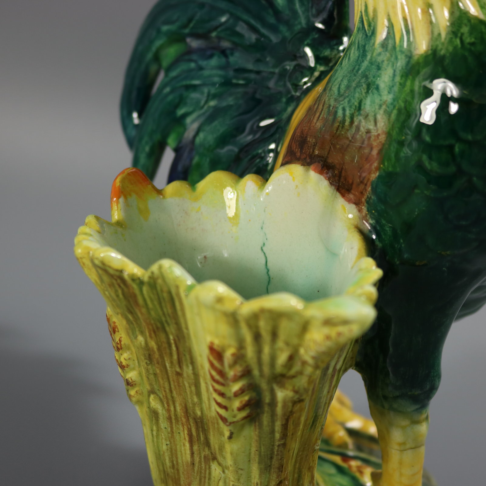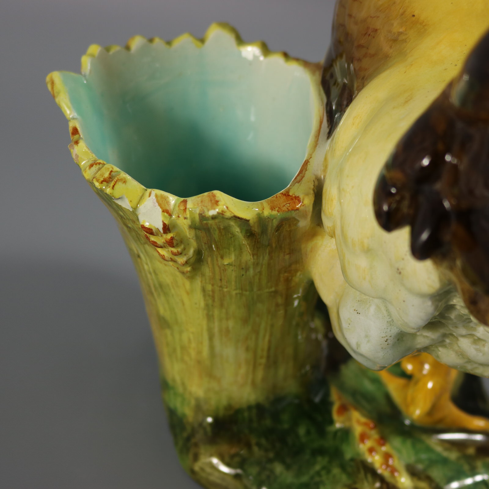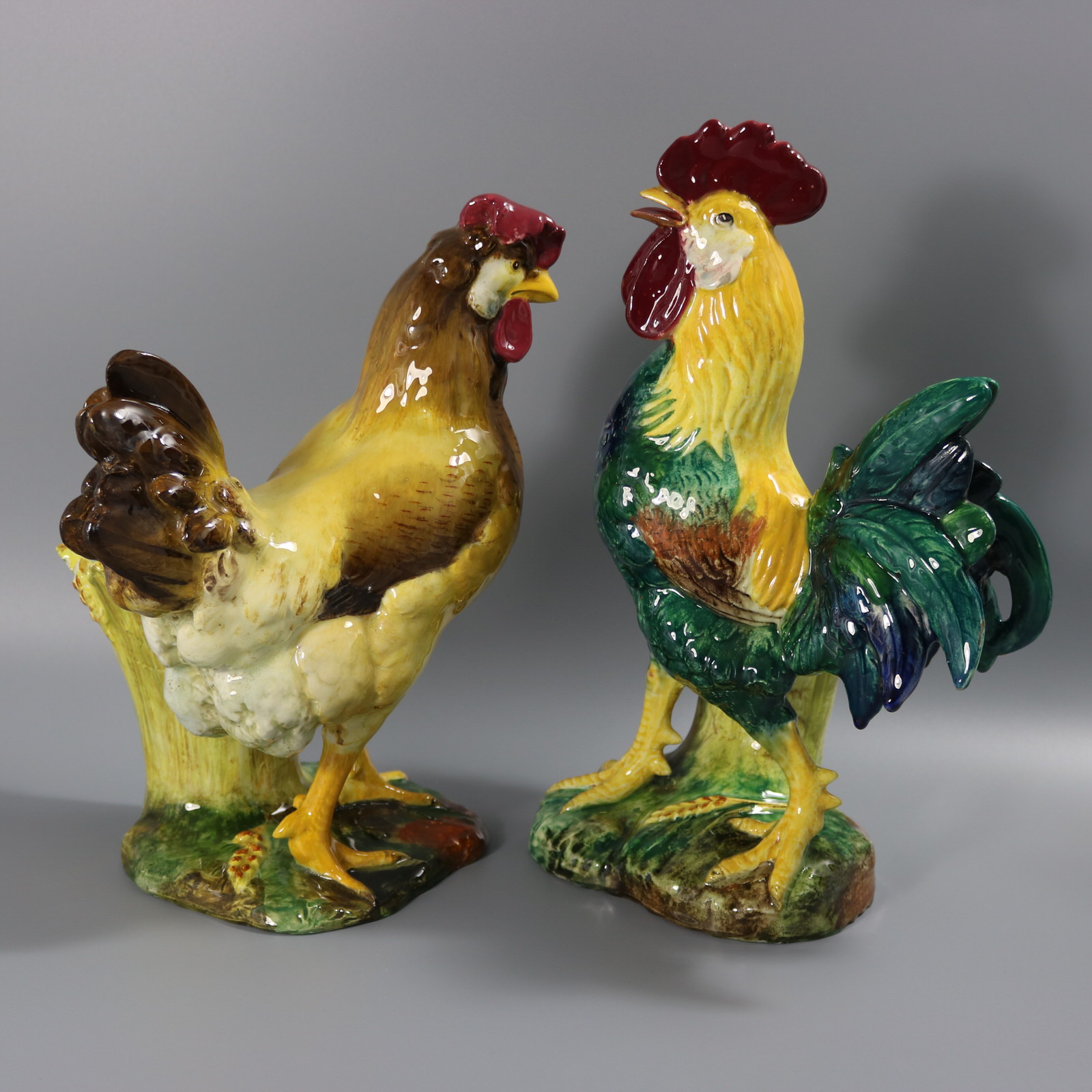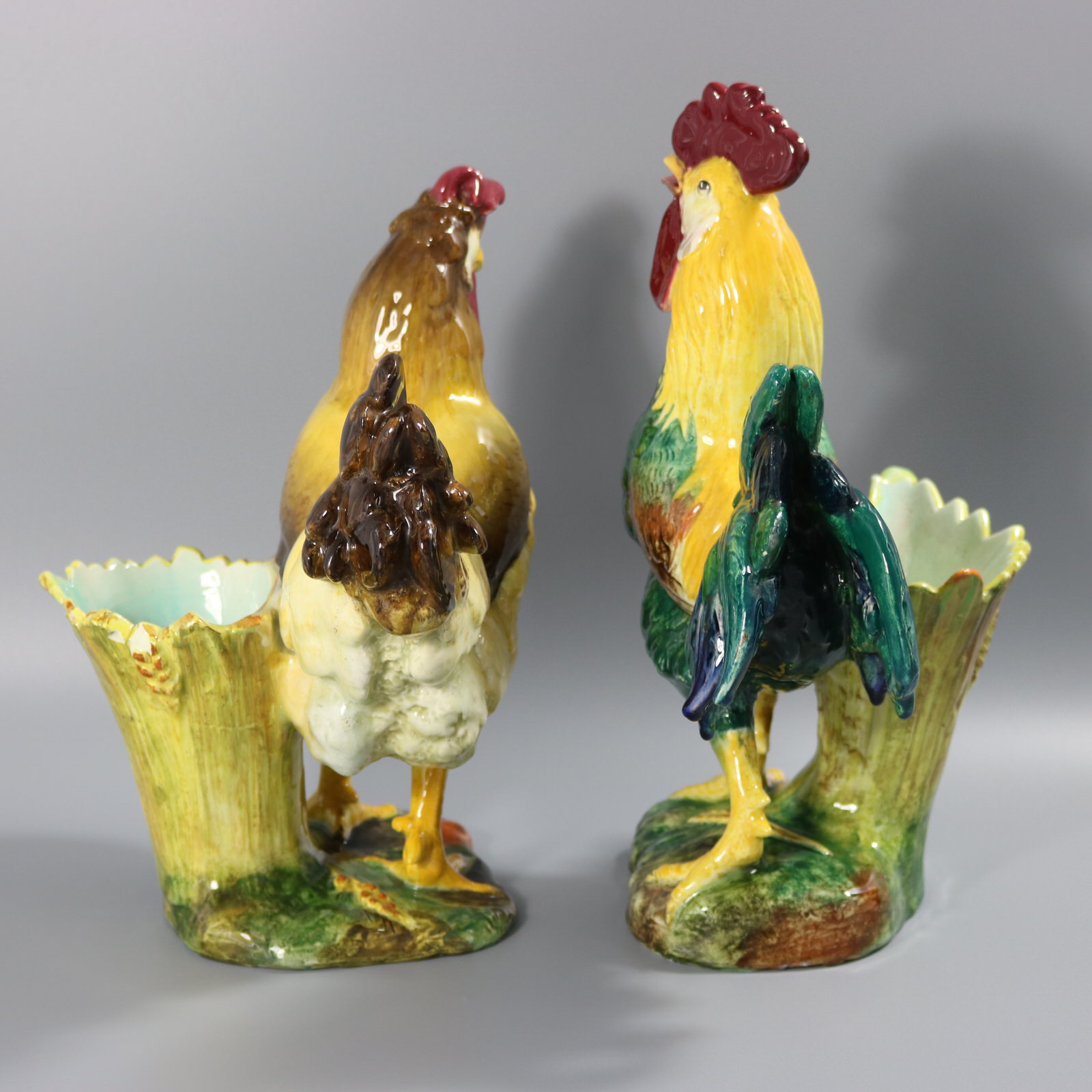 Edwardian, circa 1910. Tallest is 13.6ins high, 9.1ins wide, 6.9ins depth. Pair of Jerome Massier French Majolica figural vases which feature a pair of chickens - a cockerel and a hen, stood in front of wheatsheaf receptacles.