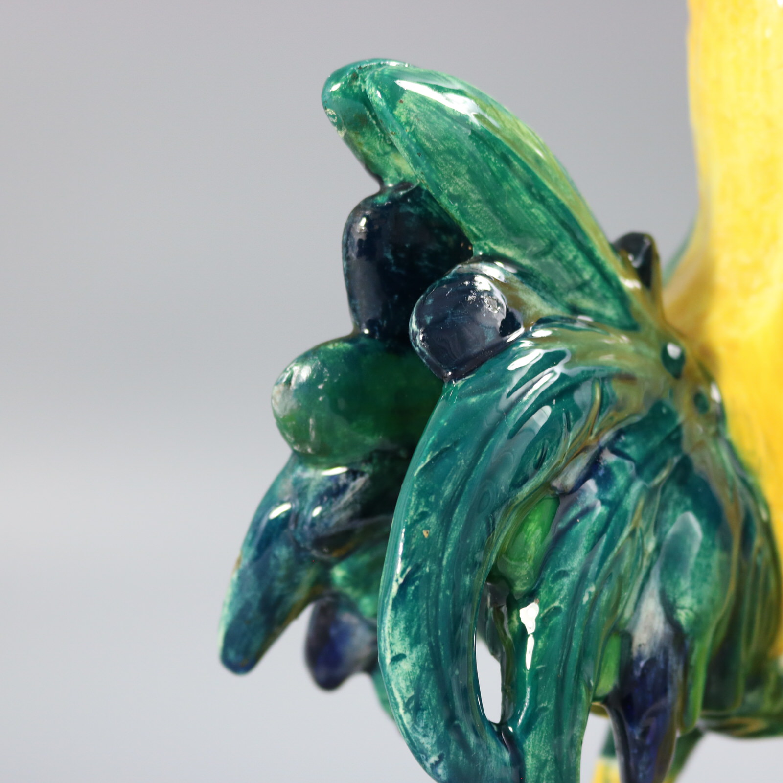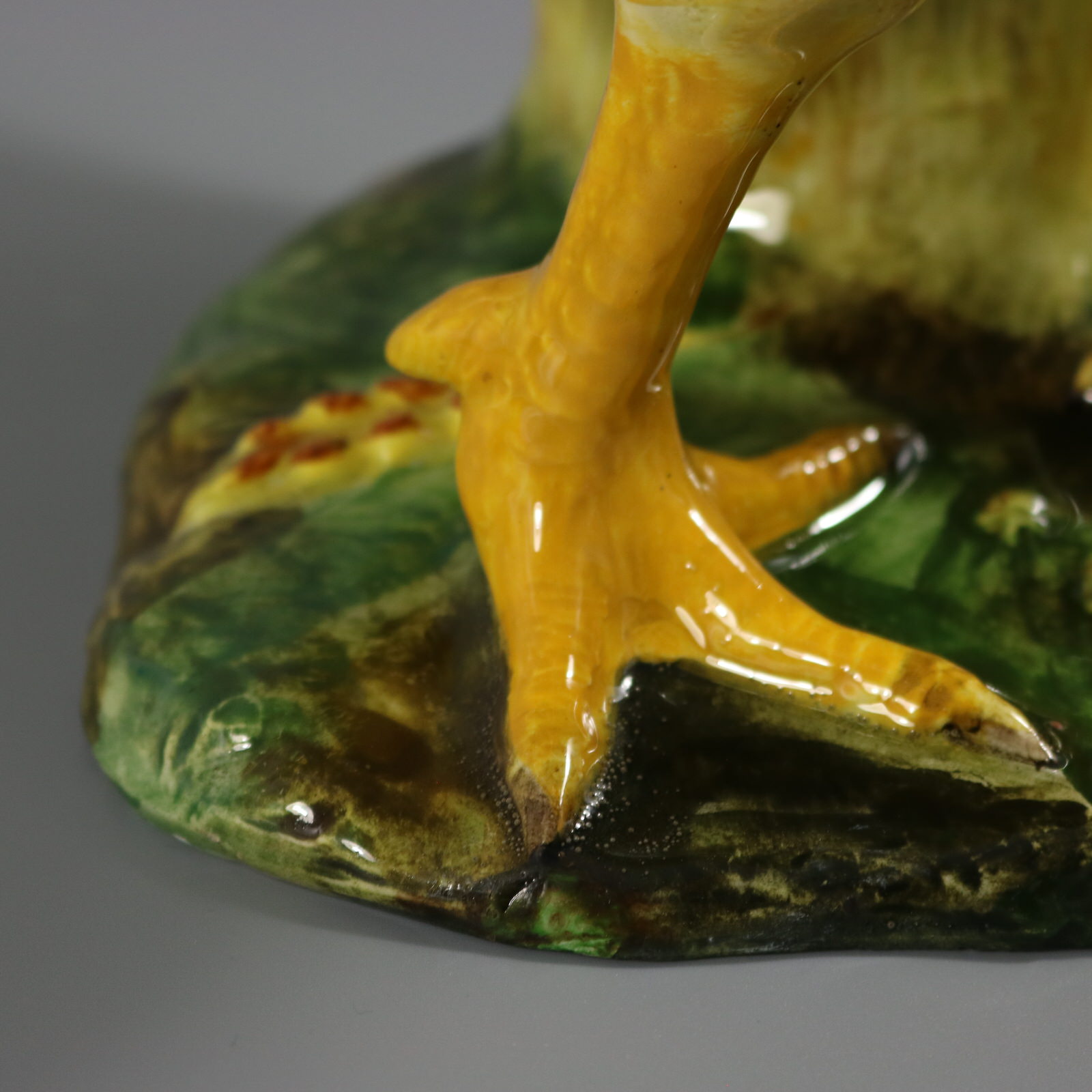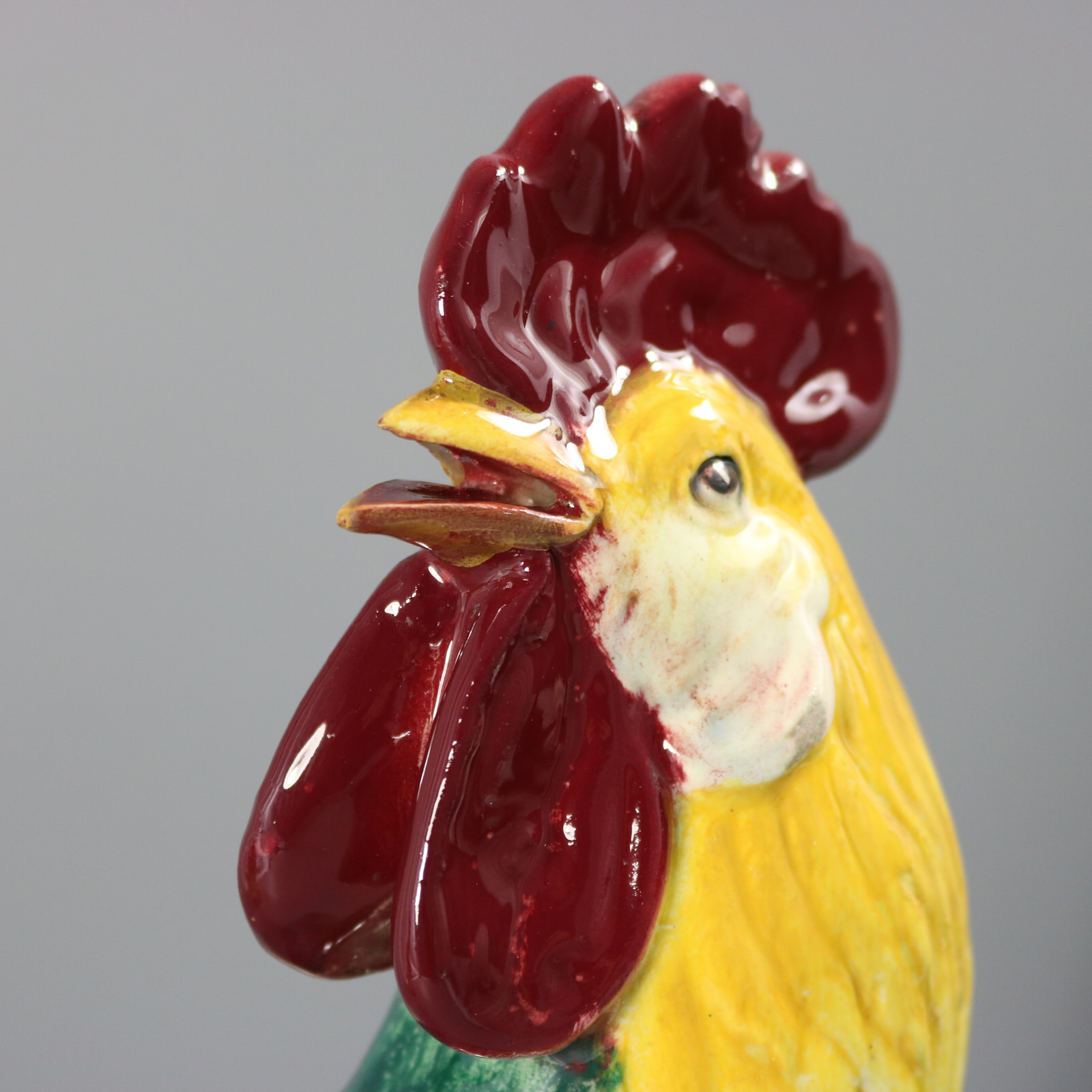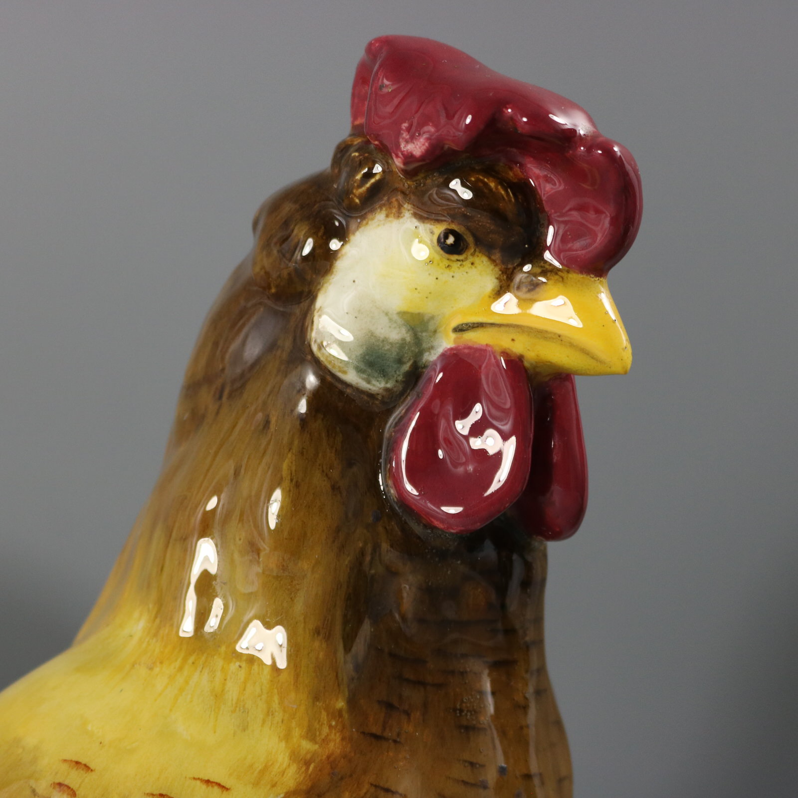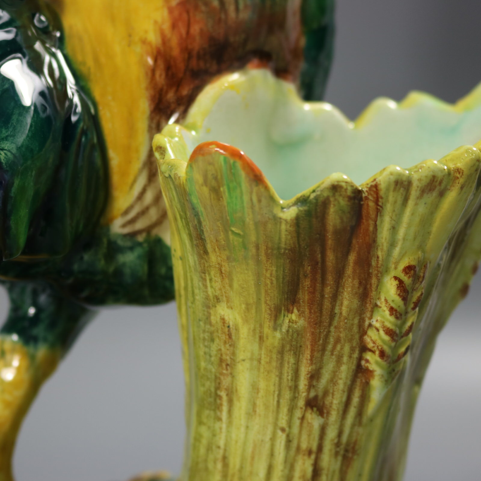 Edwardian, circa 1910. Tallest is 13.6ins high, 9.1ins wide, 6.9ins depth. Pair of Jerome Massier French Majolica figural vases which feature a pair of chickens - a cockerel and a hen, stood in front of wheatsheaf receptacles.