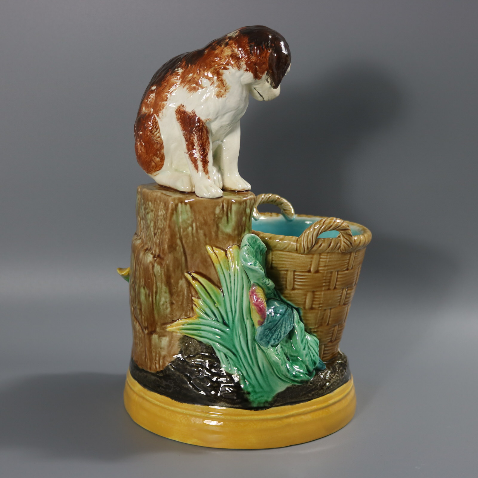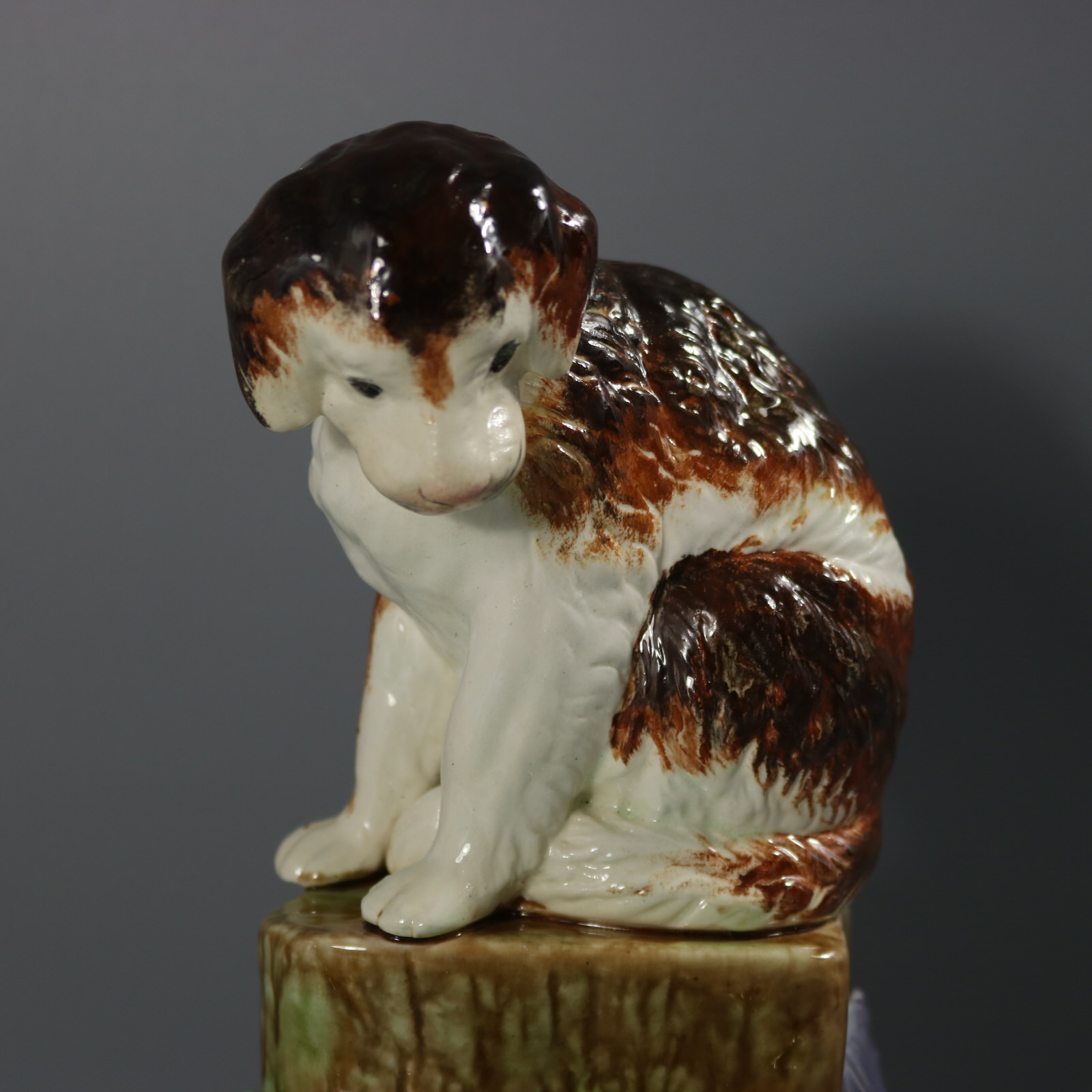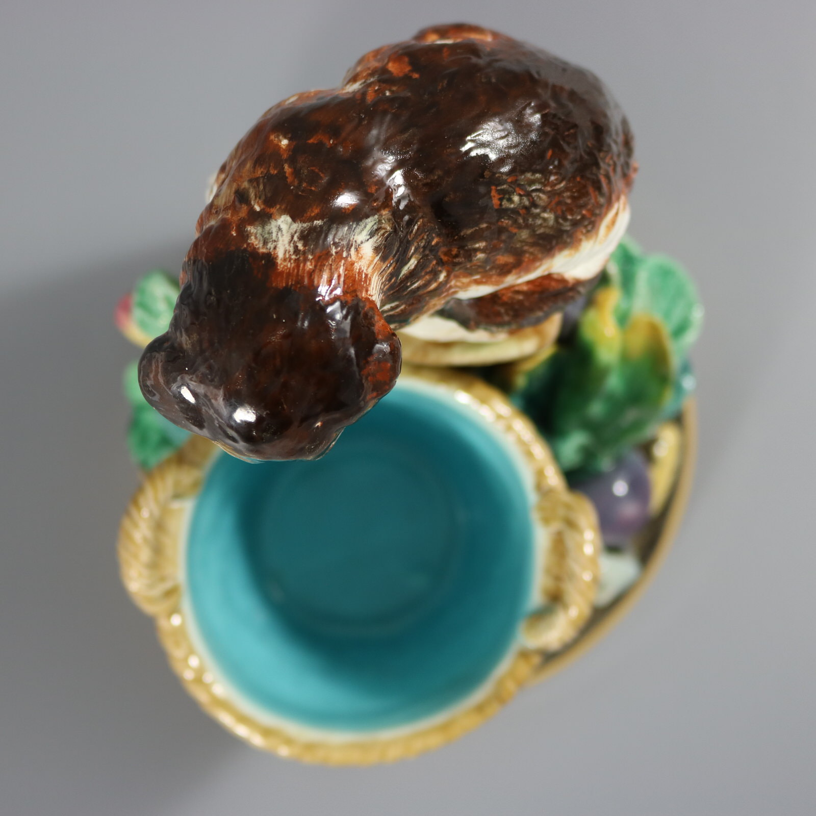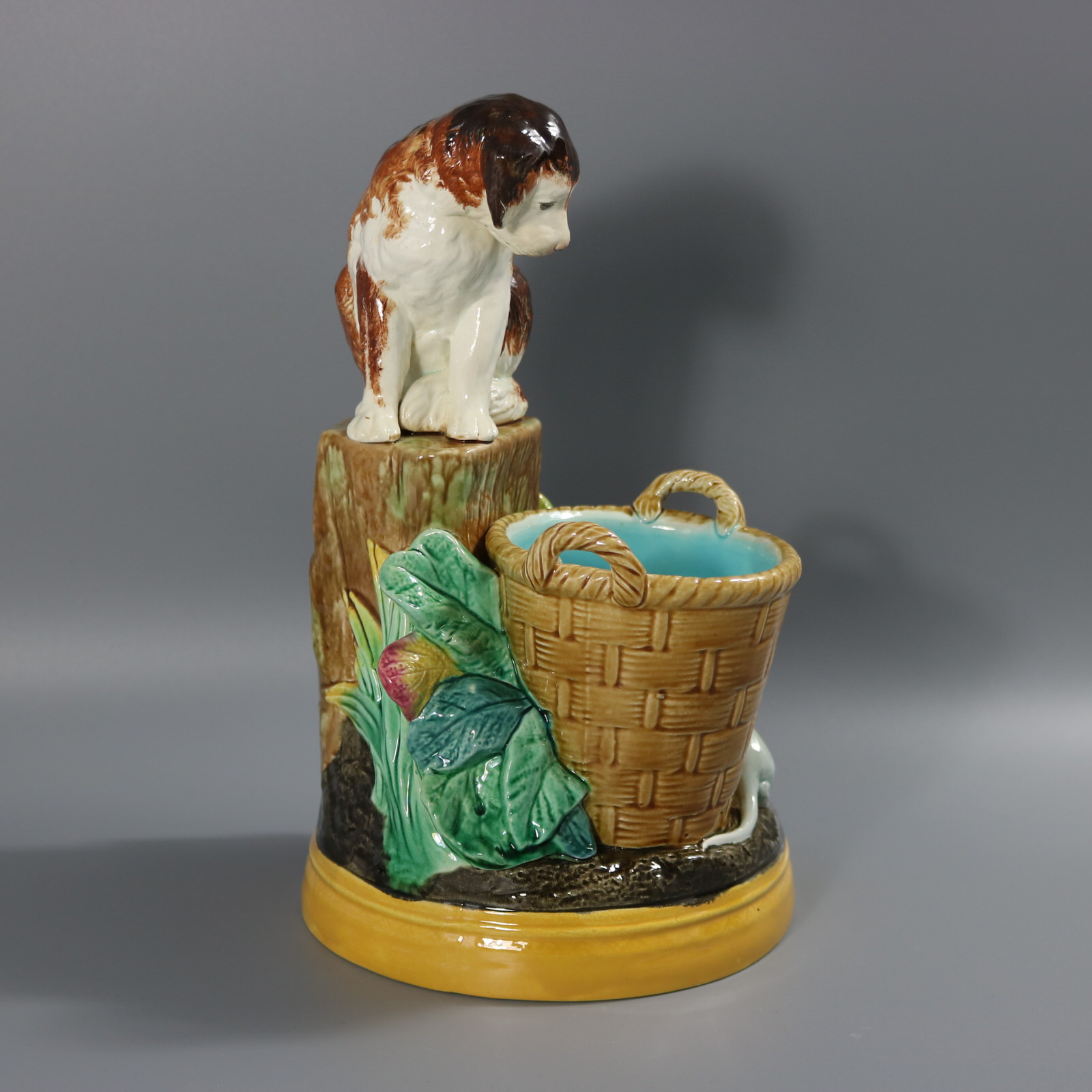 Victorian, circa 1875. 11.3ins high, 7.5ins wide, 7.5ins depth. Brown Westhead Moore and Co Majolica figural dish which features a puppy (or dog) sat on a pedestal, looking into a basket.