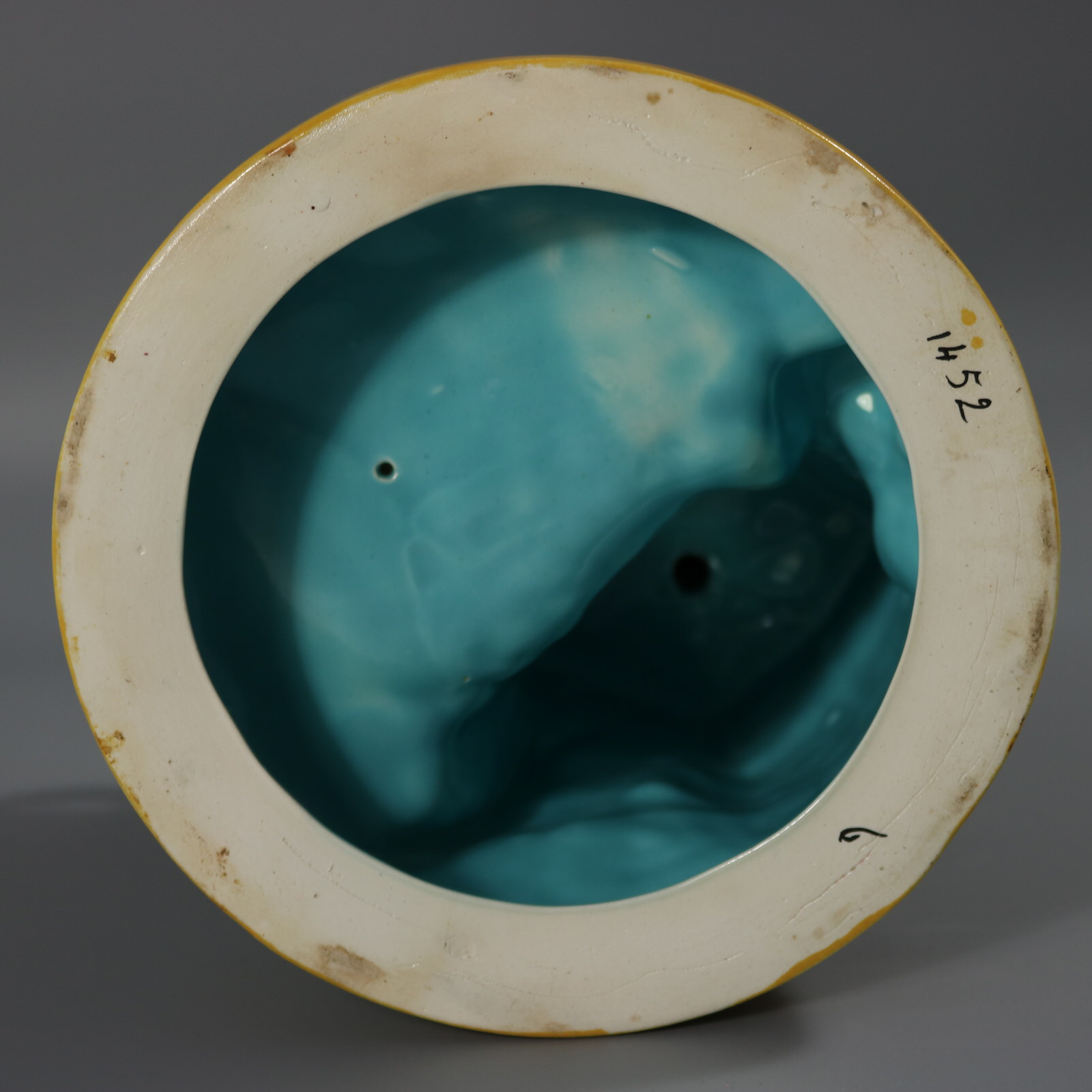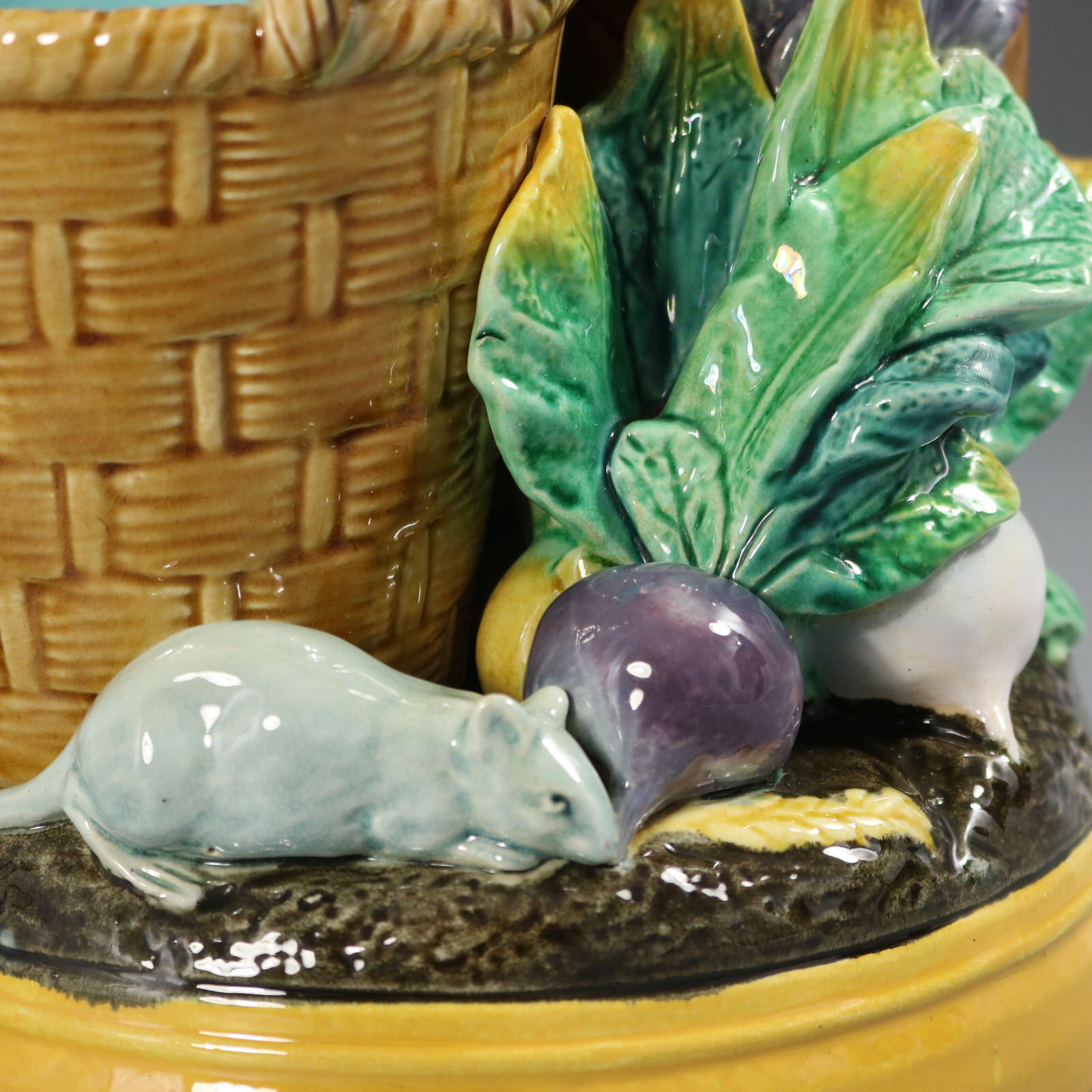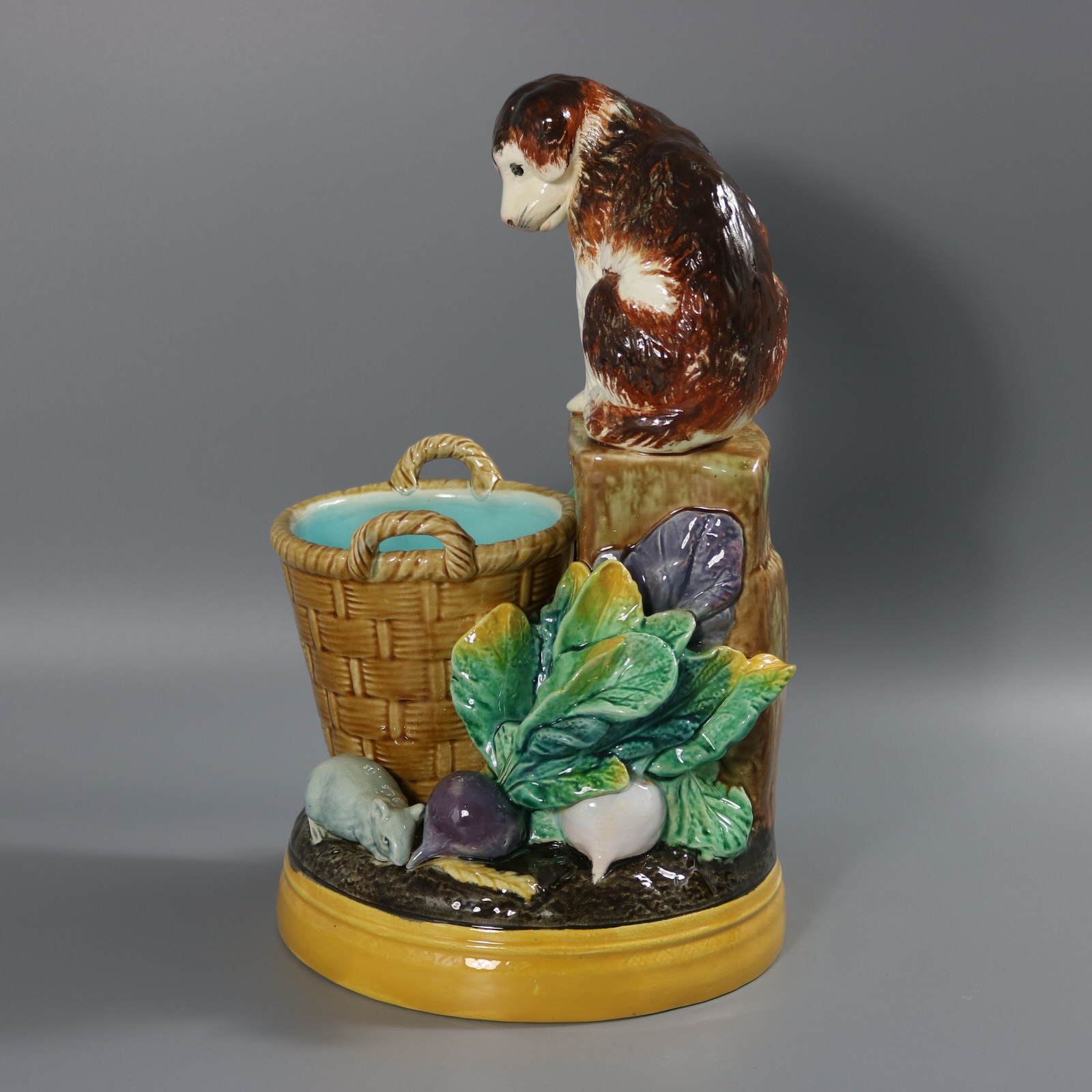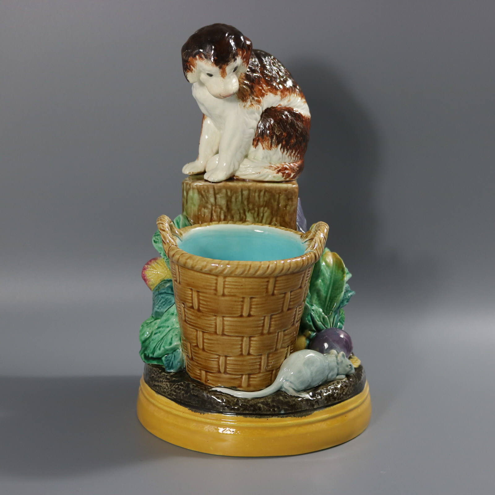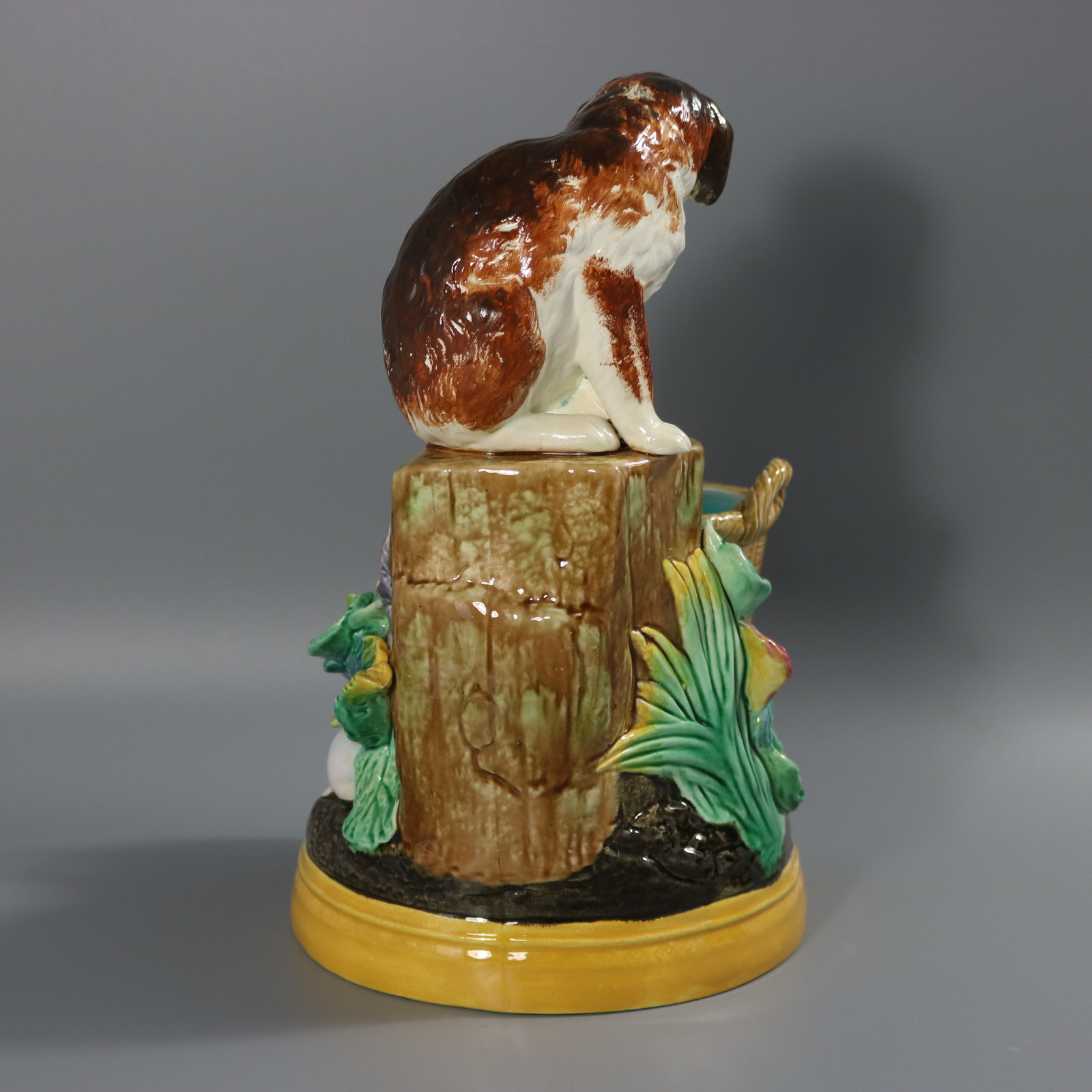 Victorian, circa 1875. 11.3ins high, 7.5ins wide, 7.5ins depth. Brown Westhead Moore and Co Majolica figural dish which features a puppy (or dog) sat on a pedestal, looking into a basket.