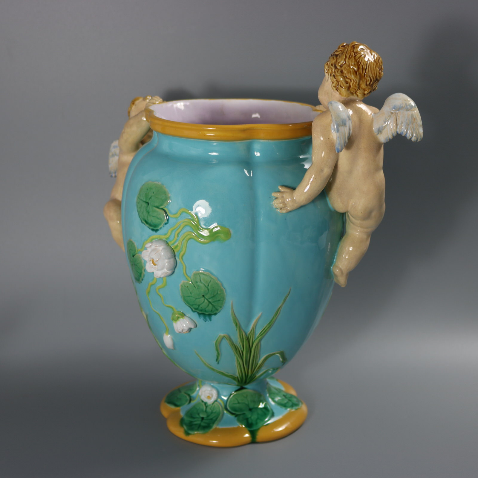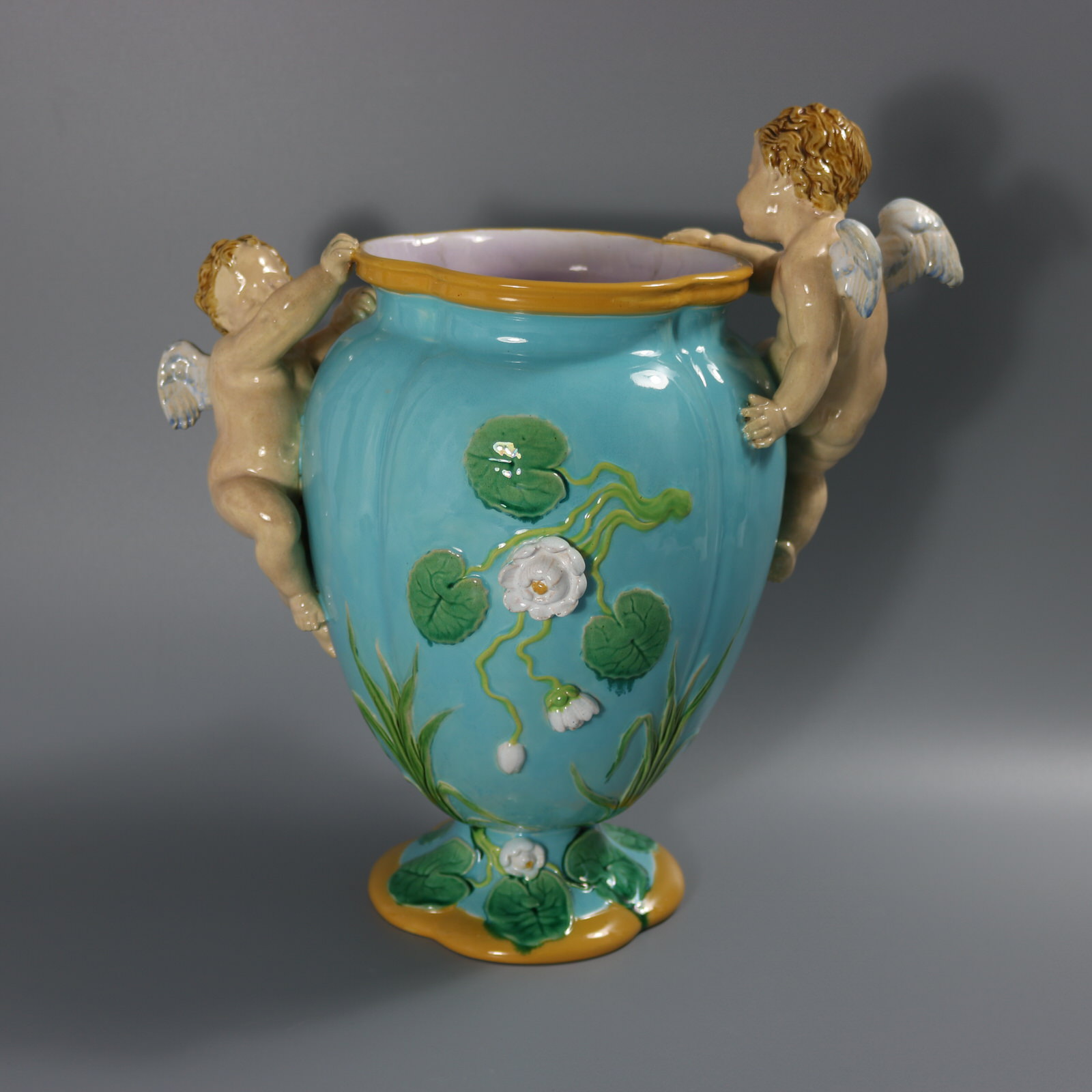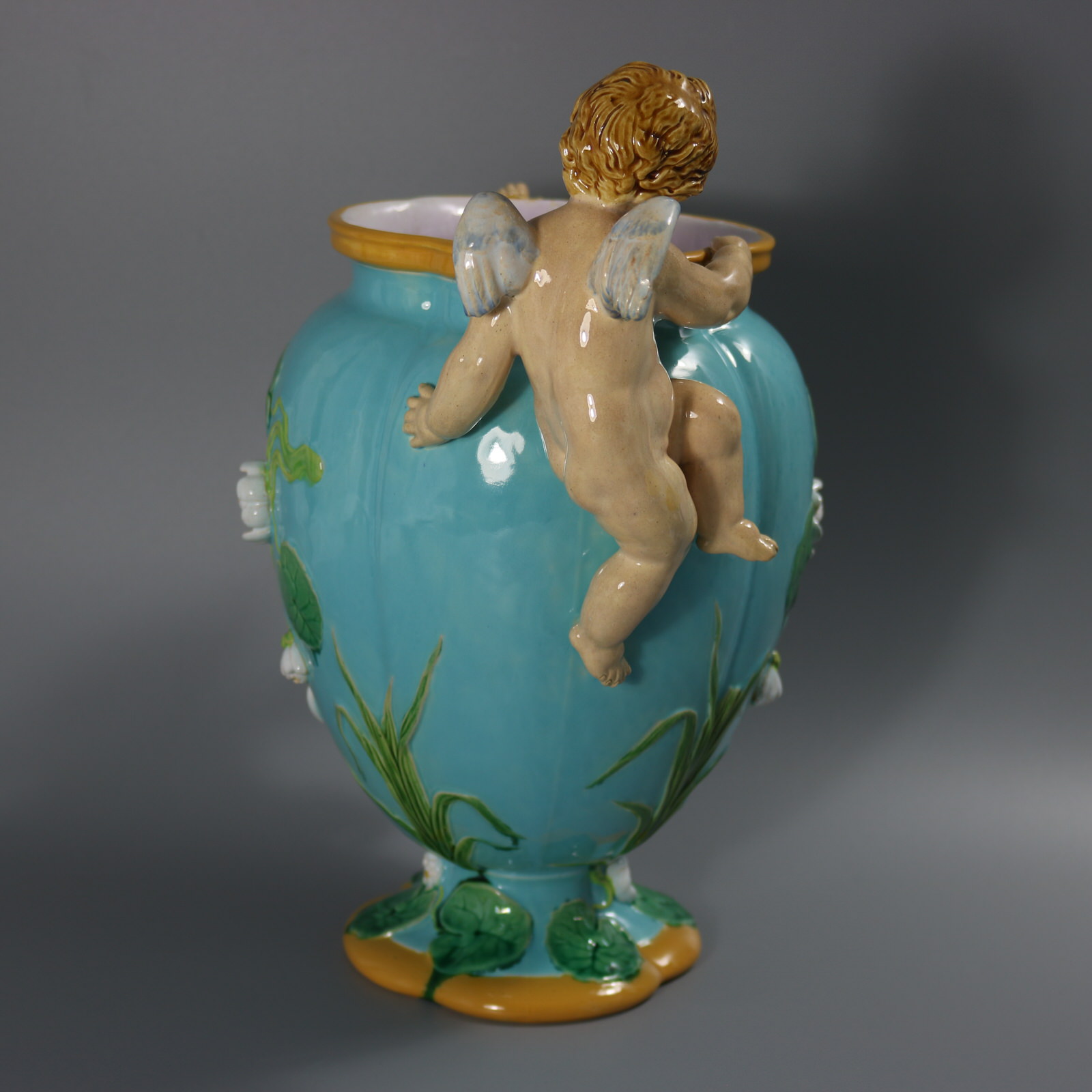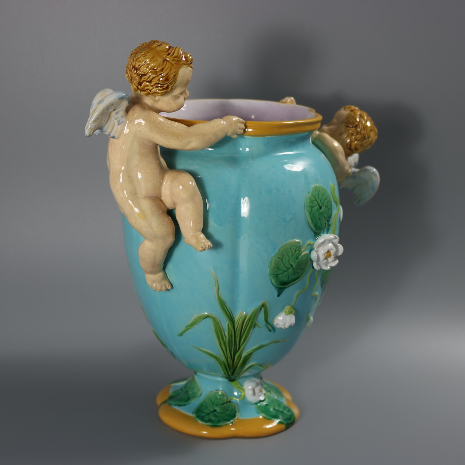 Victorian, circa 1876. 13.4ins high, 13.4ins wide, 8.3ins depth. Minton Majolica vase which features climbing cherubs and water lilies.