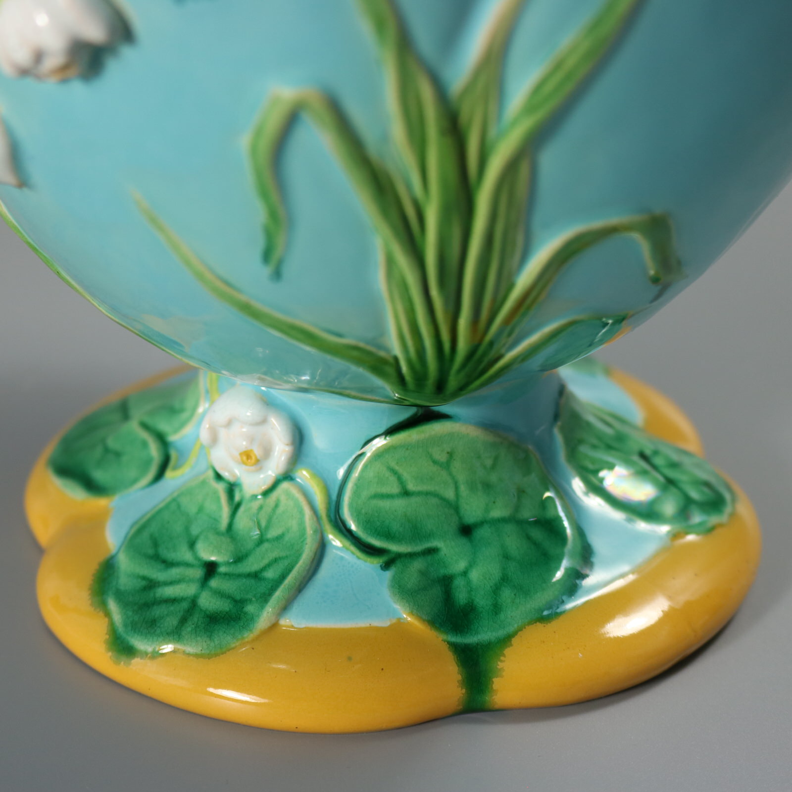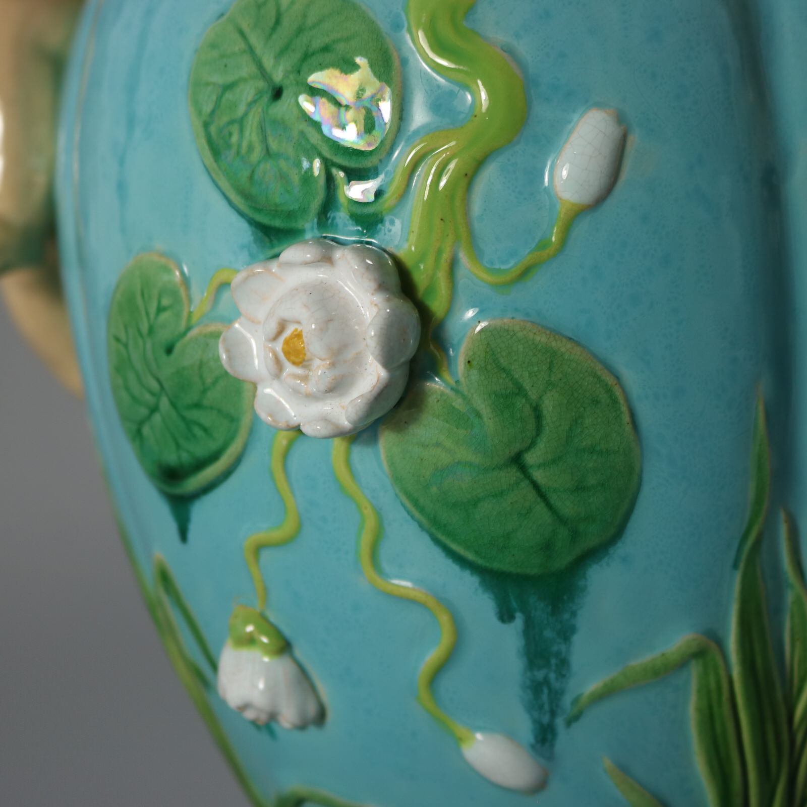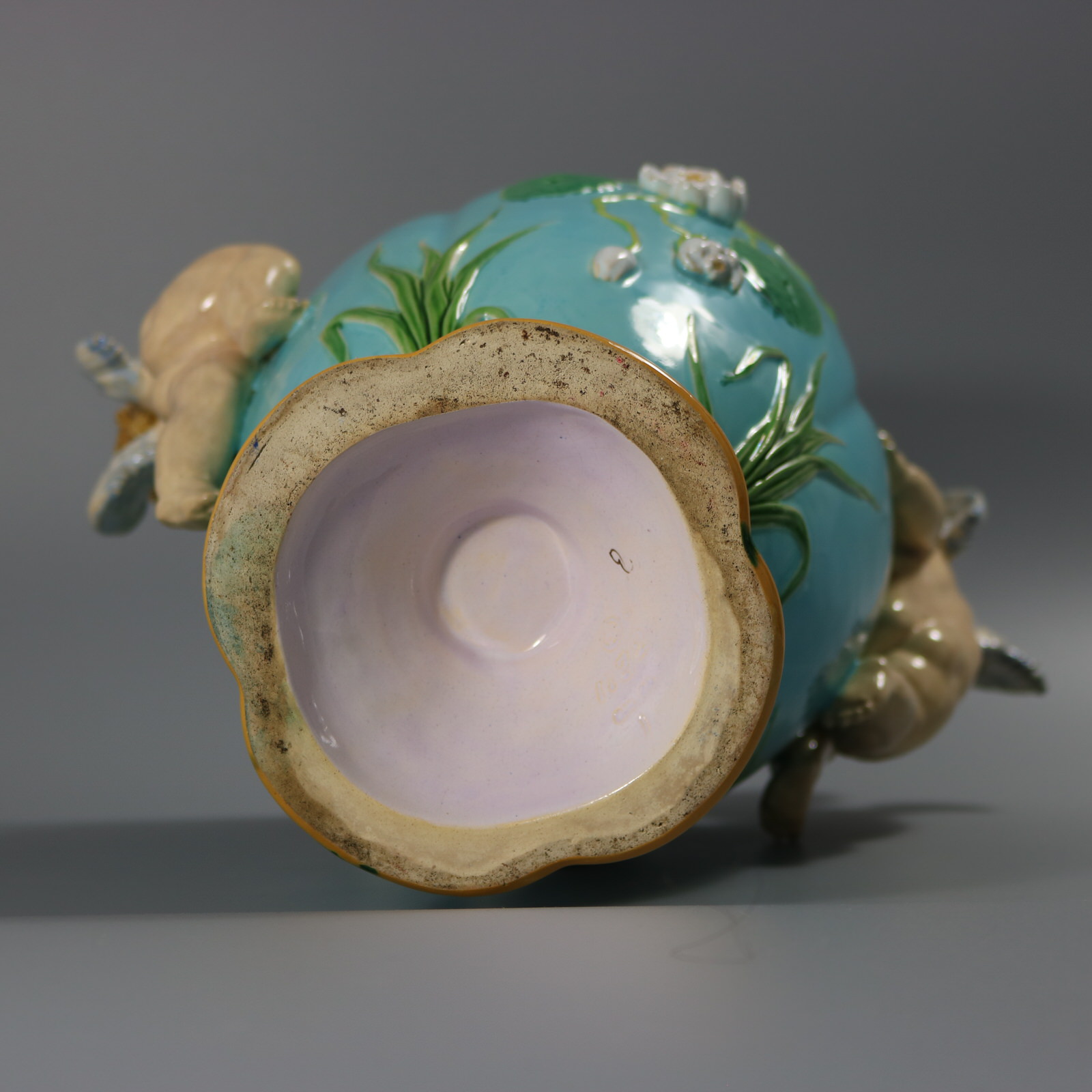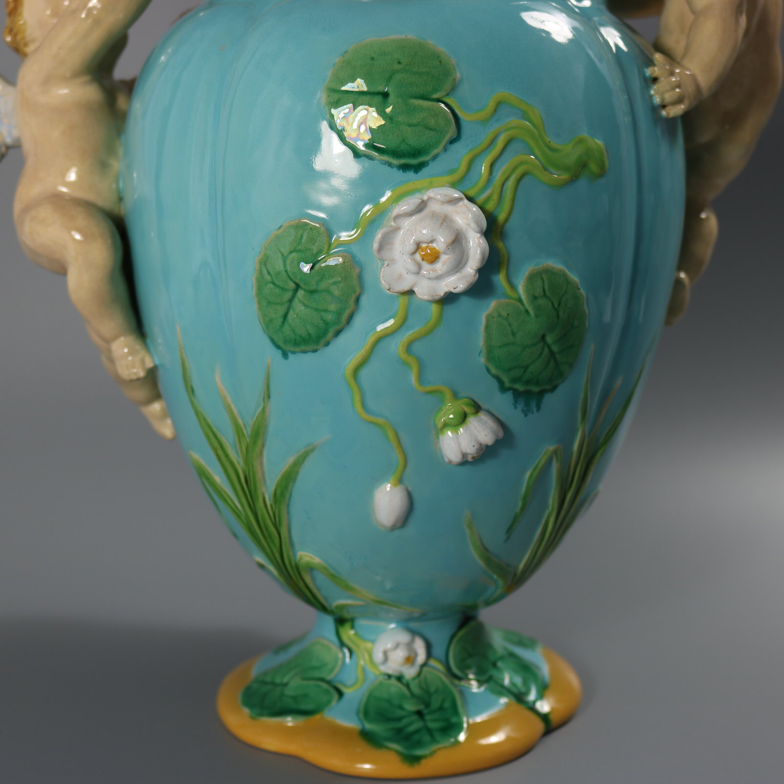 Victorian, circa 1876. 13.4ins high, 13.4ins wide, 8.3ins depth. Minton Majolica vase which features climbing cherubs and water lilies.