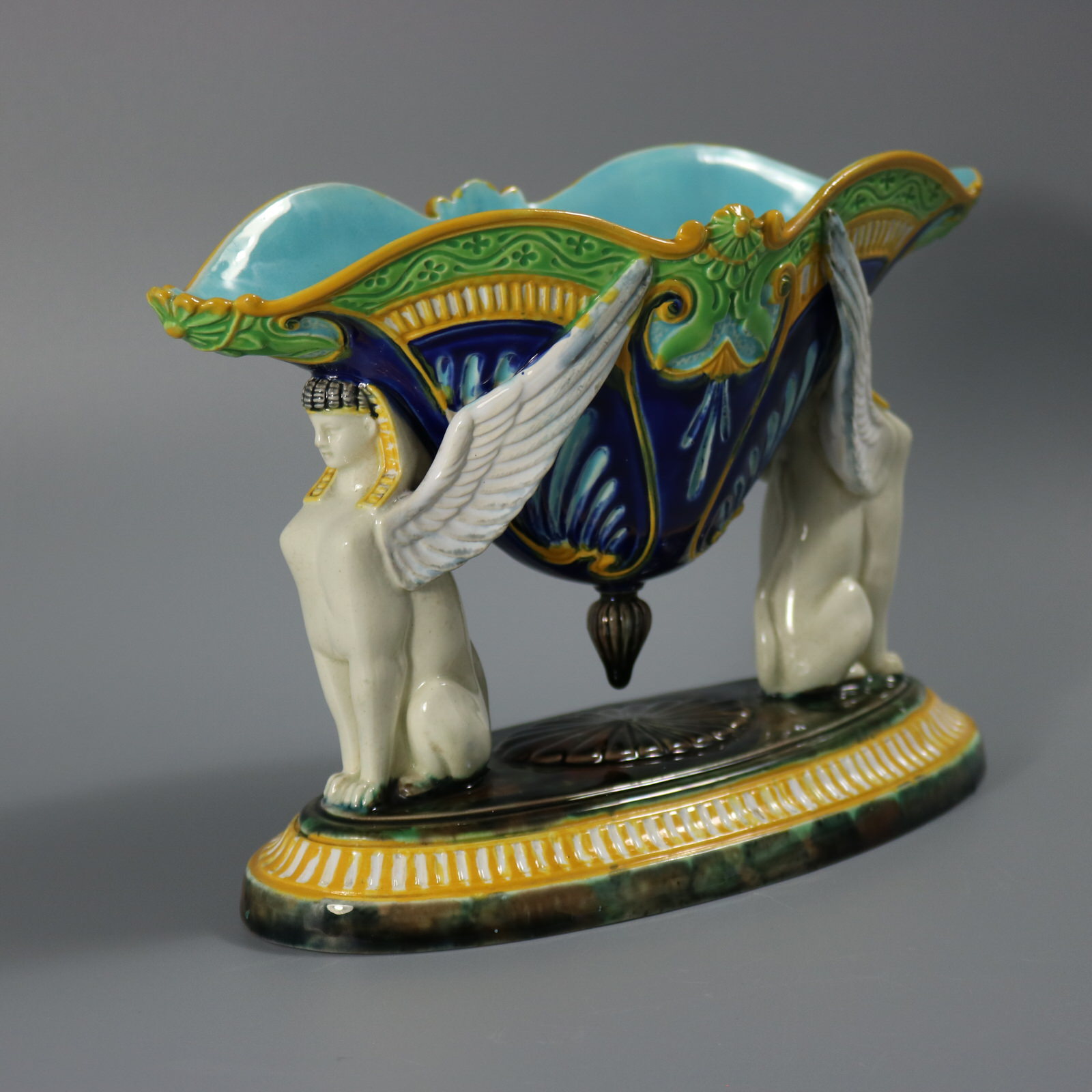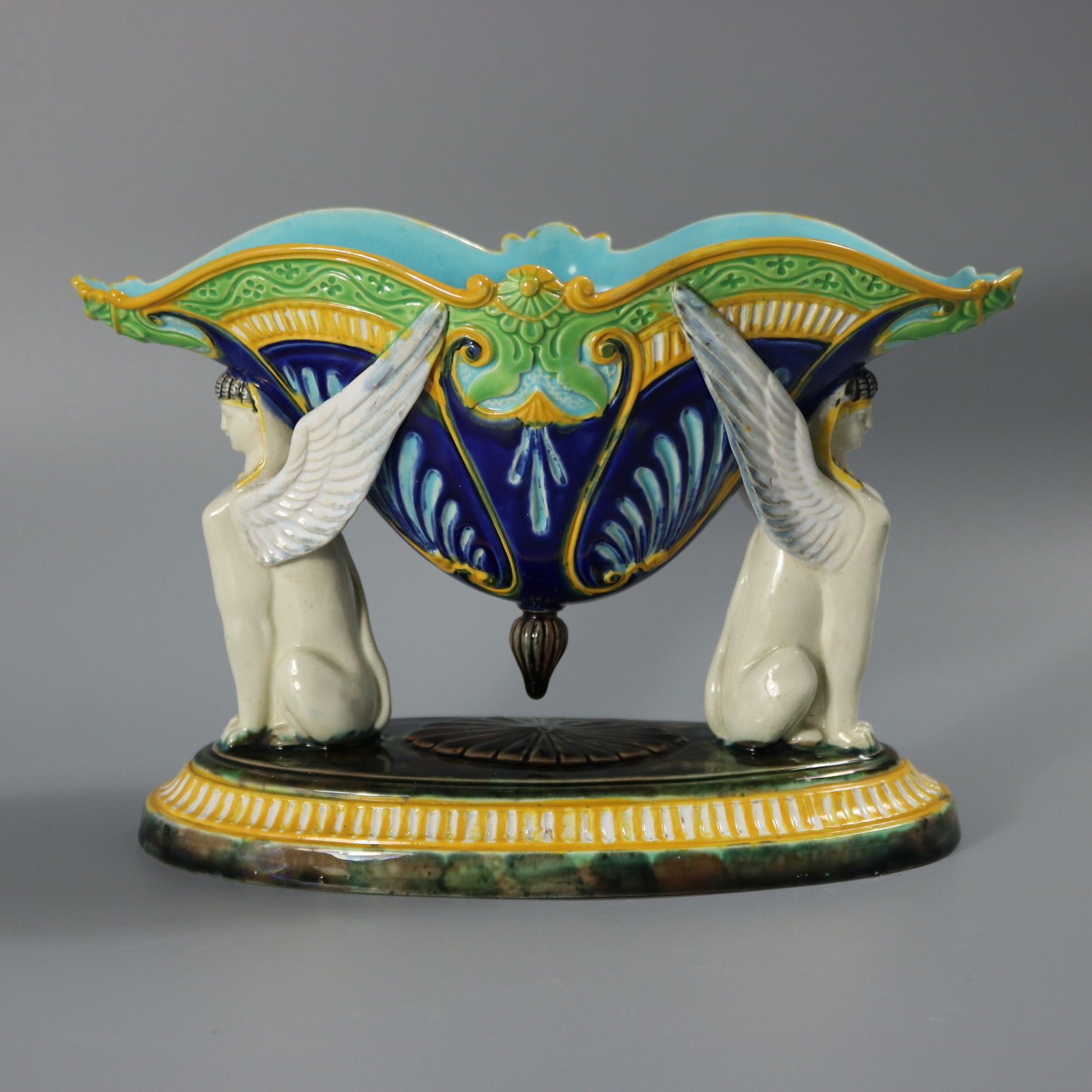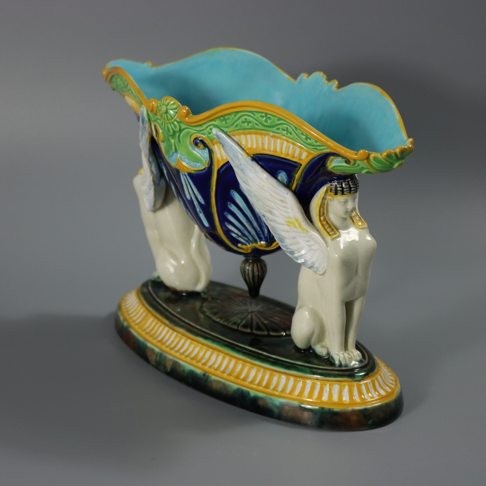 Victorian, circa 1875. 5.9ins high, 8.8ins wide, 3.9ins depth. George Jones Majolica figural bowl with a mythological theme which features two Egyptian sphinxes seated on a mottled oval base supporting a bowl with their wings and their heads.