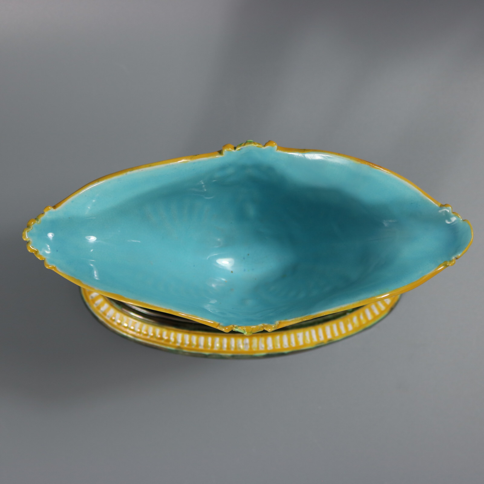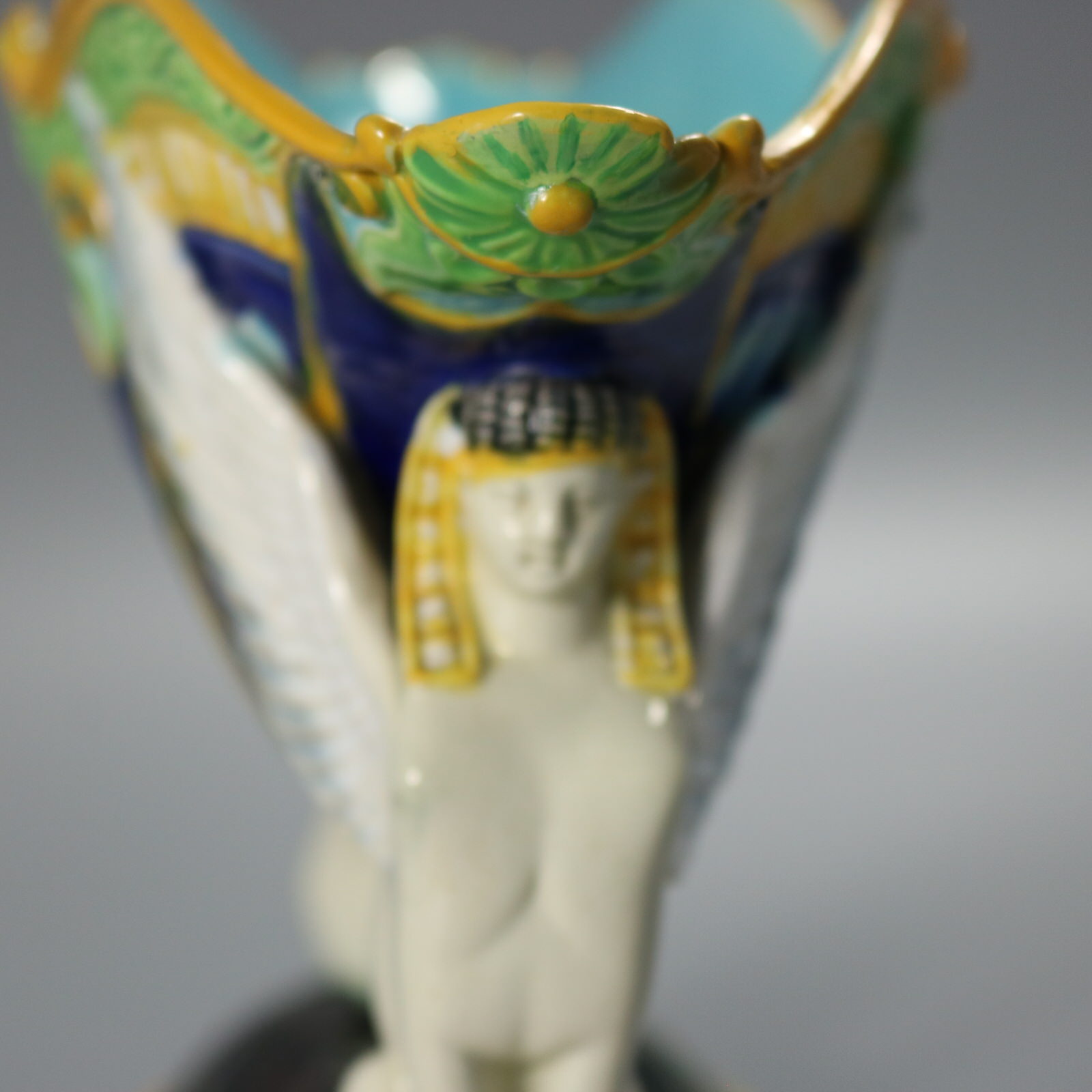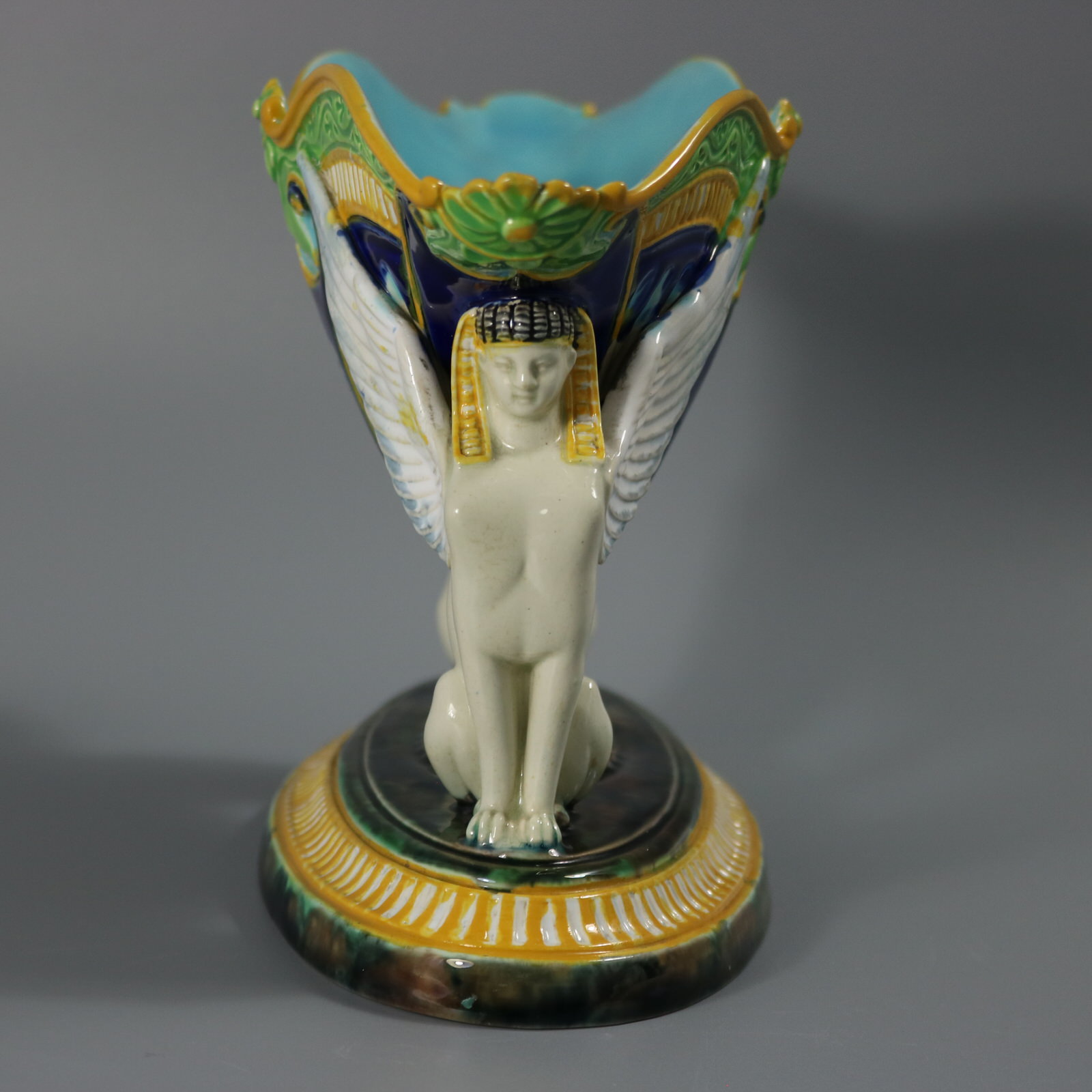 Victorian, circa 1875. 5.9ins high, 8.8ins wide, 3.9ins depth. George Jones Majolica figural bowl with a mythological theme which features two Egyptian sphinxes seated on a mottled oval base supporting a bowl with their wings and their heads.
