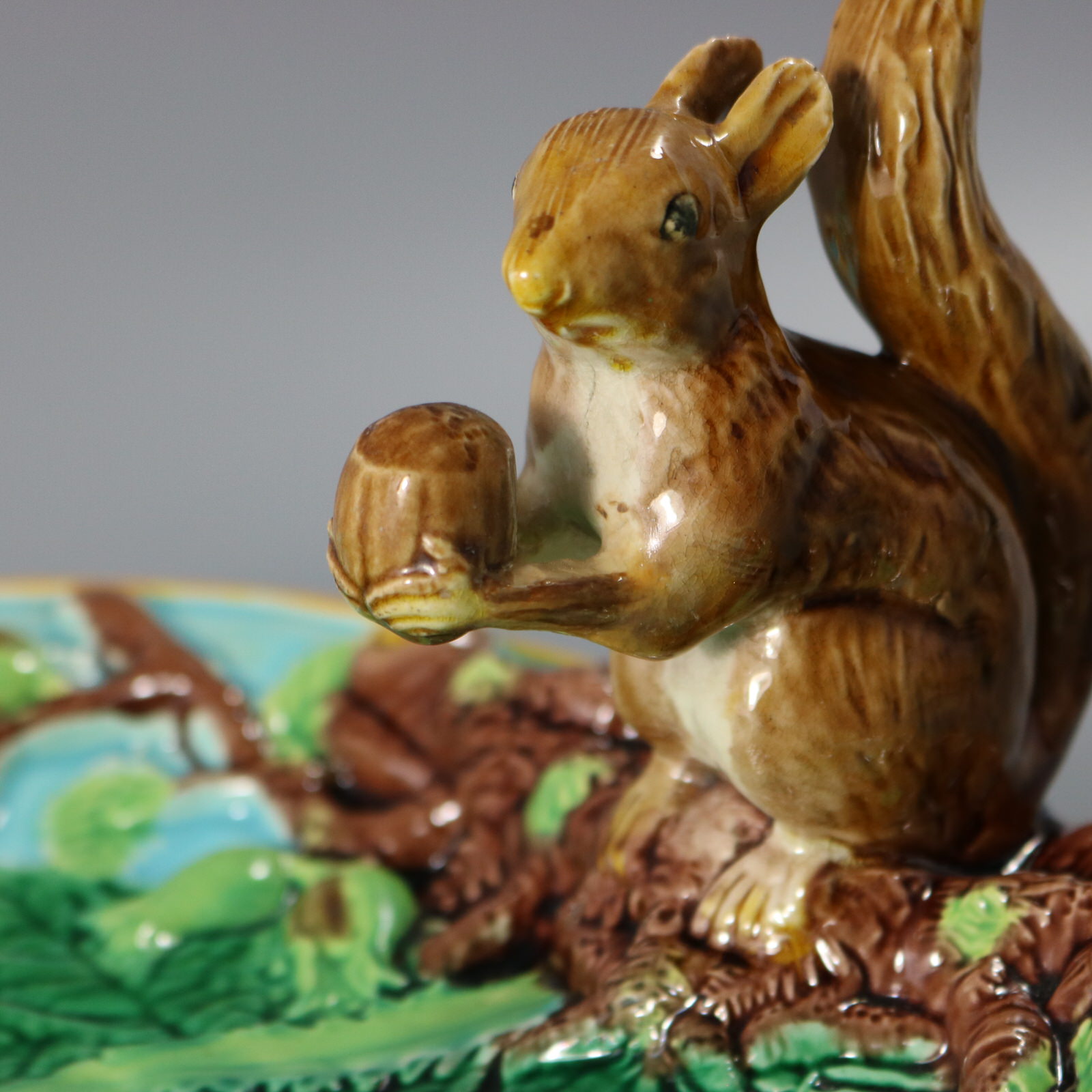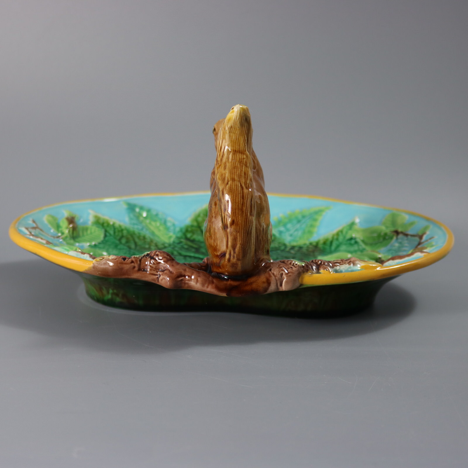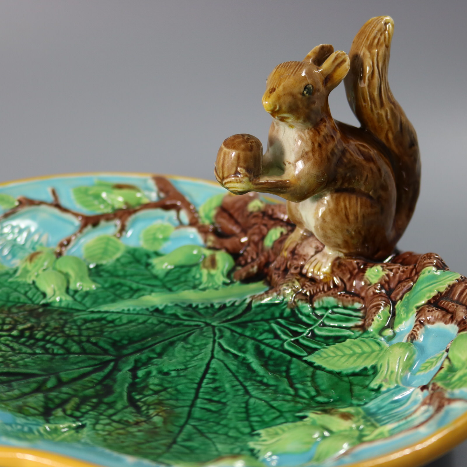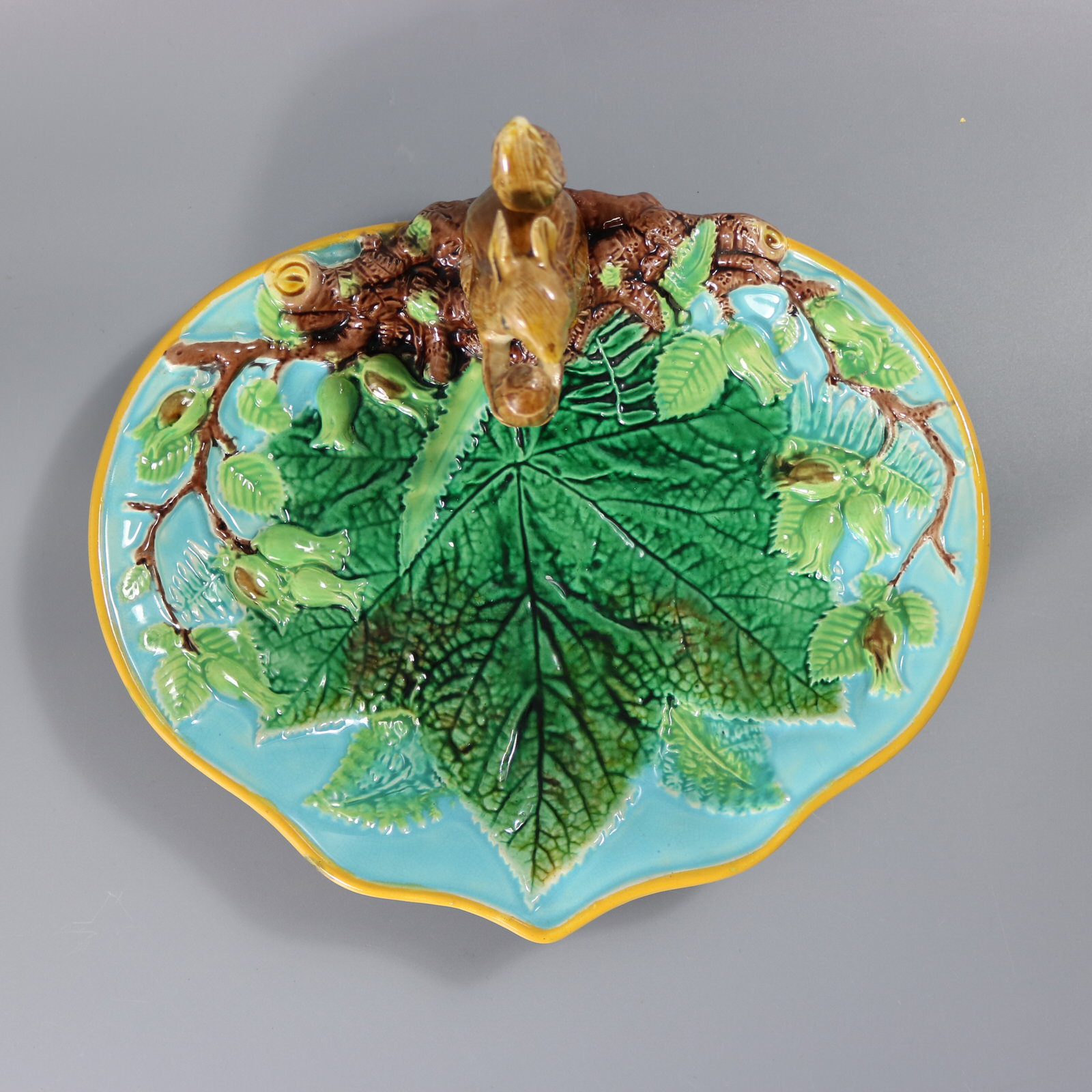 Victorian, circa 1870. 4.9ins high, 10.4ins wide, 9.1ins depth. George Jones Majolica nut dish which features a squirrel sitting on a branch, holding a nut.