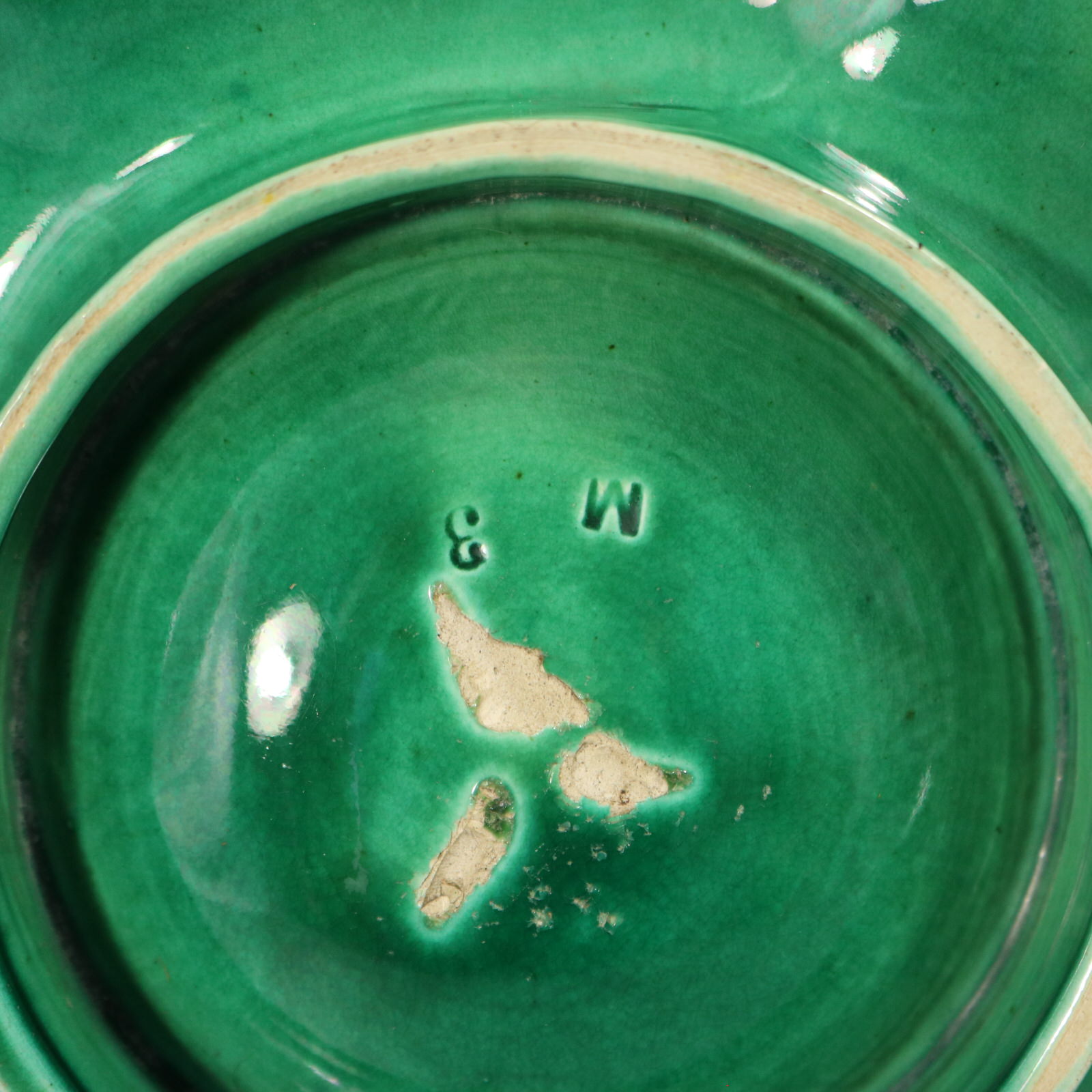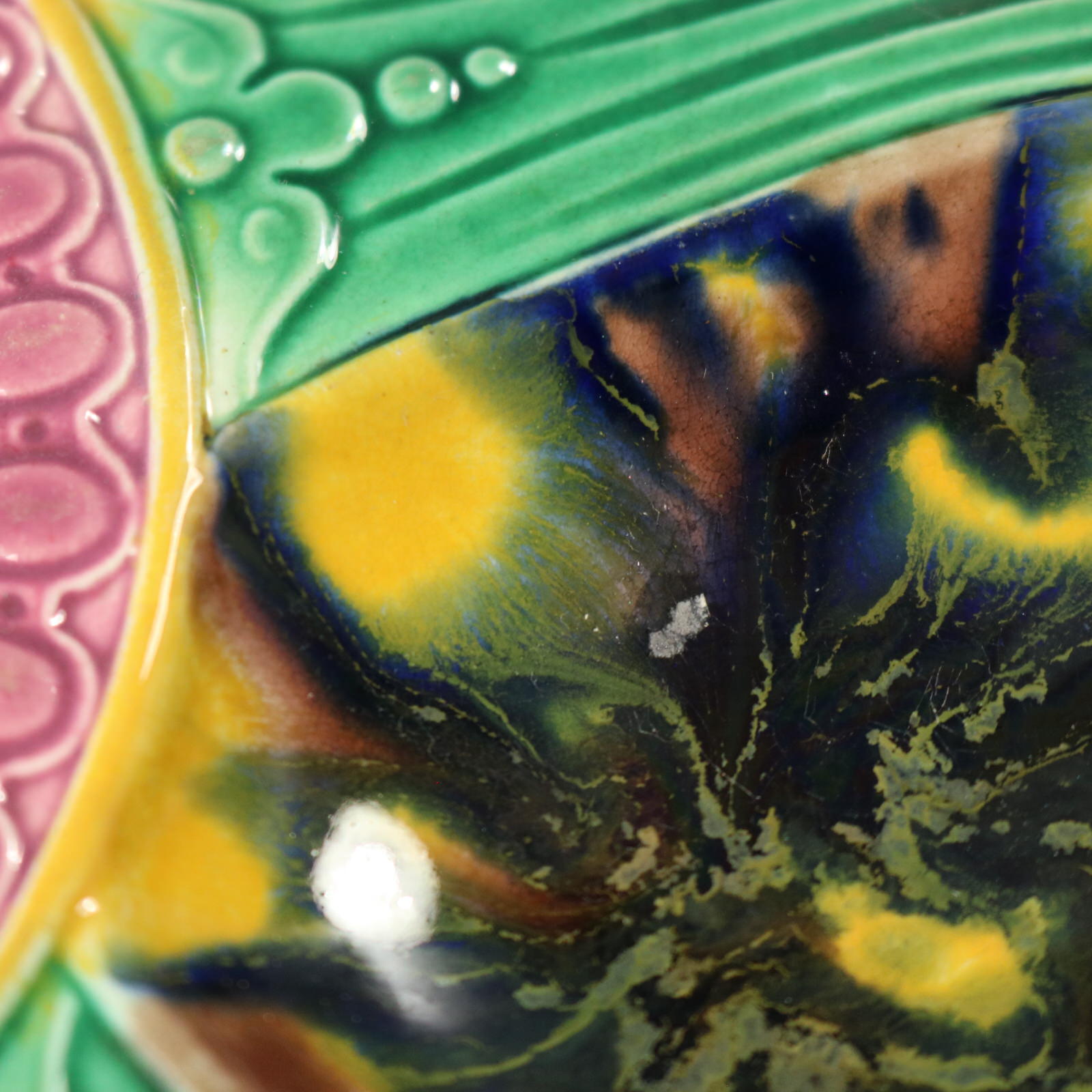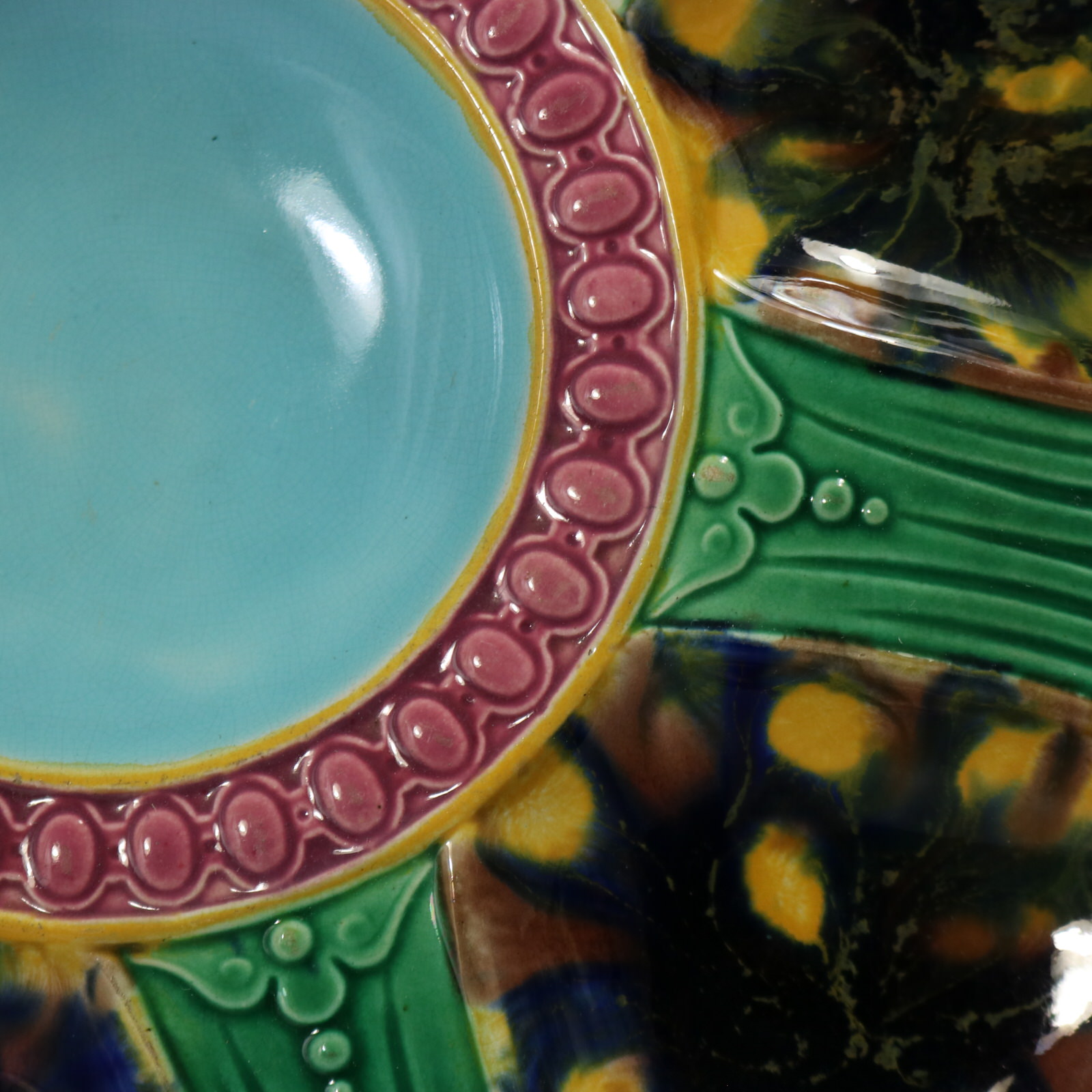 Victorian, circa 1875. 8.9ins high, 8.9ins wide, 0.8ins depth. Brown Westhead Moore and Co Majolica oyster plate which features a central well, surrounded by six shell-shaped outer wells.