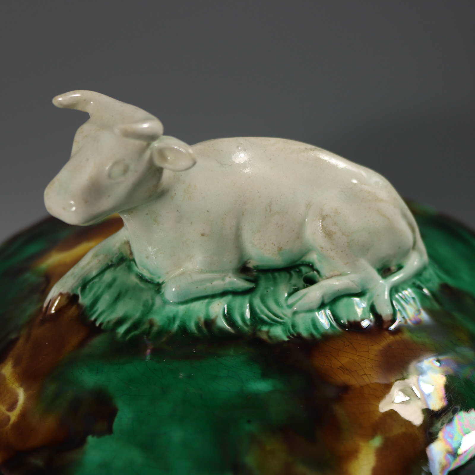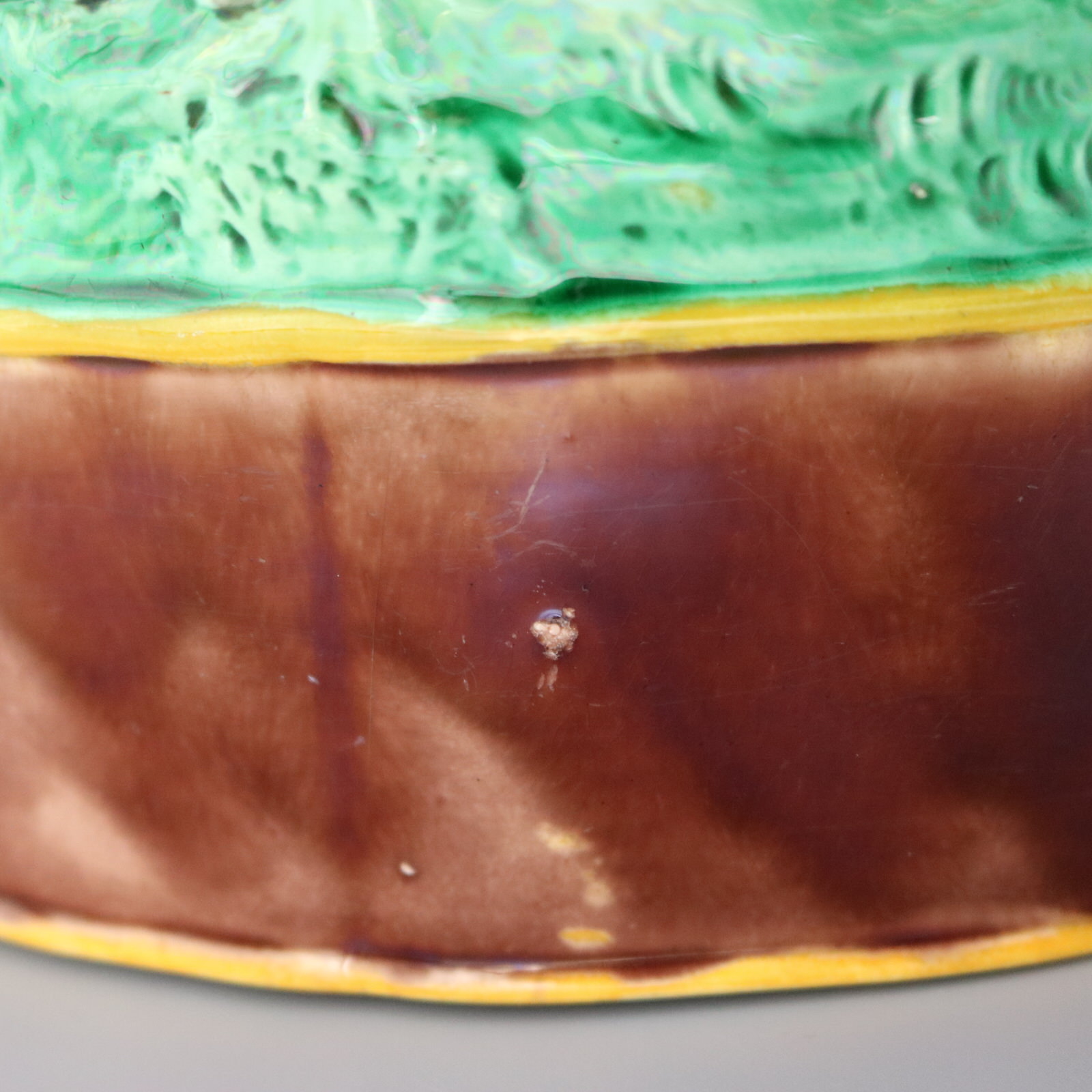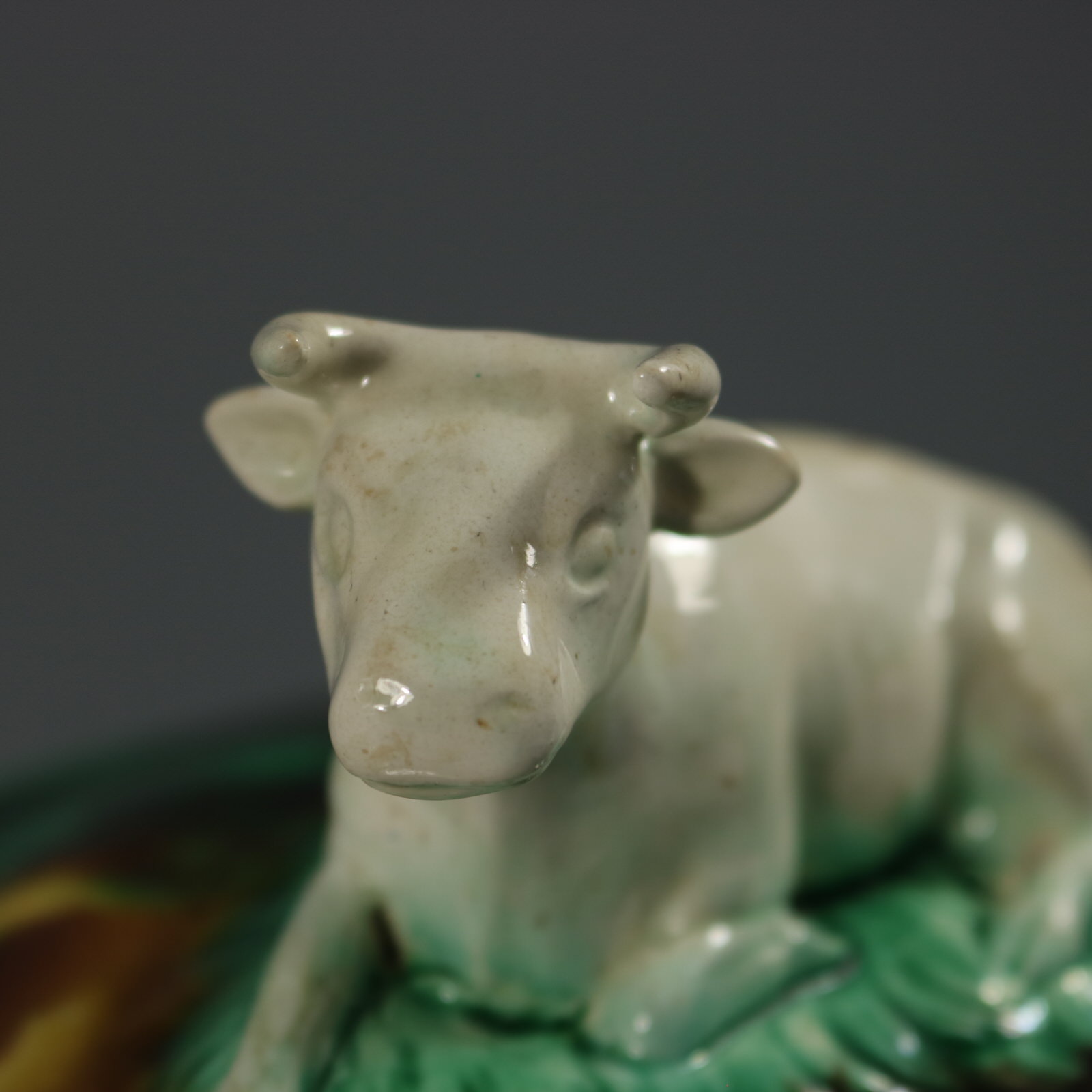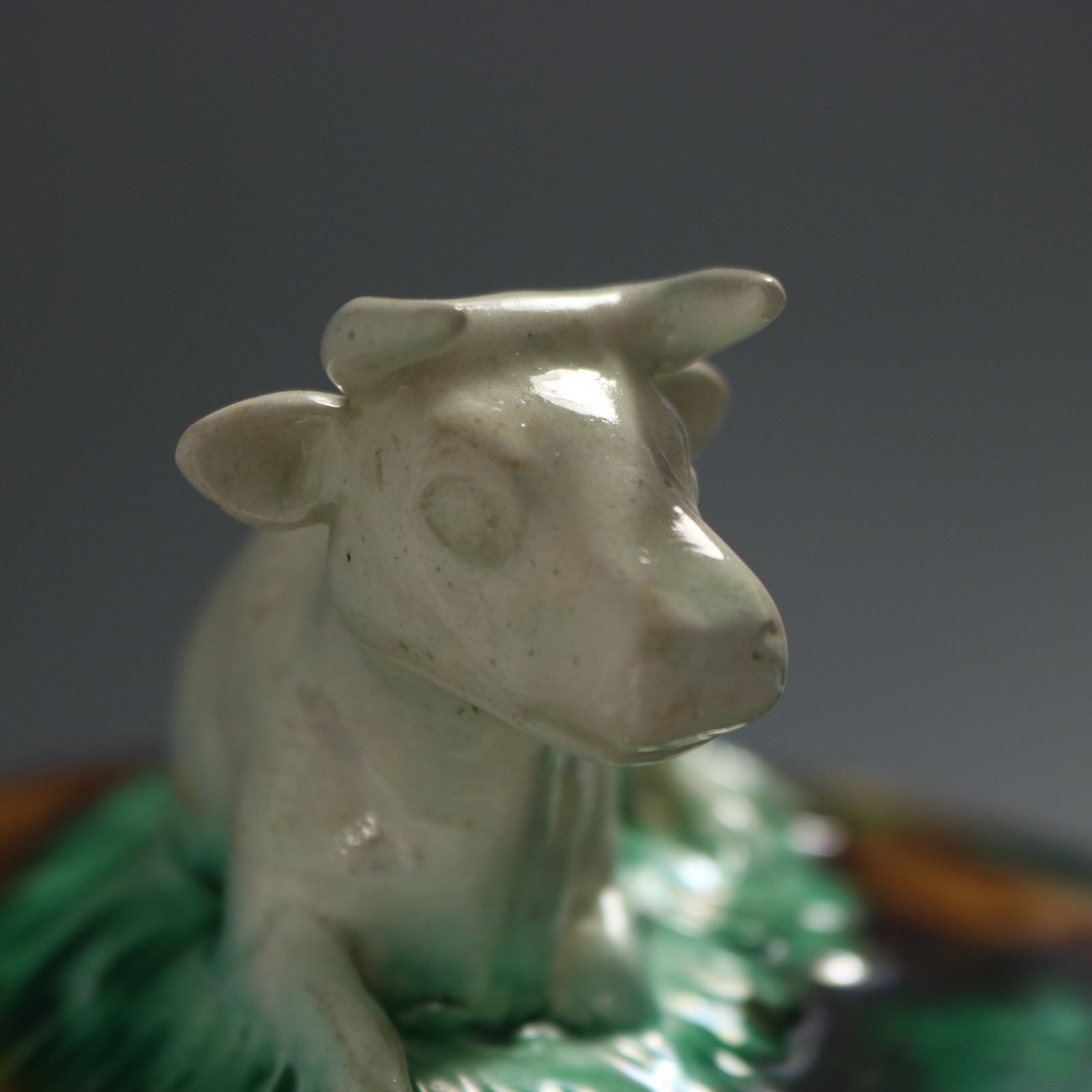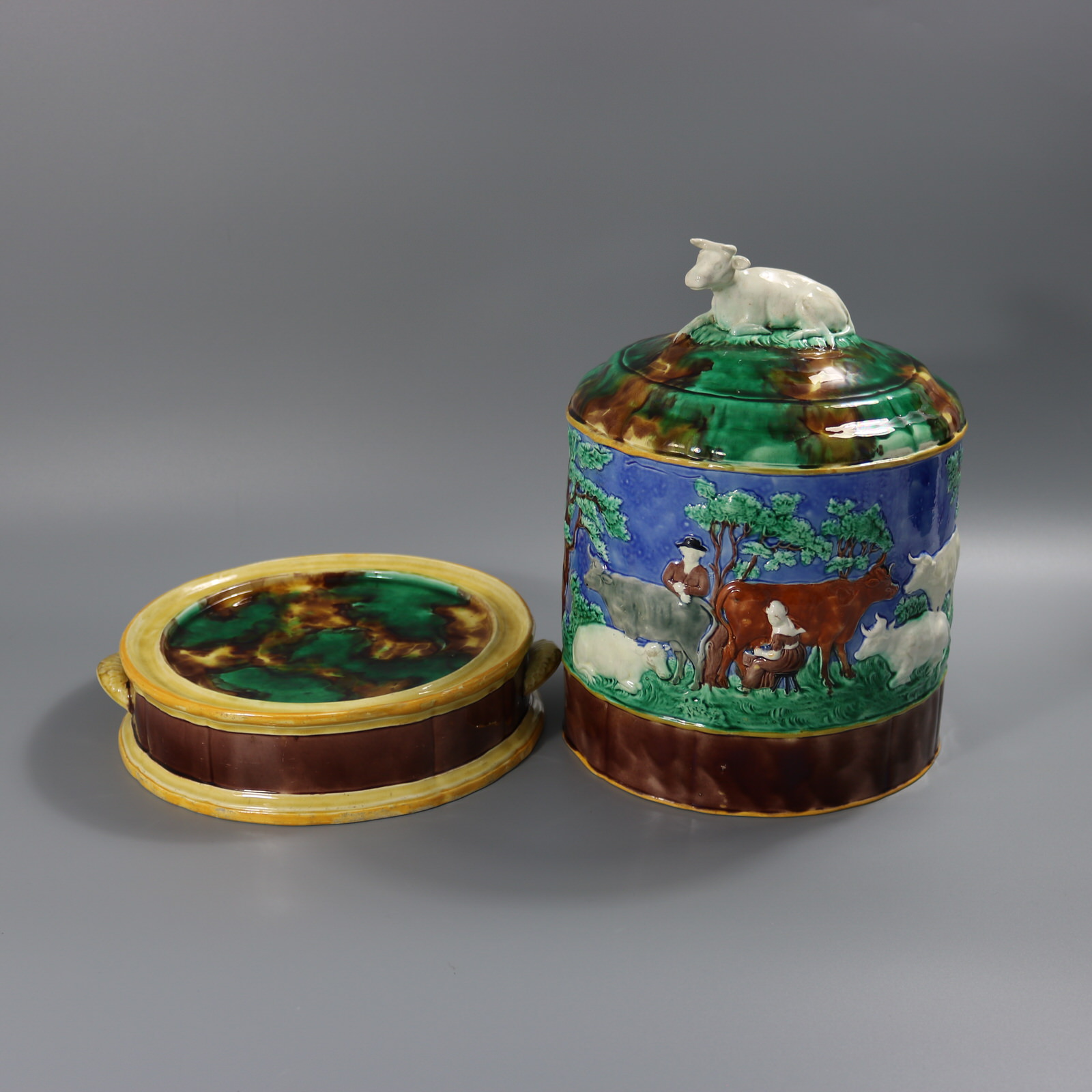 Victorian, circa 1872. 13.6ins high, 10.6ins wide, 9.9ins depth. Wedgwood Majolica cheese keep which features a country scene around the outside, depicting cows, farmers and a maid milking.