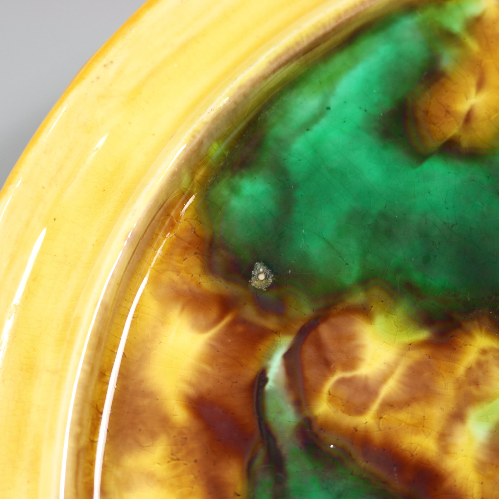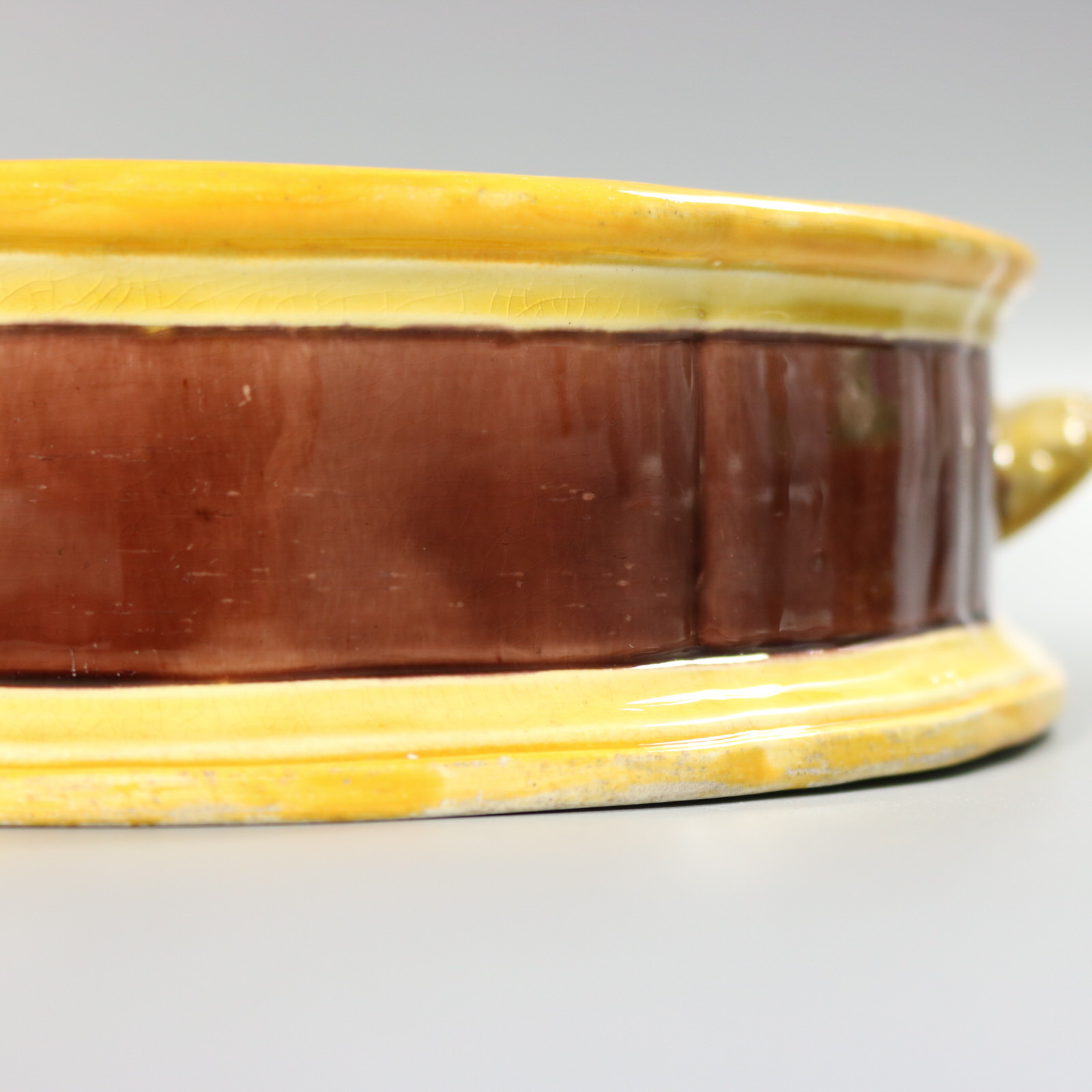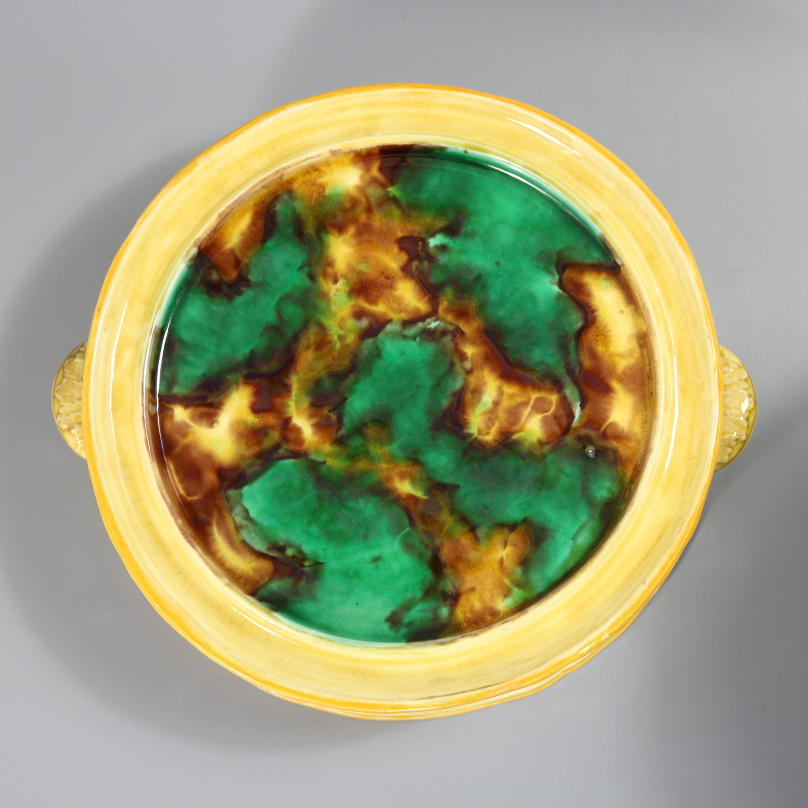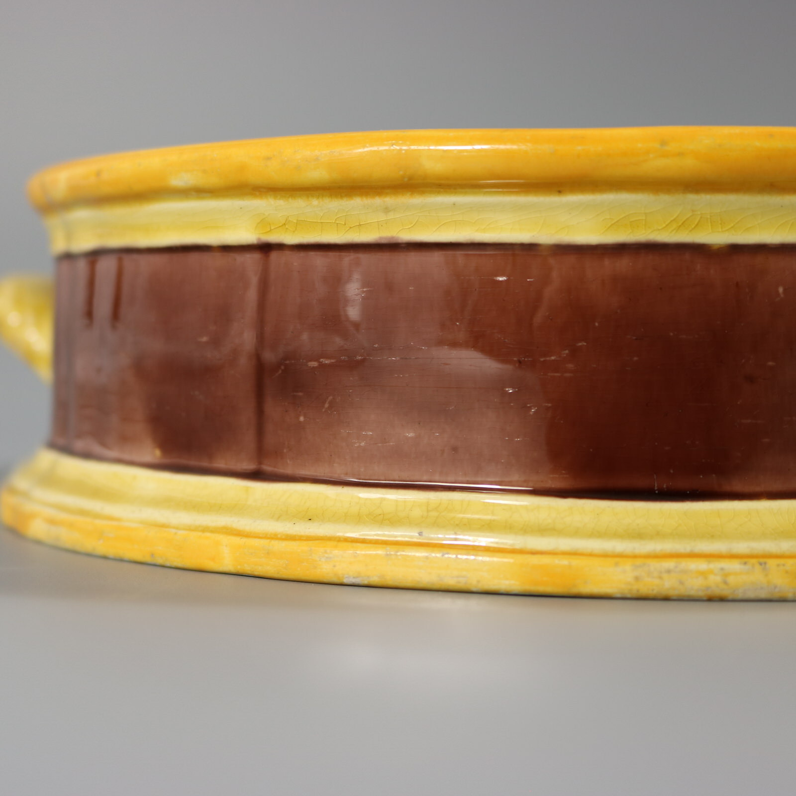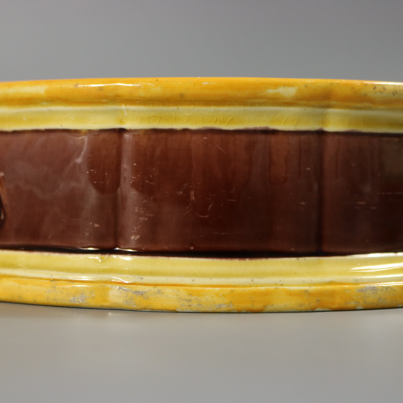 Victorian, circa 1872. 13.6ins high, 10.6ins wide, 9.9ins depth. Wedgwood Majolica cheese keep which features a country scene around the outside, depicting cows, farmers and a maid milking.