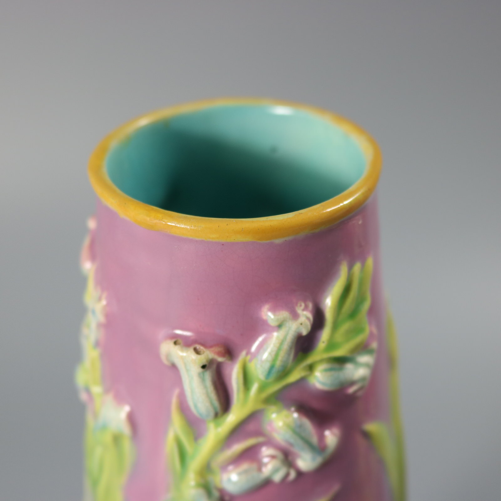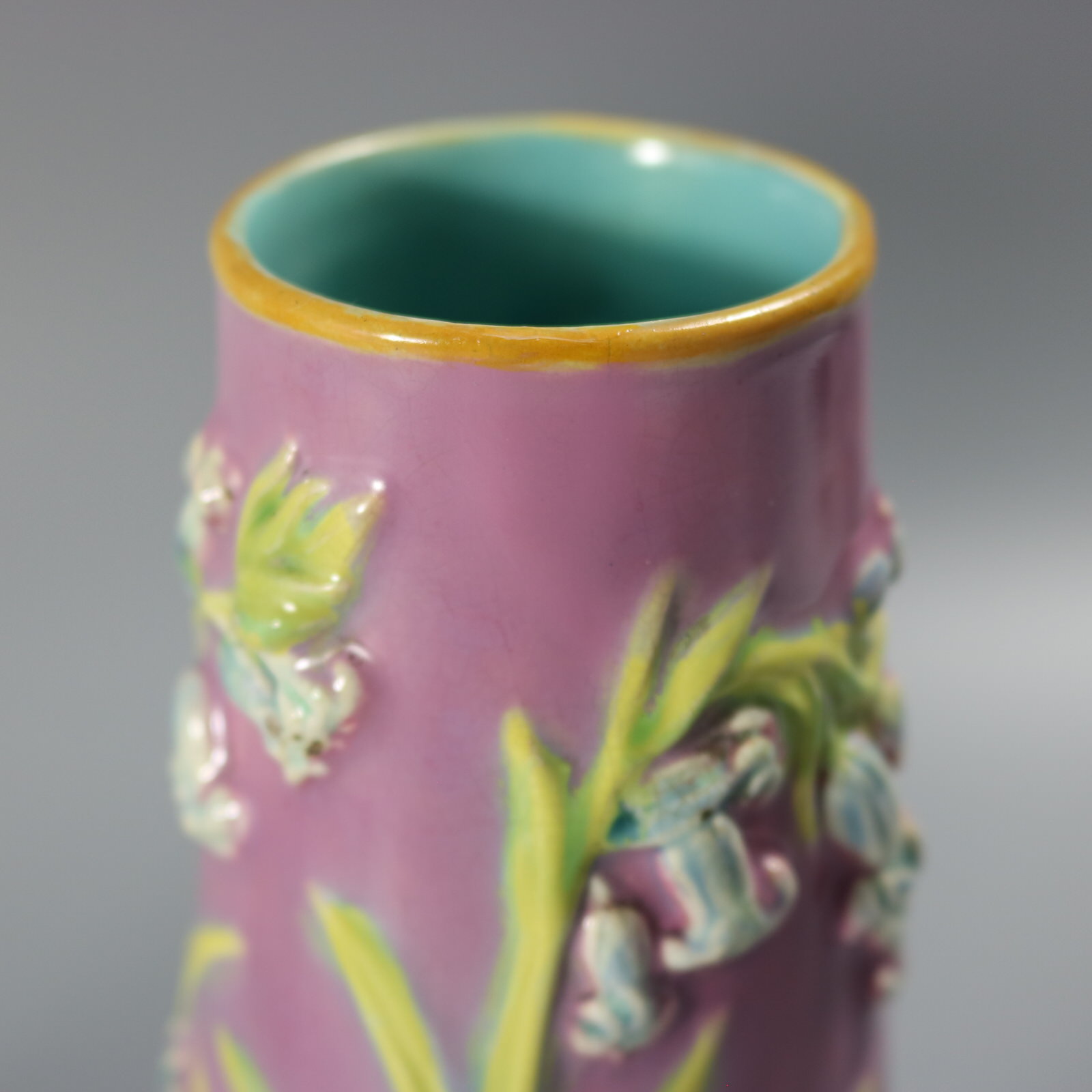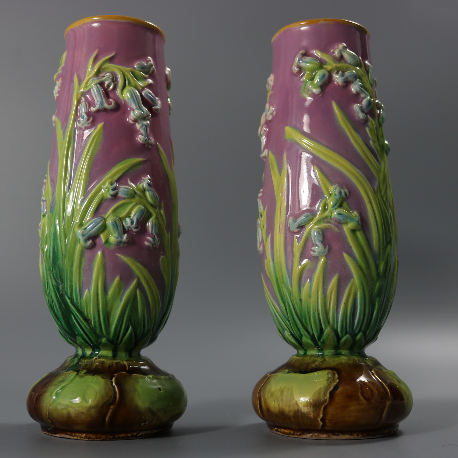 Victorian, circa 1872. Tallest is 8.4ins high, 3.2ins wide, 3.2ins depth. Pair of George Jones Majolica vases which feature bluebells around the sides, rising up from the bulbous foot.