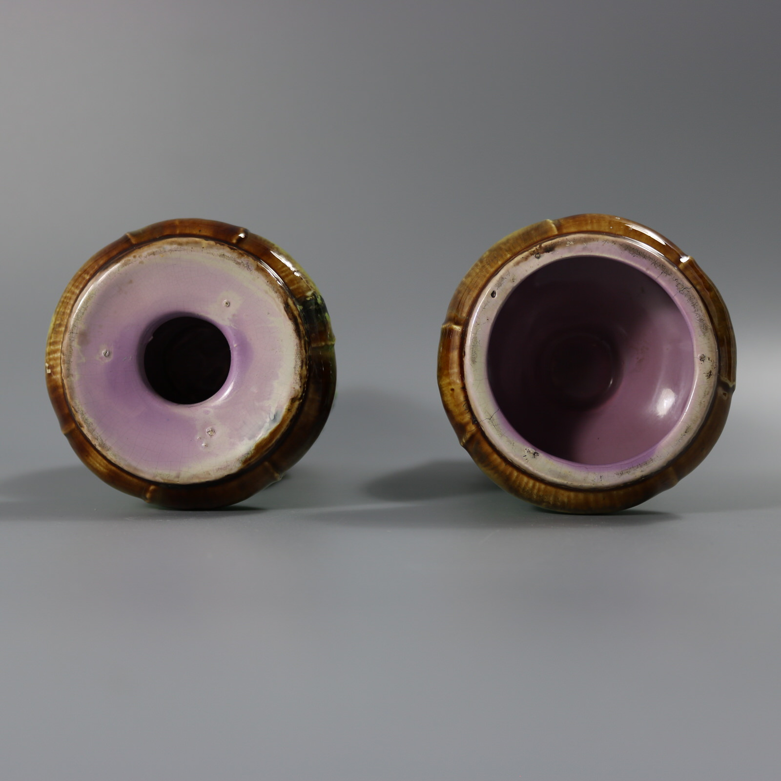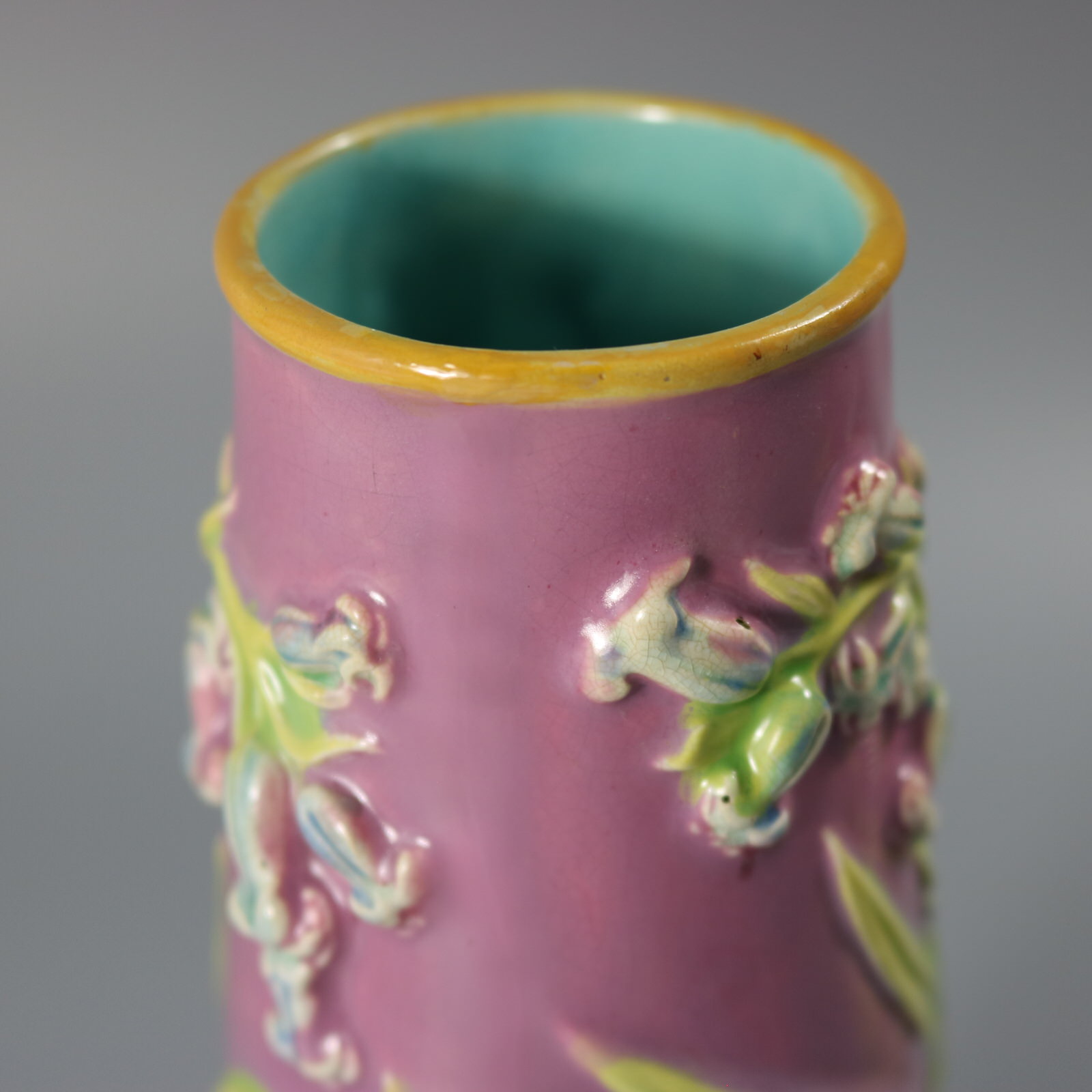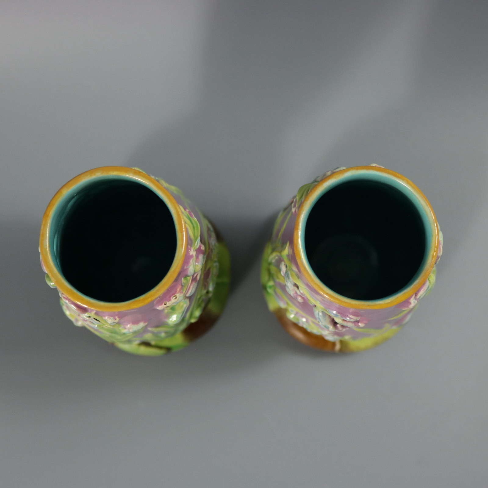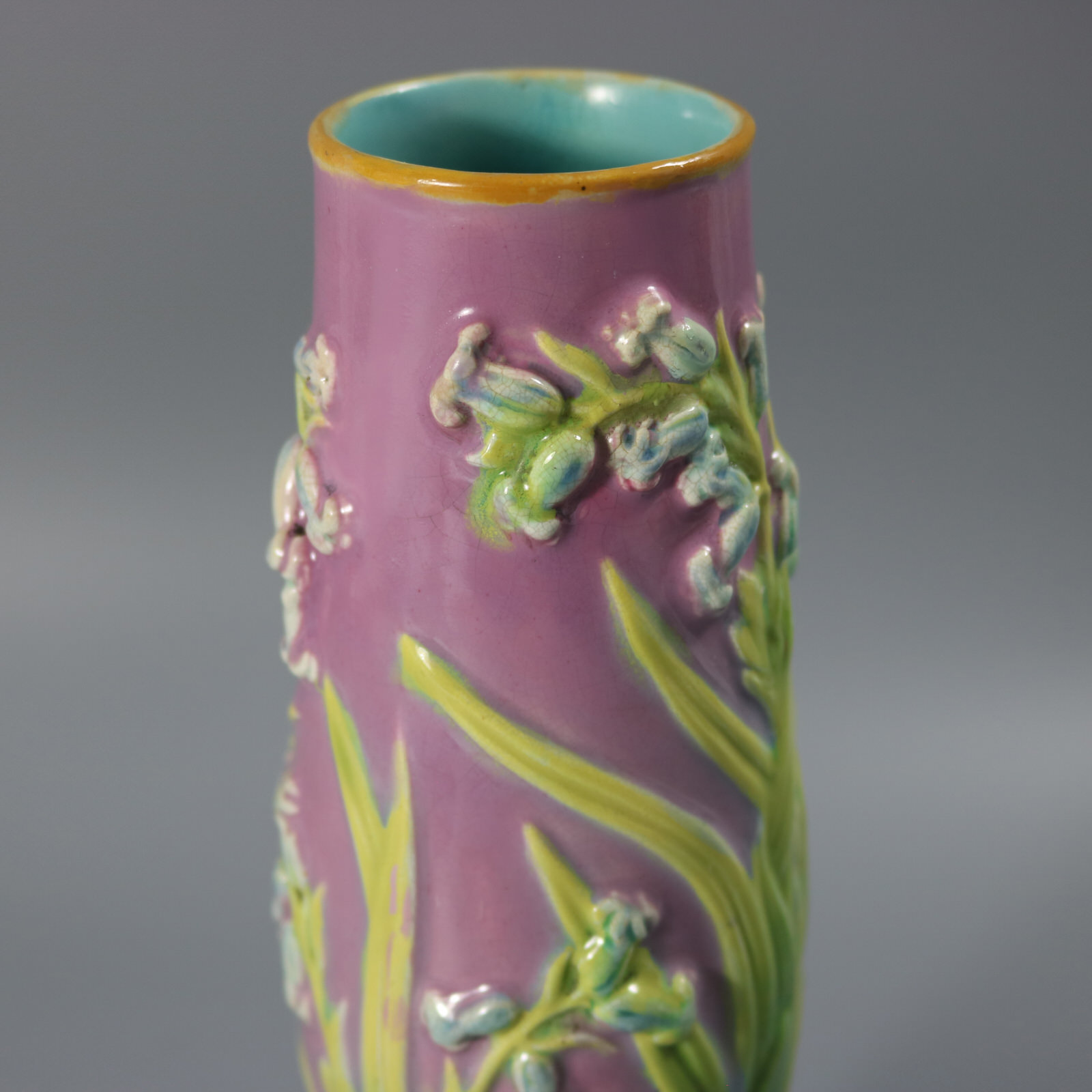 Victorian, circa 1872. Tallest is 8.4ins high, 3.2ins wide, 3.2ins depth. Pair of George Jones Majolica vases which feature bluebells around the sides, rising up from the bulbous foot.